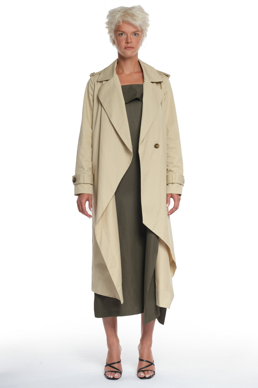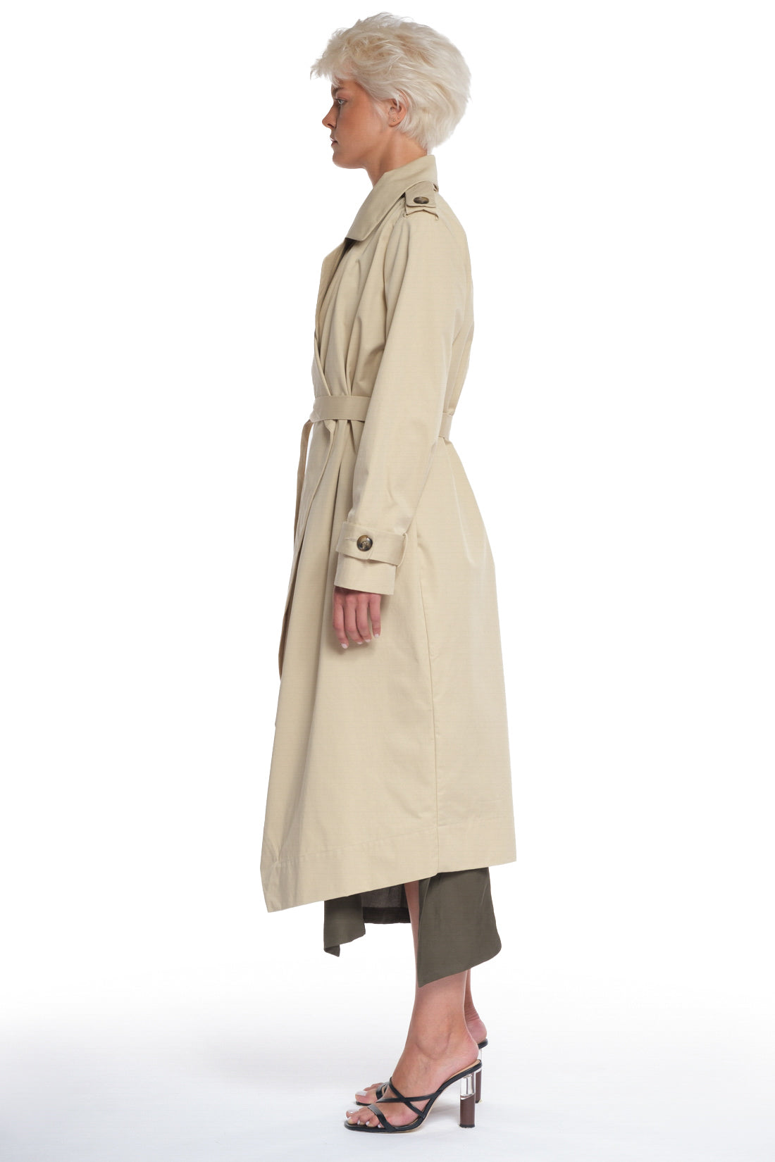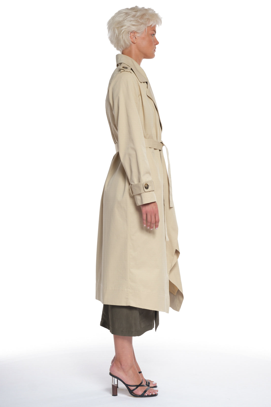 Waterproof asymmetric trench coat, with two sides pocket and the belt