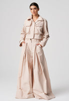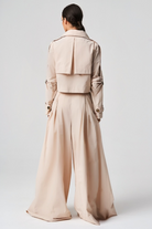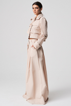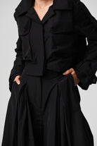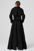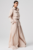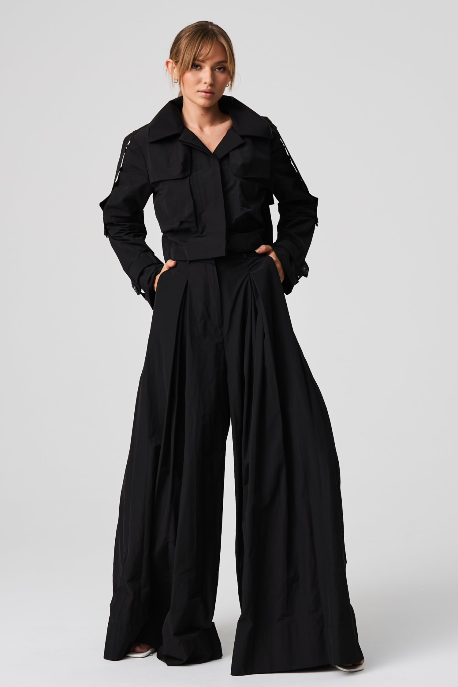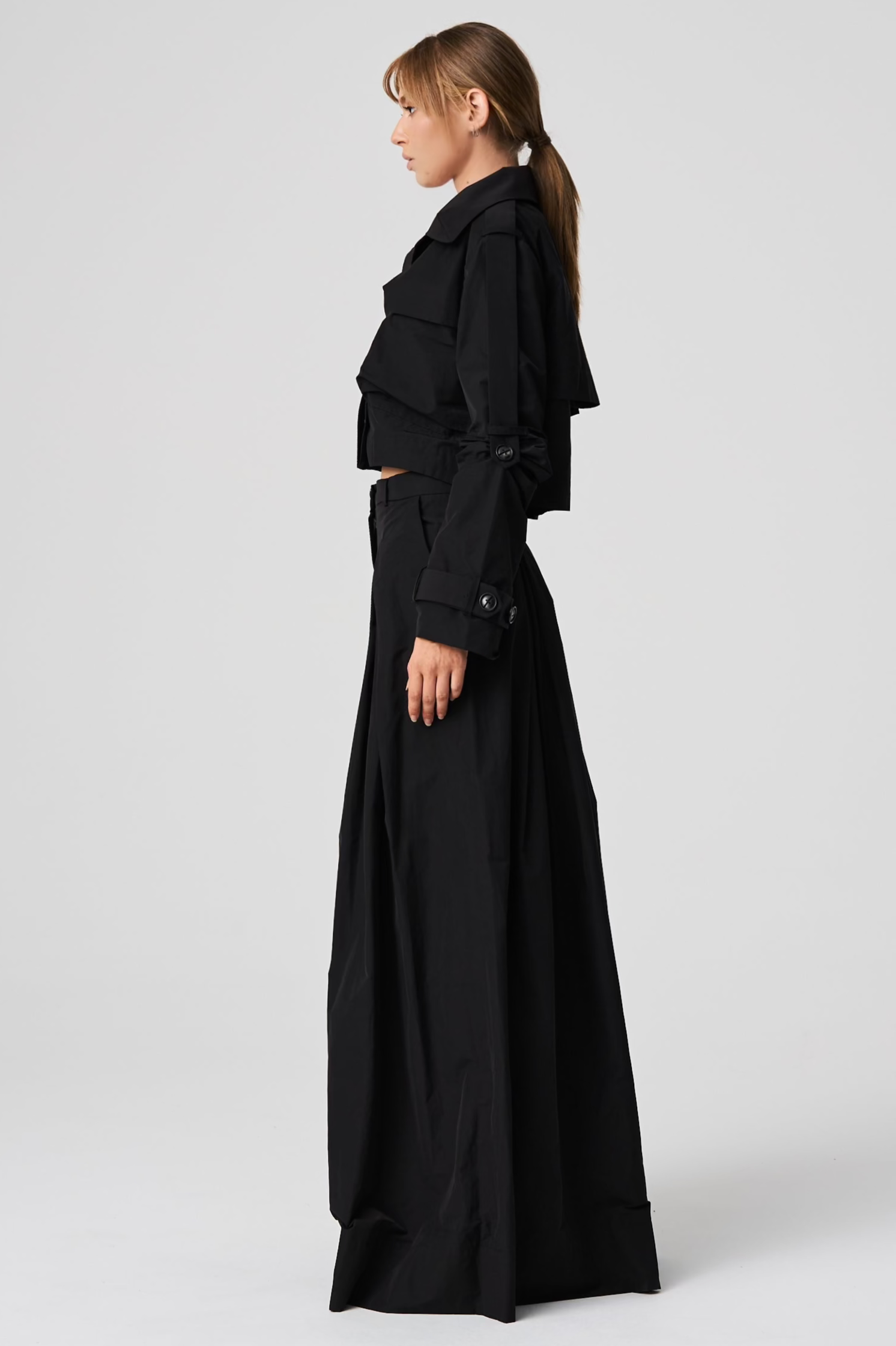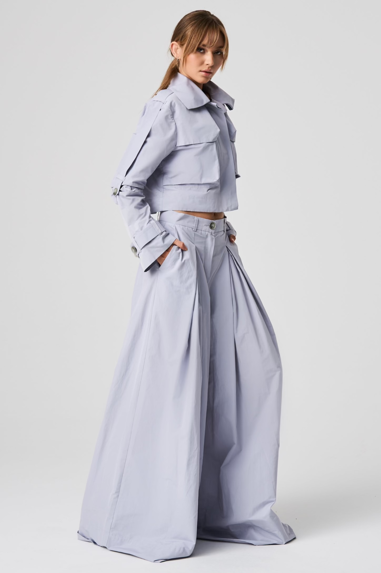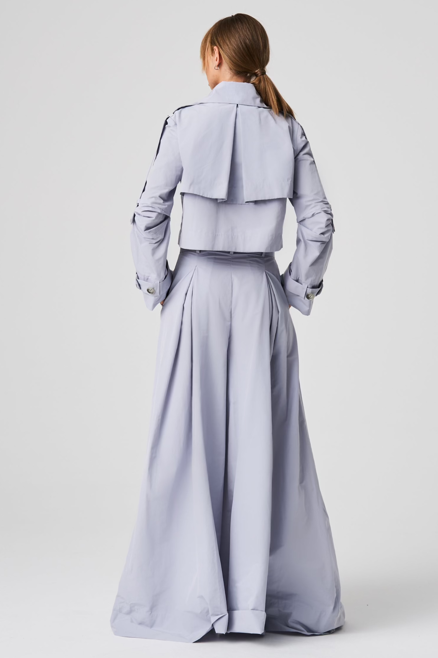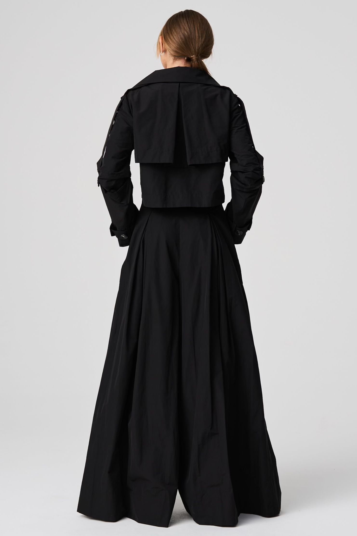Short slim-fit waterproof jacket. The front features two large bag pockets. The extra-long sleeves are adjustable with a strap from the shoulder to the elbow, secured with a button, and there’s a double-button strap at the wrist. The back is adorned with a double panel featuring a bilateral pleat. This piece pairs well with the ALBA trousers.