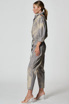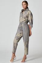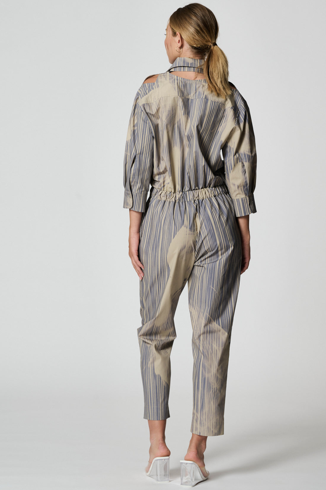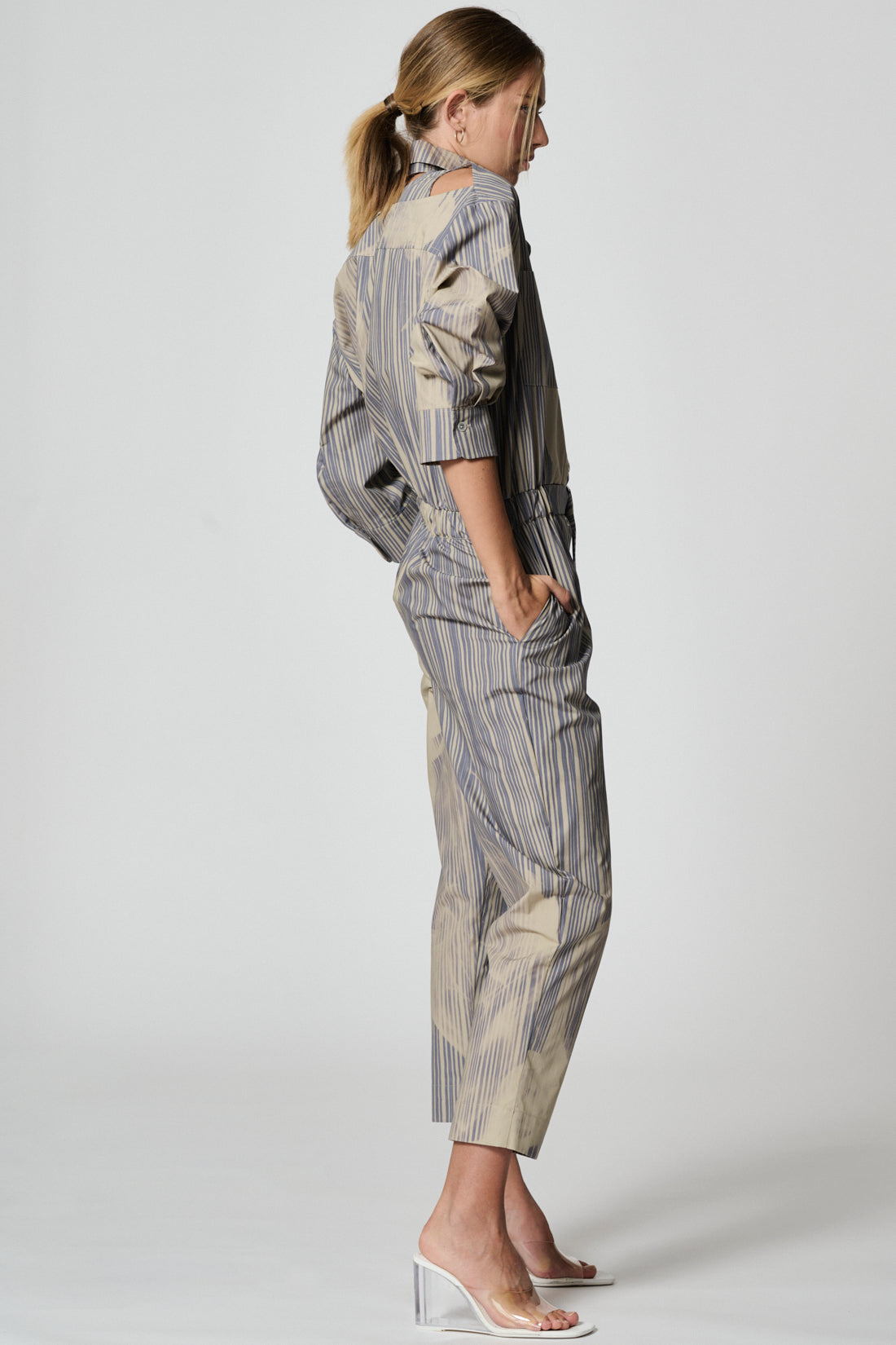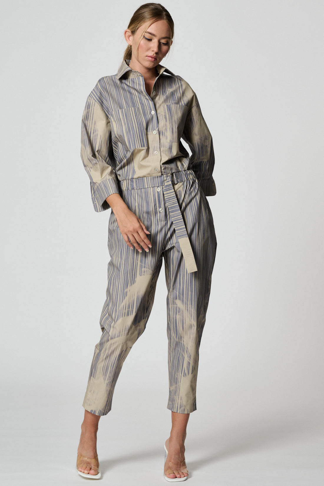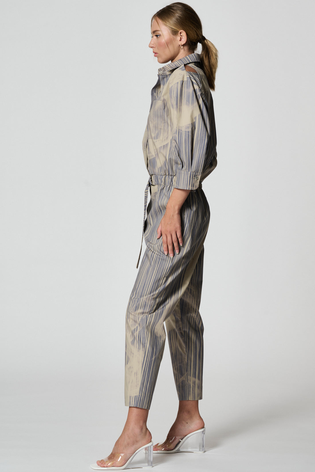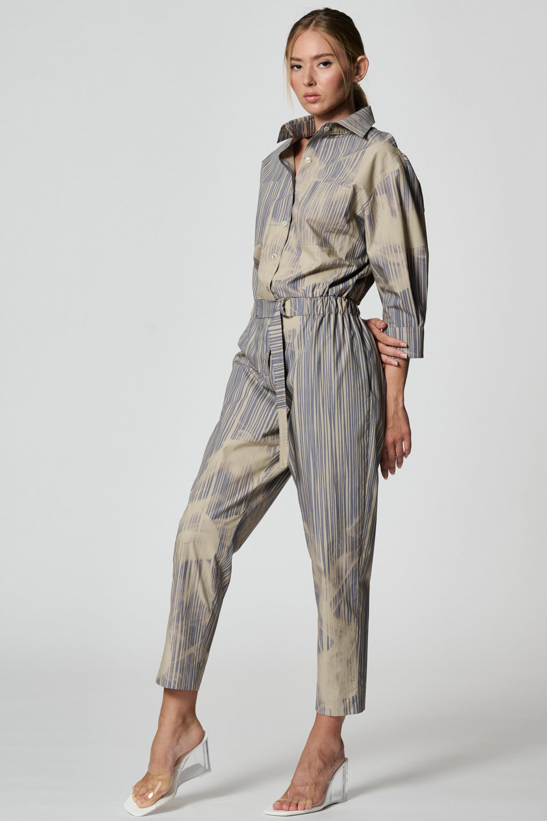Long relaxed-fit jumpsuit with elasticated waist band and fabric belt. Front buttoning, regular collar. Three-quorter sleeves with regular cuffs, side seam pockets and two classic front pockets.