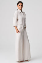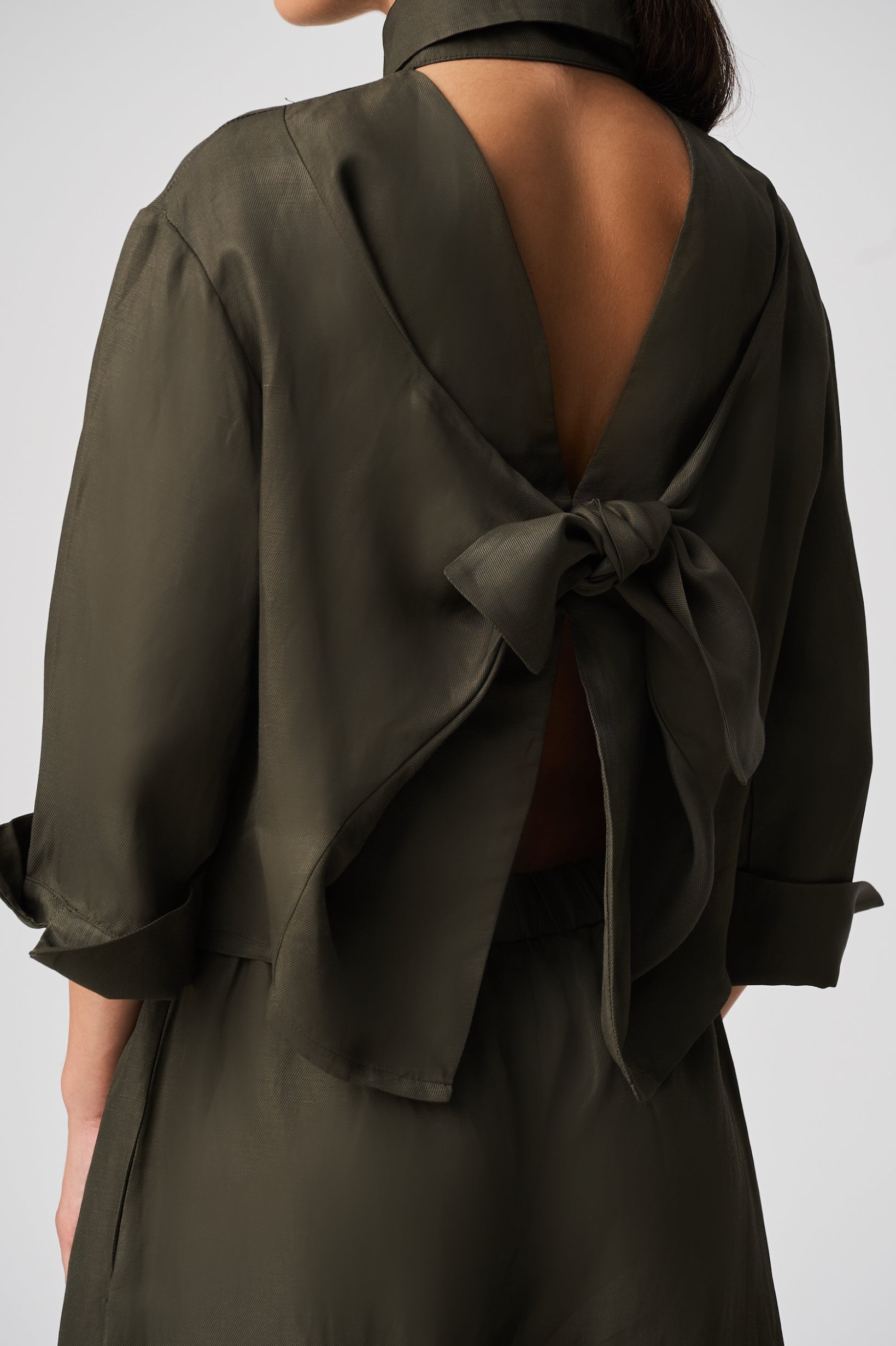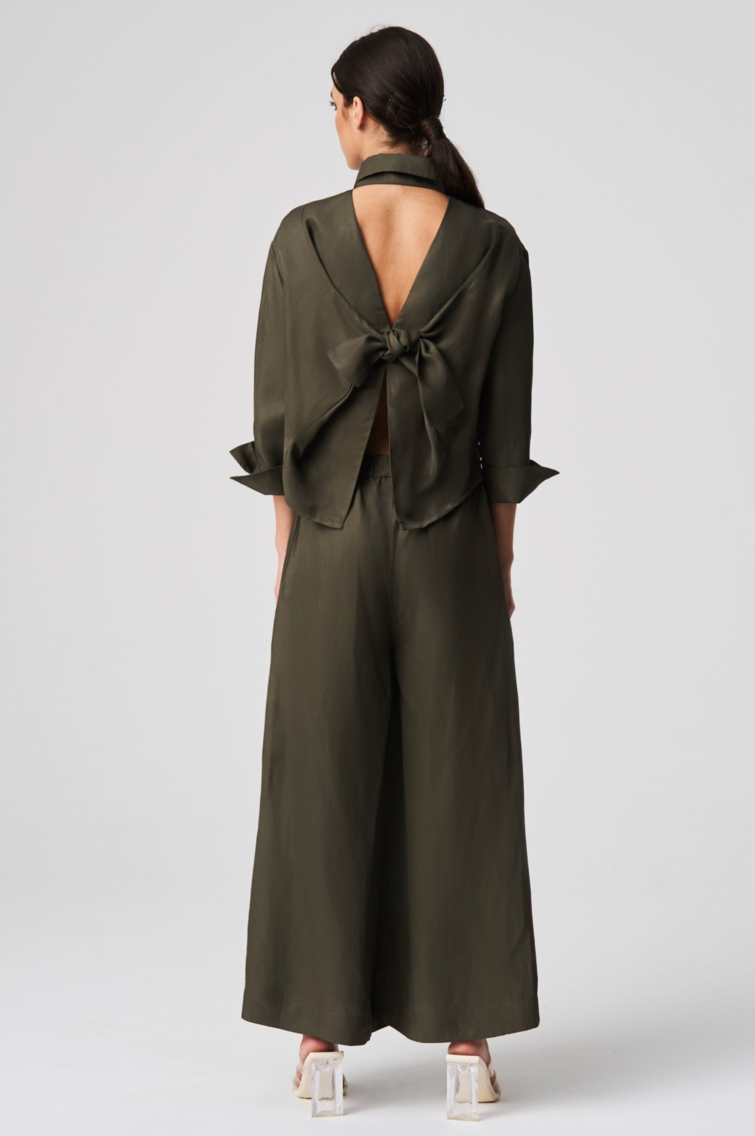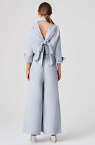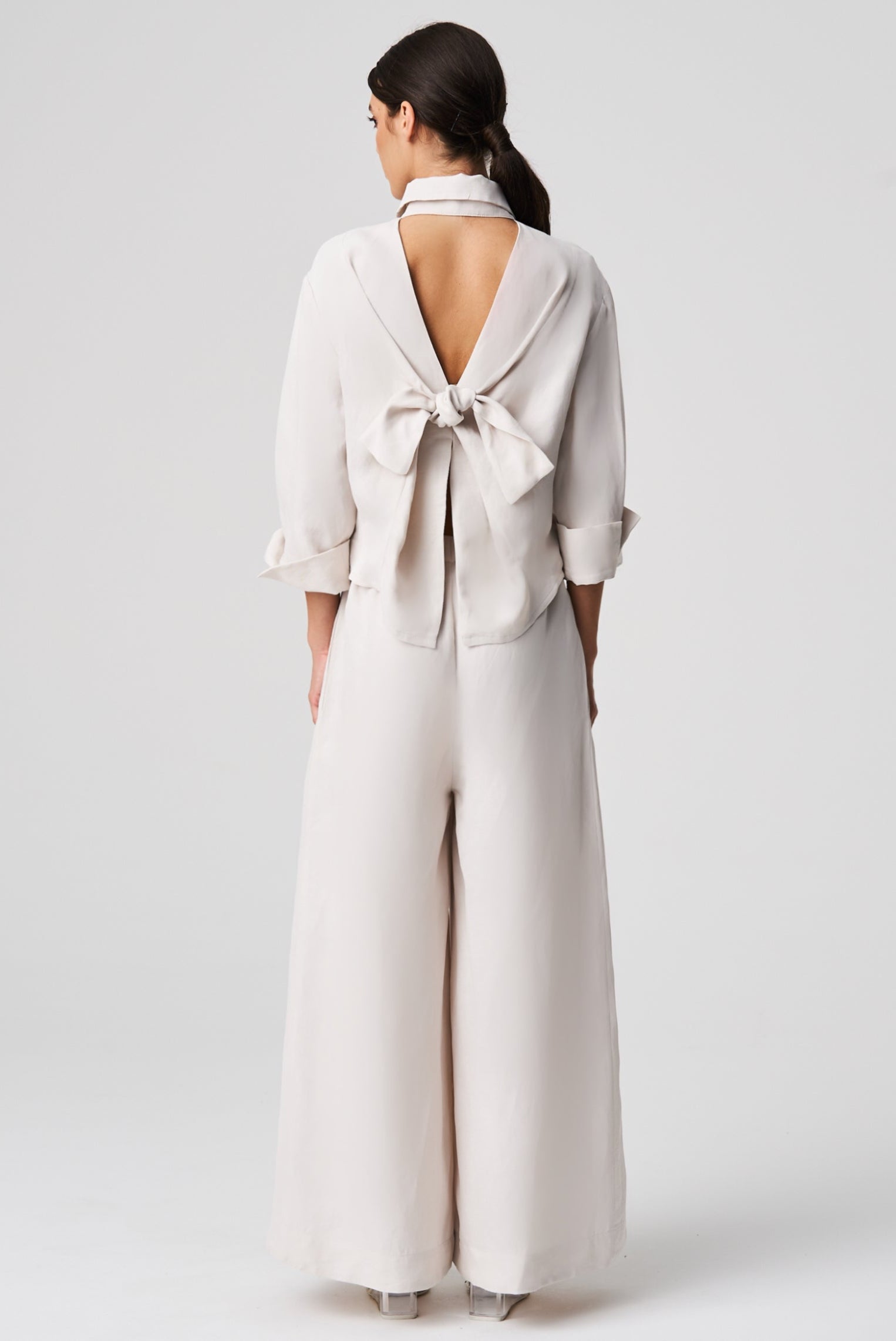Jumpsuit with three-quarter sleeves, flared legs, and a fabric belt at the waist. This garment has a clean and simple look at the front, while the back is rich in details. The top part is separated from the bottom. The two sides at shoulder height are joined by a central bow, leaving a wide opening at the shoulders and a cut at the back.