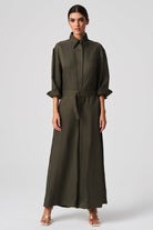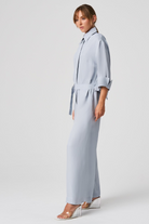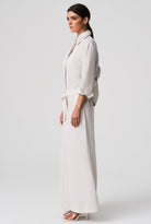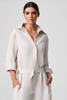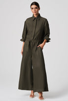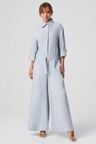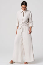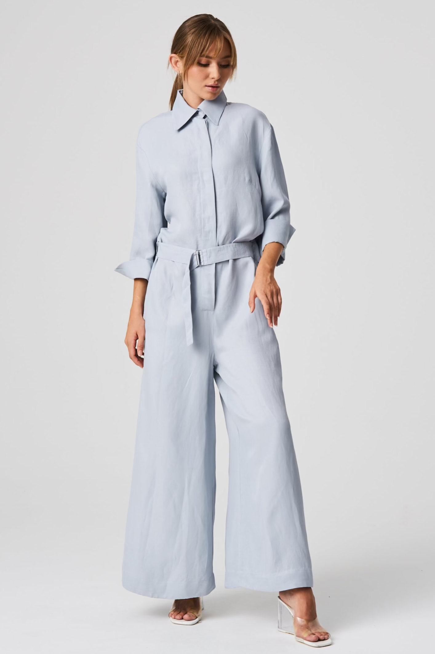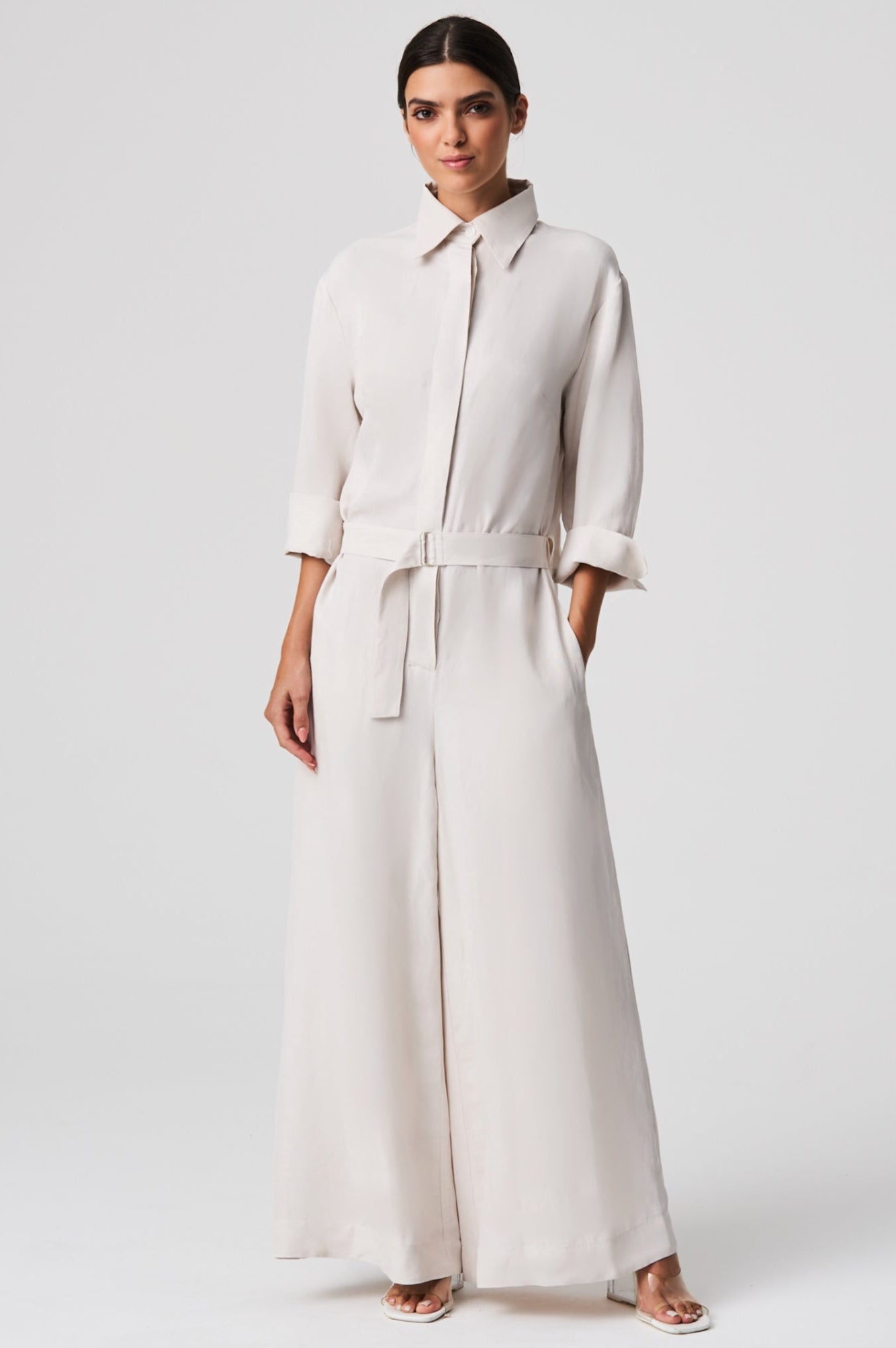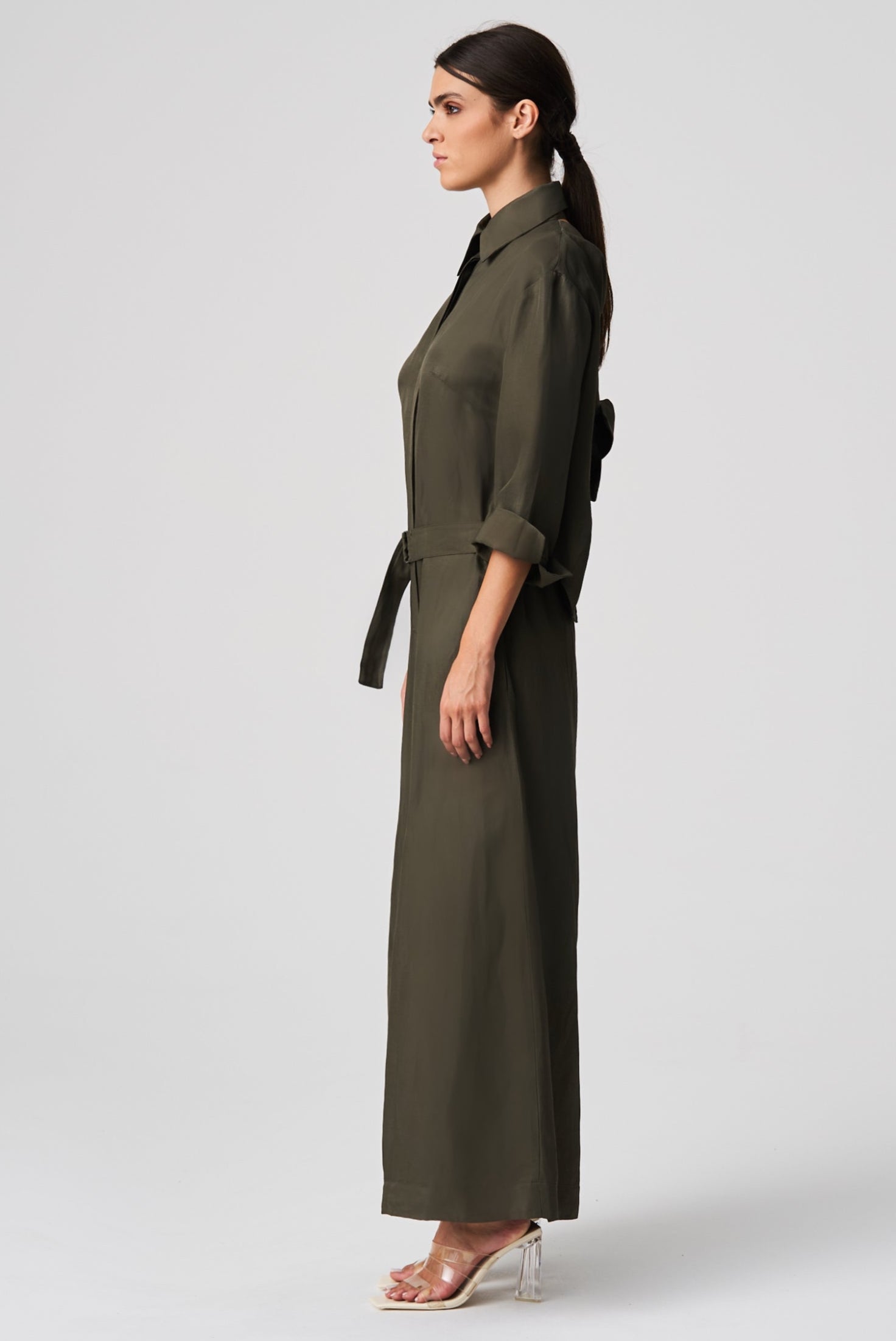 Jumpsuit with three-quarter sleeves, flared legs, and a fabric belt at the waist. This garment has a clean and simple look at the front, while the back is rich in details. The top part is separated from the bottom. The two sides at shoulder height are joined by a central bow, leaving a wide opening at the shoulders and a cut at the back.