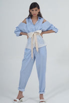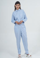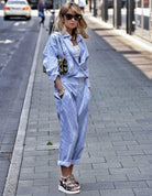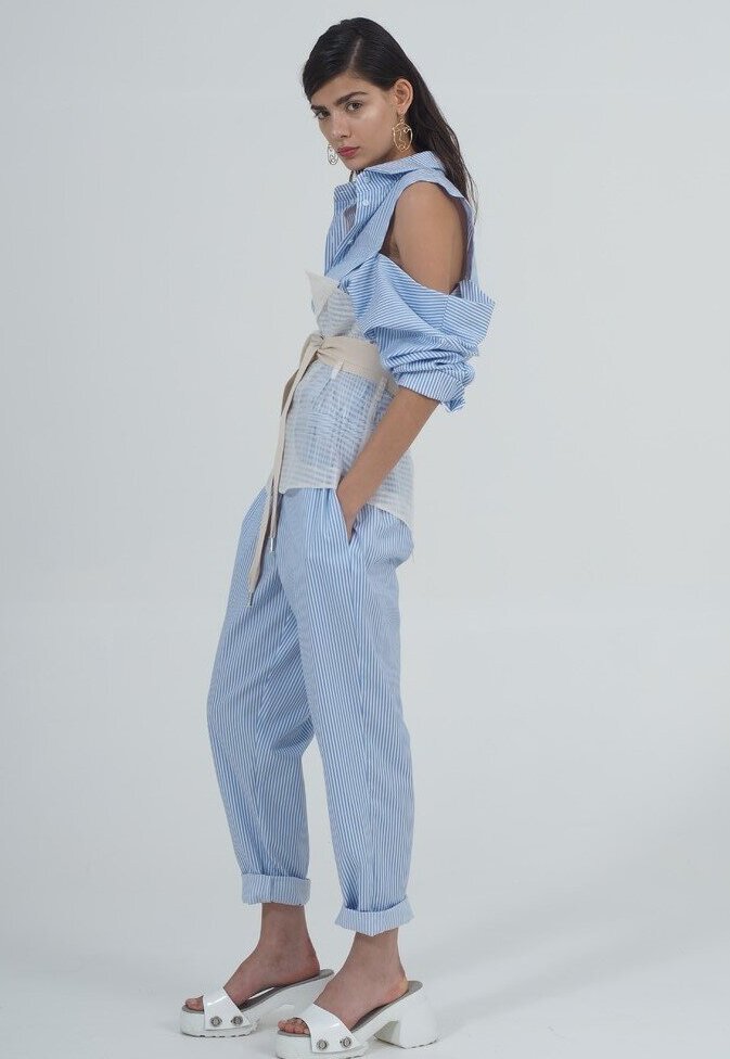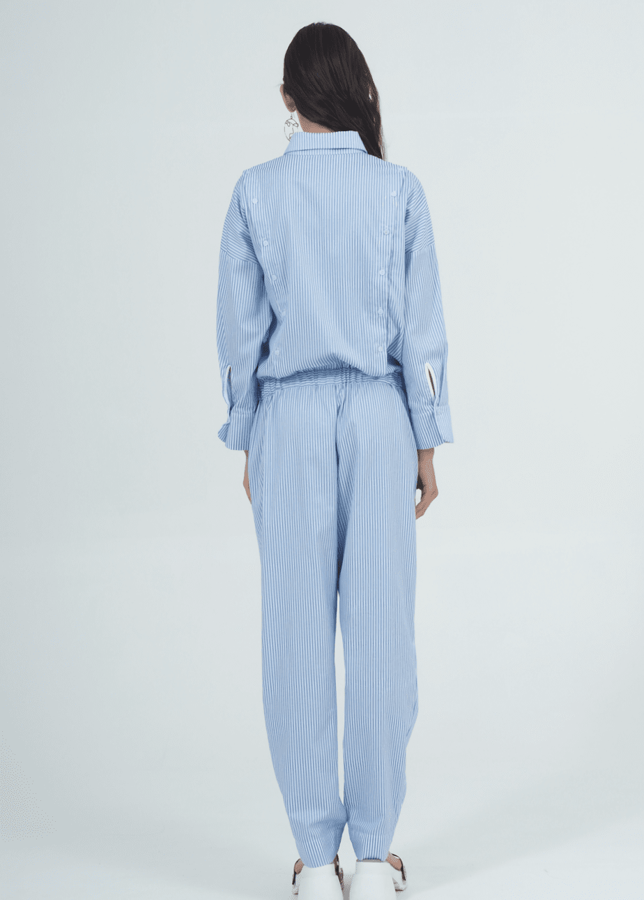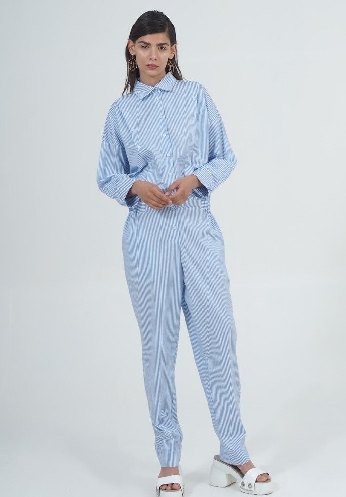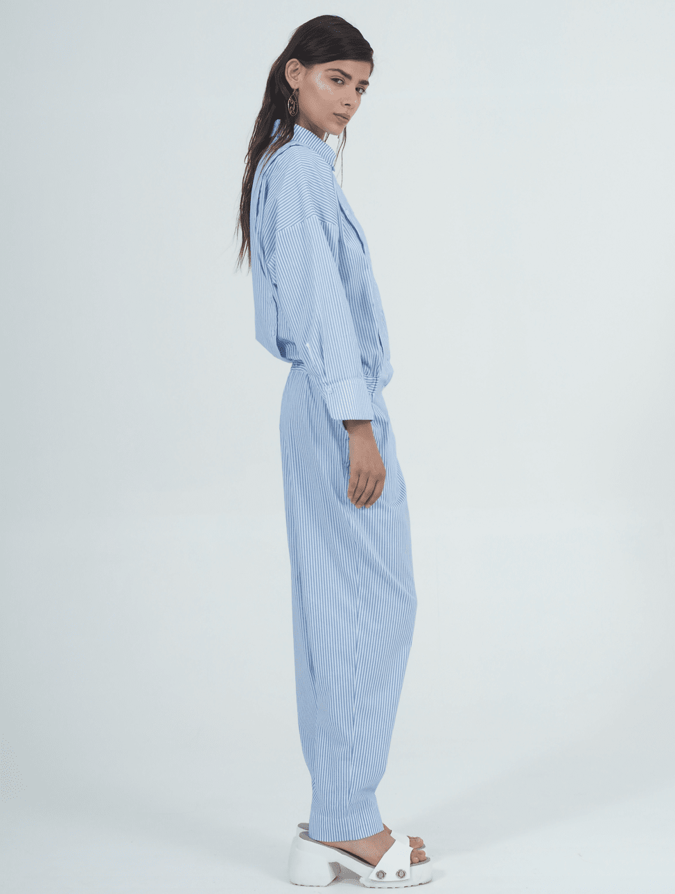 STRIPPED COTTON POPLIN JUMPSUIT WITH LONG SLEEVES AND TWO ADDICTIONAL BUTTON PLACKETS WHICH RUN FROM THE FRONT TO THE BACK AND REVEAL THE SHOULDERS.