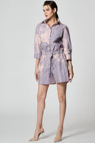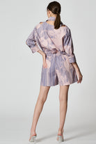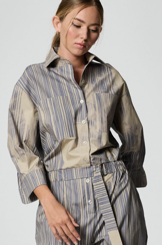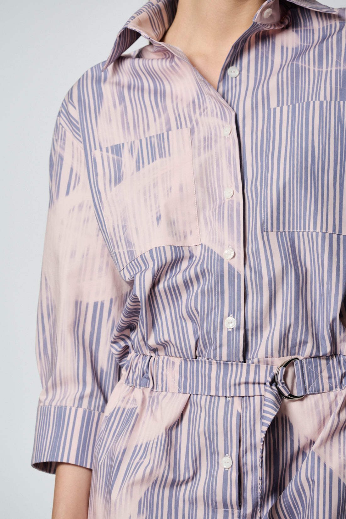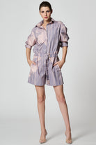 Short relaxed-fit jumpsuit with elasticated waist band and fabric belt. Front buttoning, regular collar. Three-quorter sleeves with regular cuffs, side seam pockets and two classic front pockets.