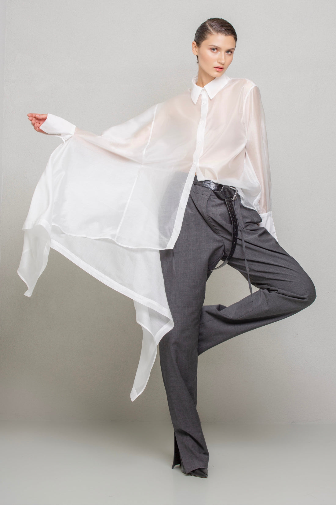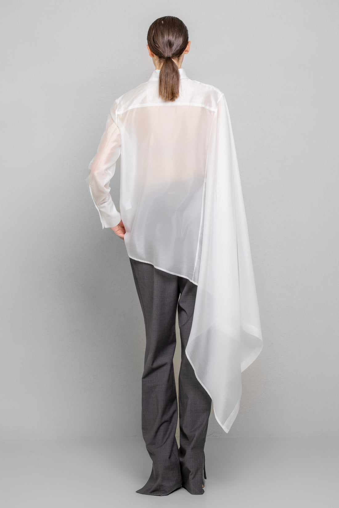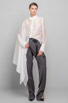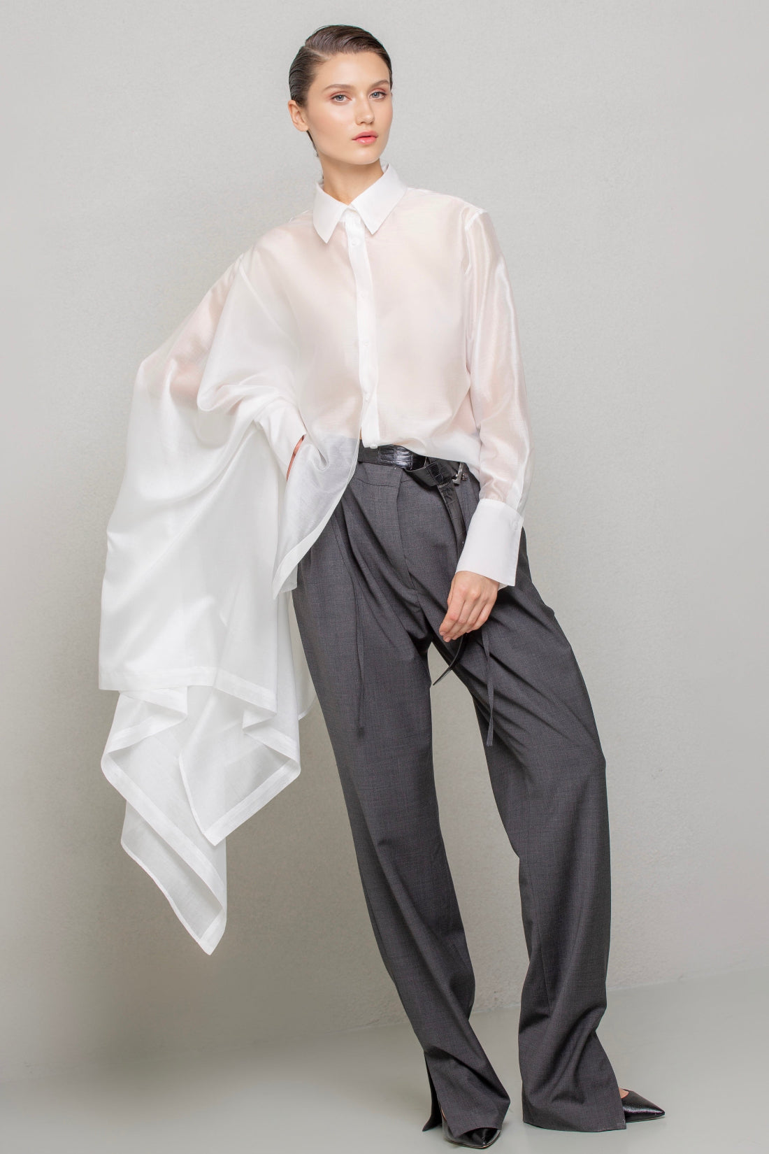 Asymmetrical-cut shirt made from a slightly glossy, sheer fabric, featuring a regular collar and cuffs. The left side of the shirt has a regular shape, while the right side is cut with an ample extension, creating a majestic and mysterious look.