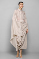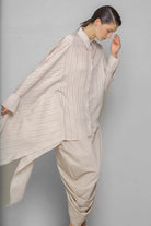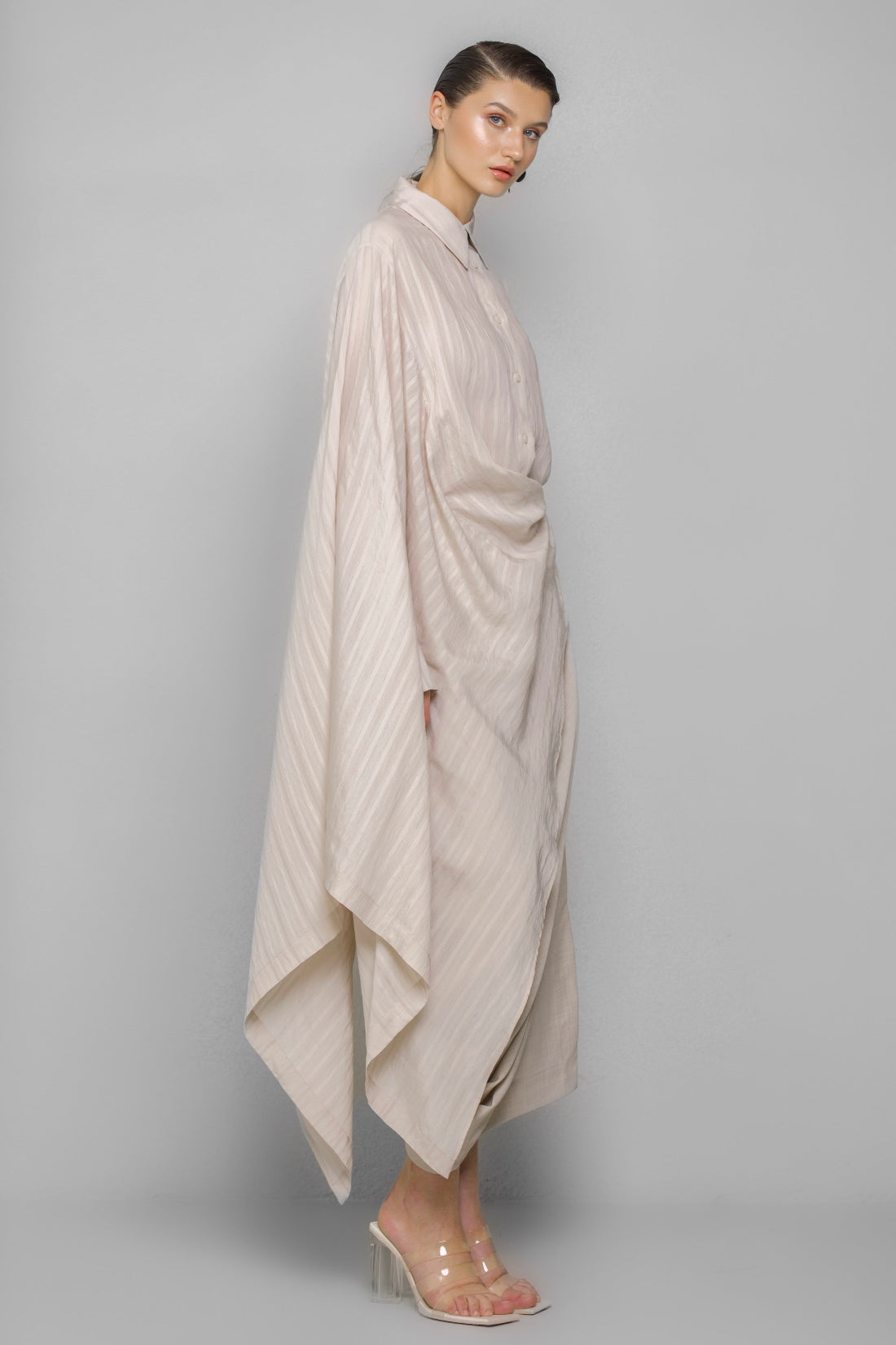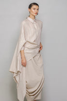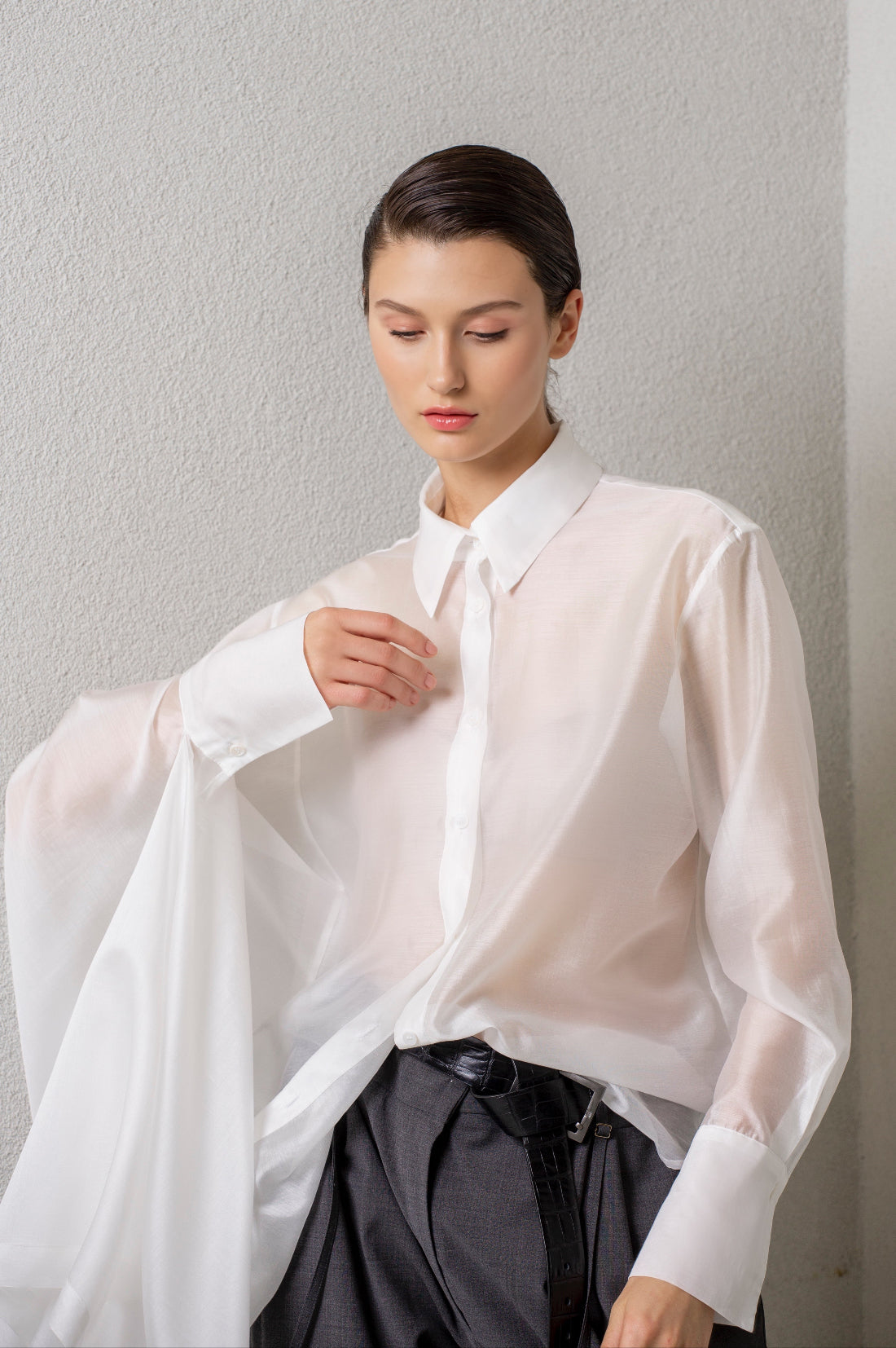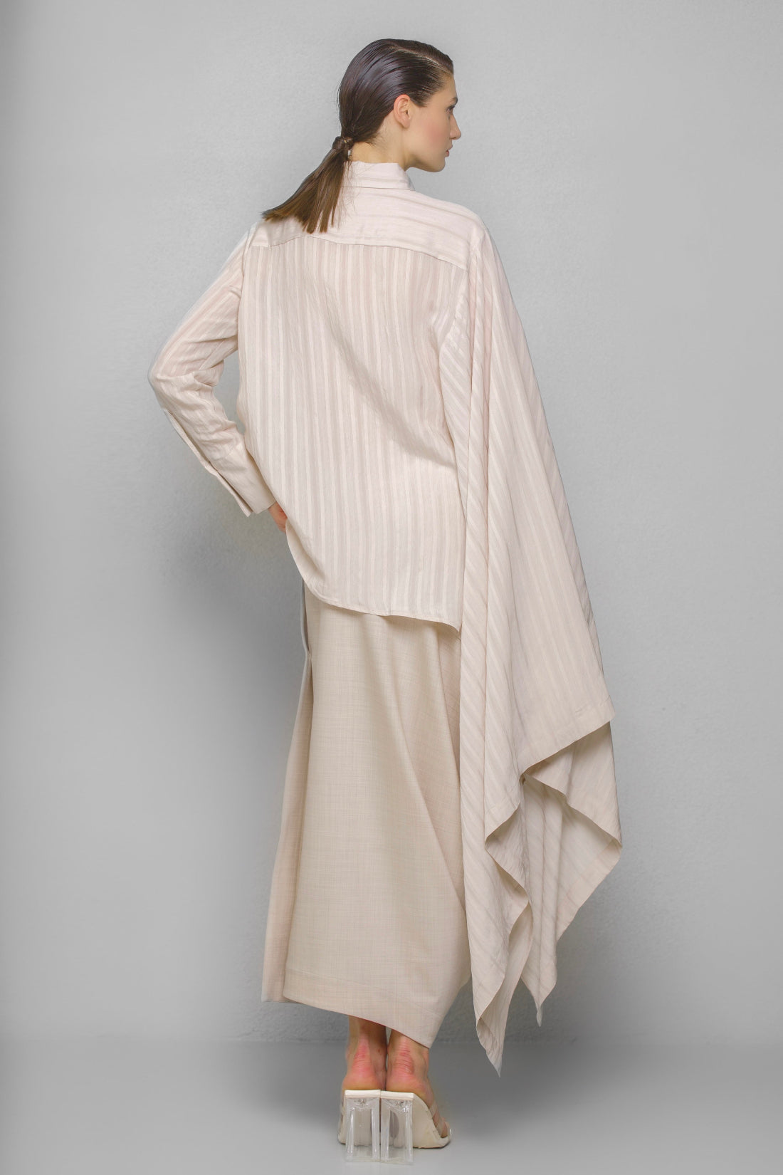 Asymmetrical-cut shirt made from a slightly glossy, sheer fabric, featuring a regular collar and cuffs. The left side of the shirt has a regular shape, while the right side is cut with an ample extension, creating a majestic and mysterious look.