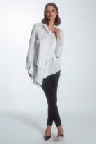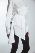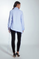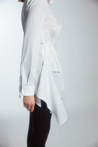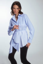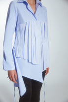 Slim-fit poplin shirt with an asymmetric hemline. Front button closure. The unique detail of this garment is a tone-on-tone pleated fabric insert at the waistline and an incorporated fabric belt to tie the front of the shirt.