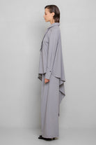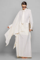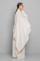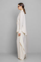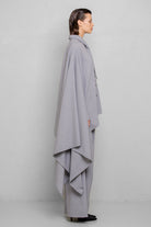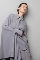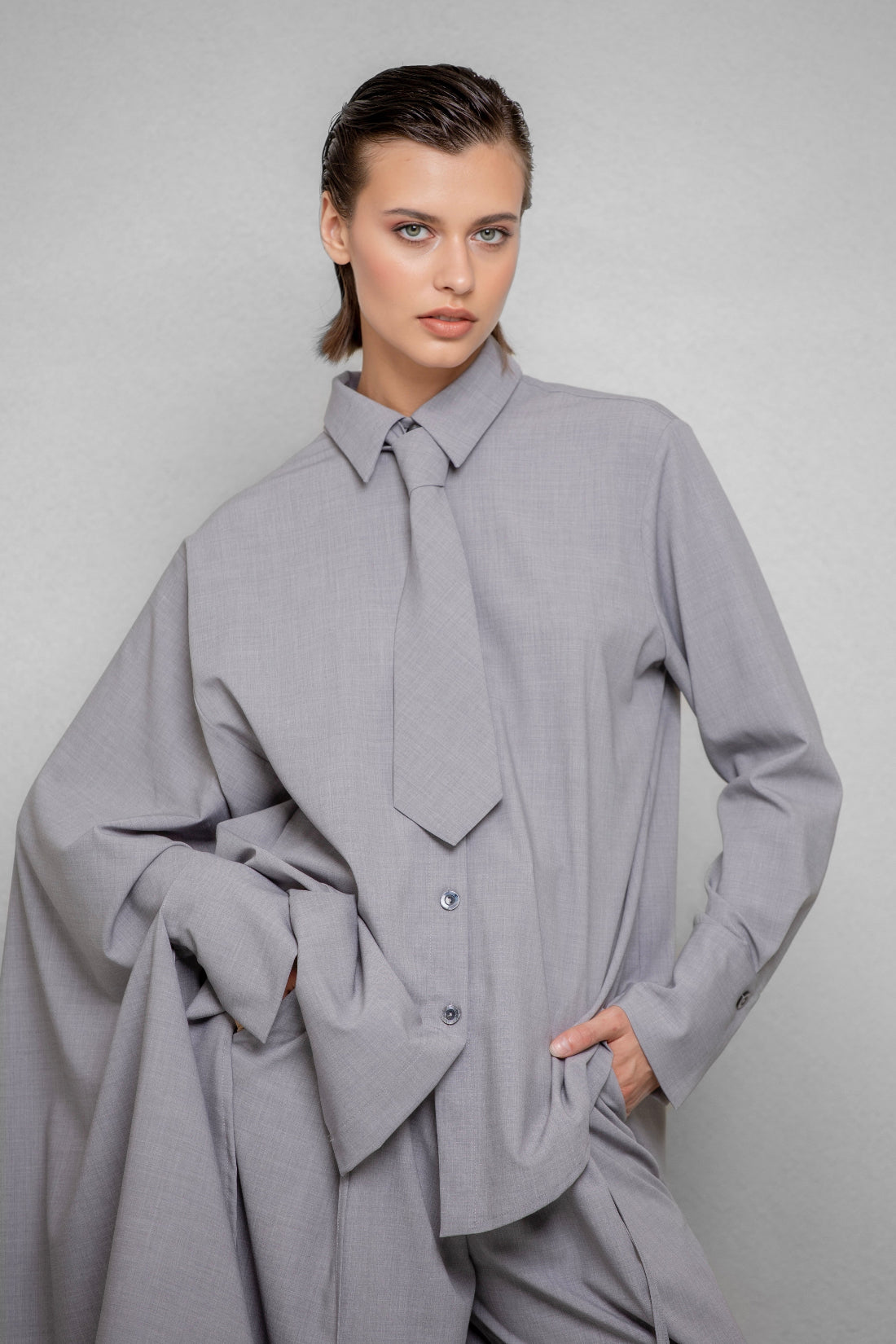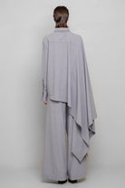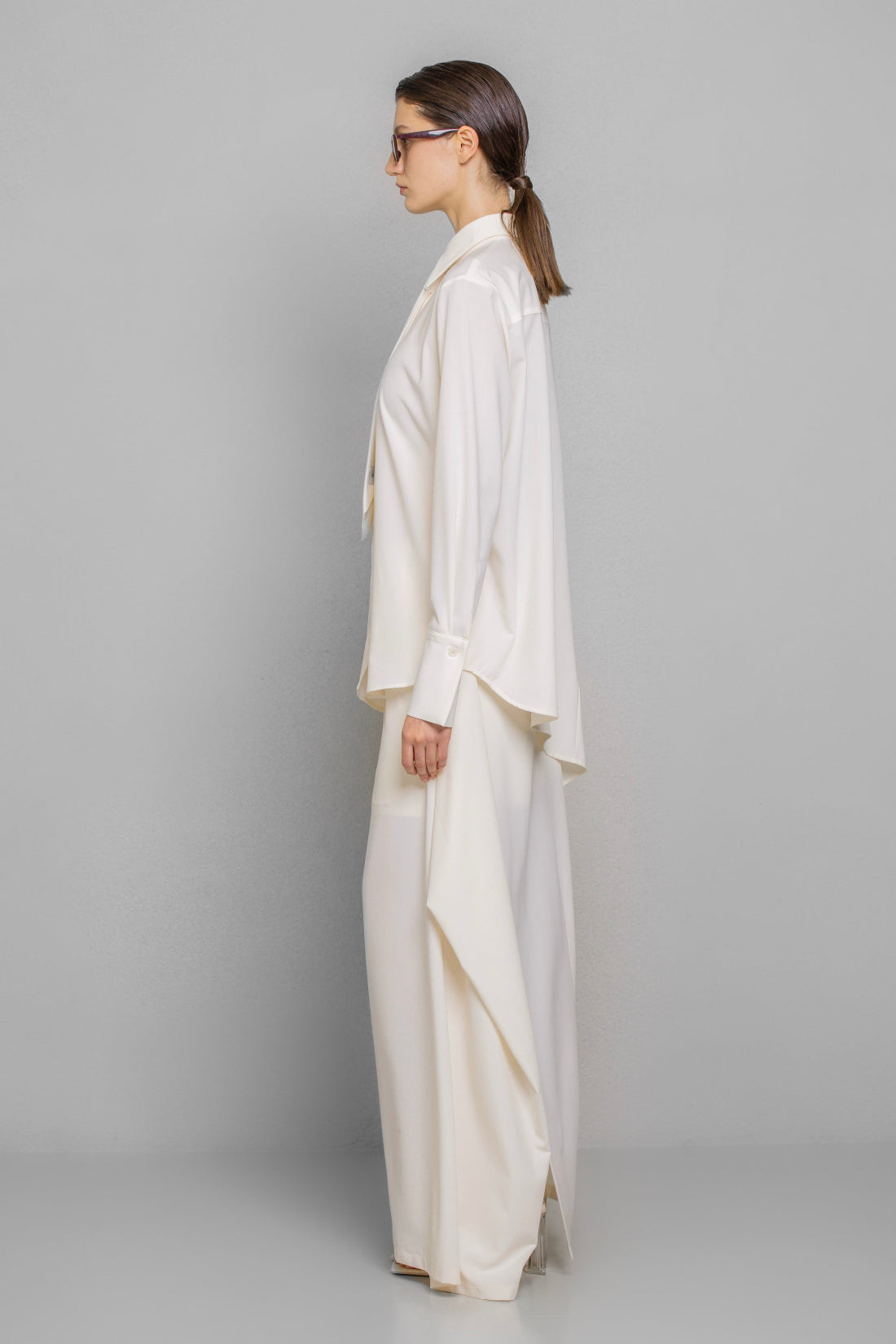 Asymmetrical-cut shirt with a regular collar and extra-large cuffs. The left side of the shirt has a regular shape, while the right side is cut with an ample extension, giving it a majestic and mysterious look.