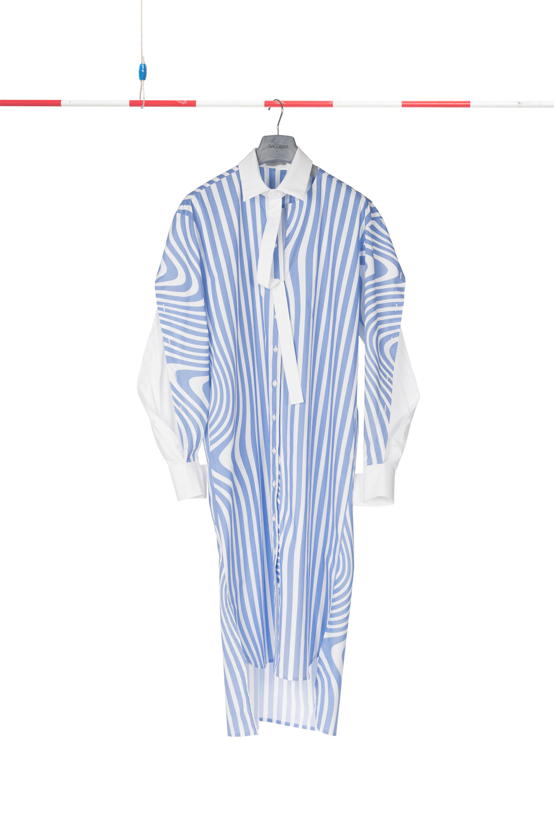 Printed long cotton shirt-dress with long sleeves cut and buttoned, two side pockets