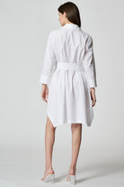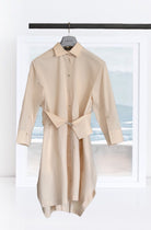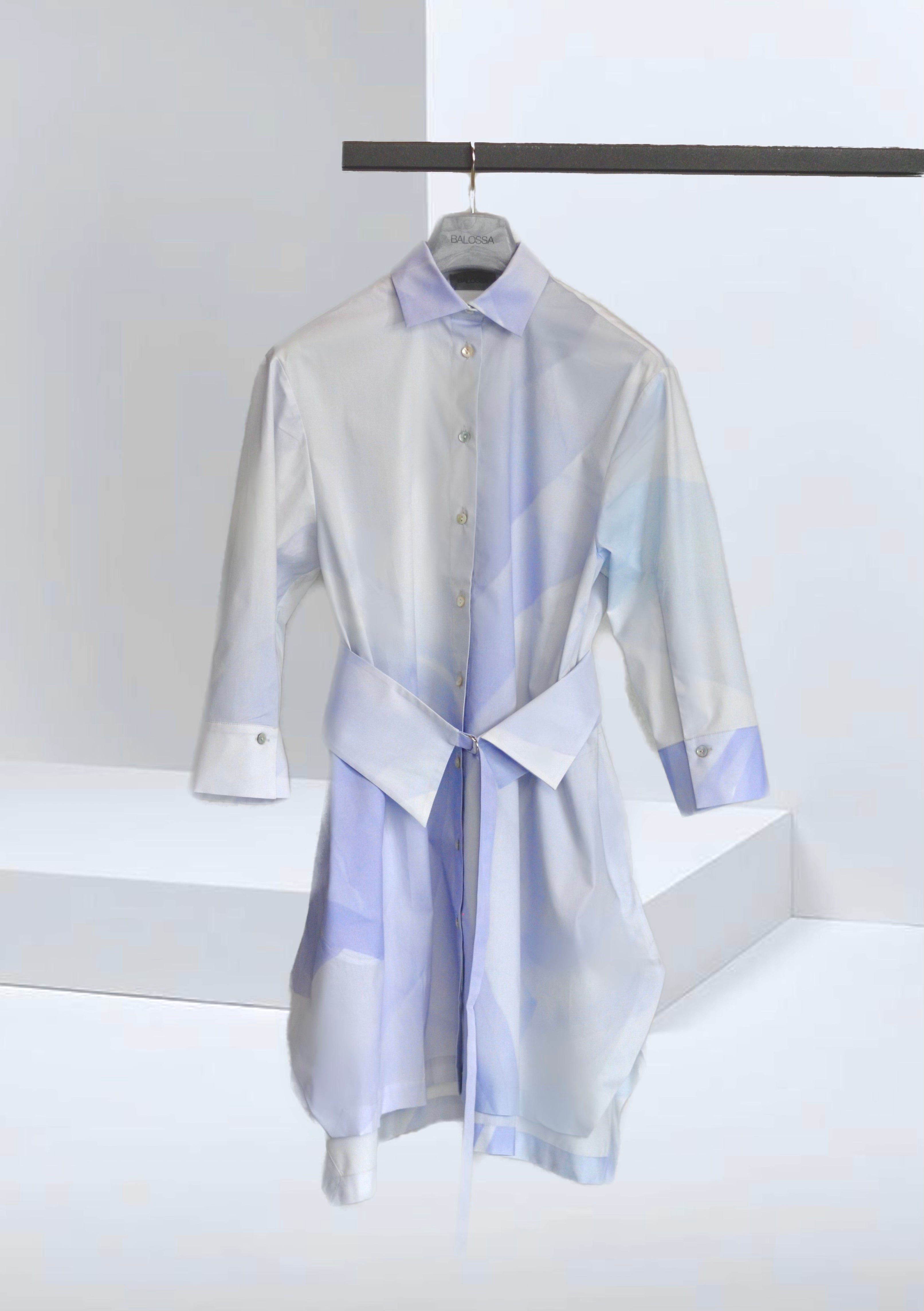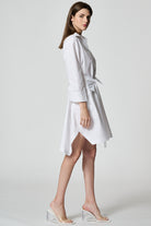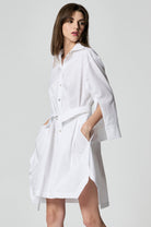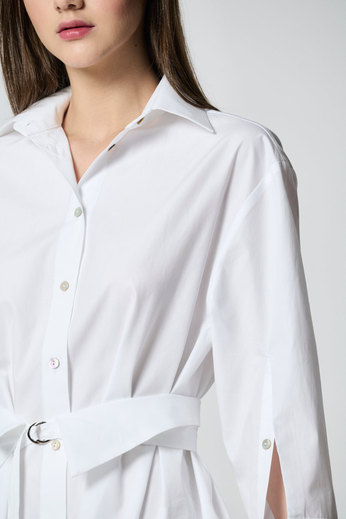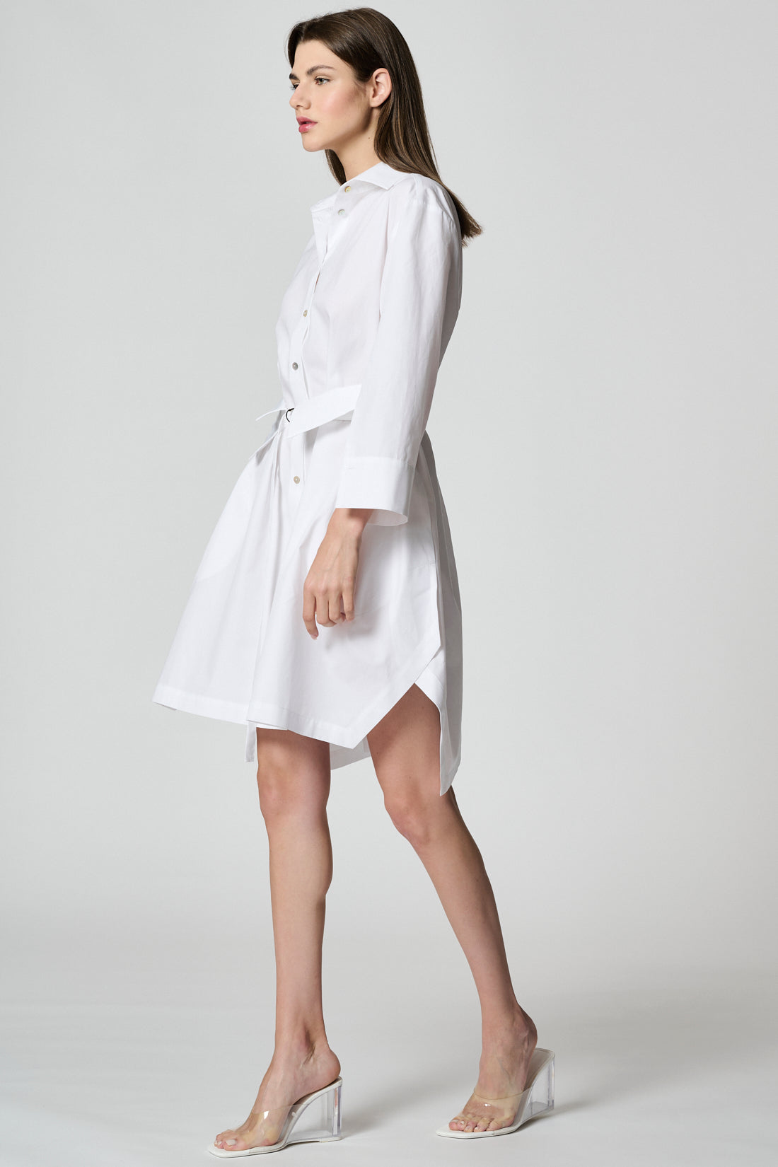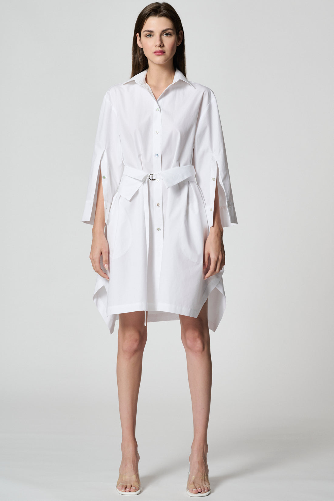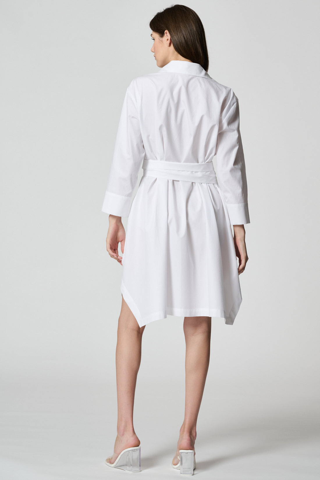 A-shape shirt-dress featuring an irregular hem that overlaps the front part to the back part. Three-quorter sleeves, deep opening with buttons. The belt has been crafted in shape of a collar and can be fixed with metal rings and tied in different ways. Side-seam pockets.