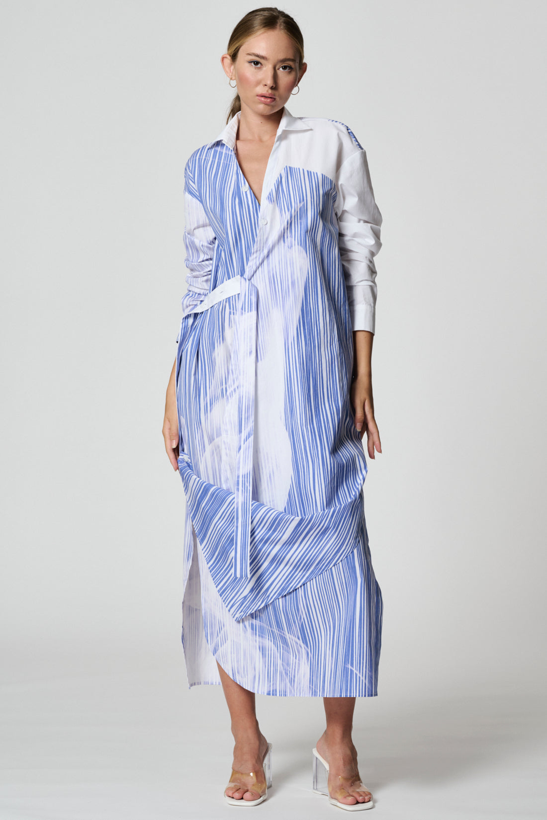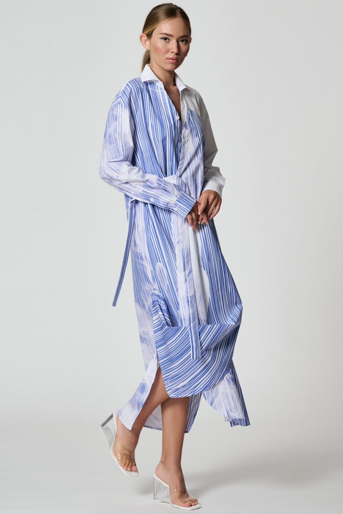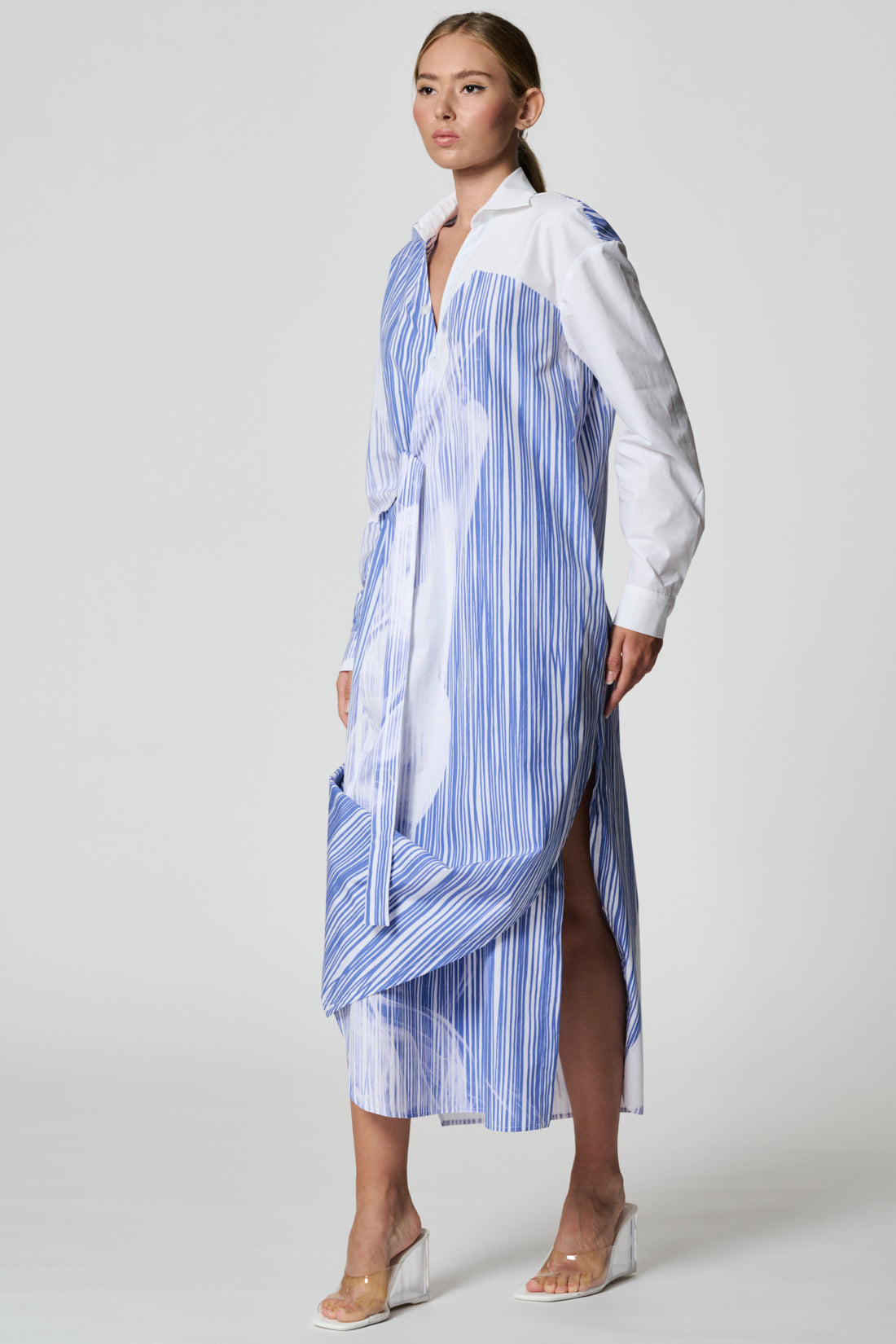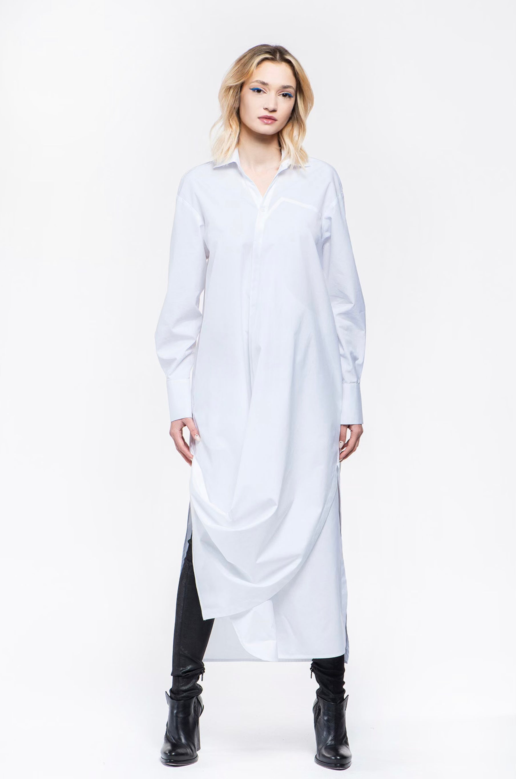 Long regular-fit shirt-dress with V colllar. The wrap dress features splits on both sides. Left hem corner can be fixed on the right side with a button. Two-tone belt allows you to wear the dress in different ways. Two side-seam pockets, internal button.