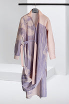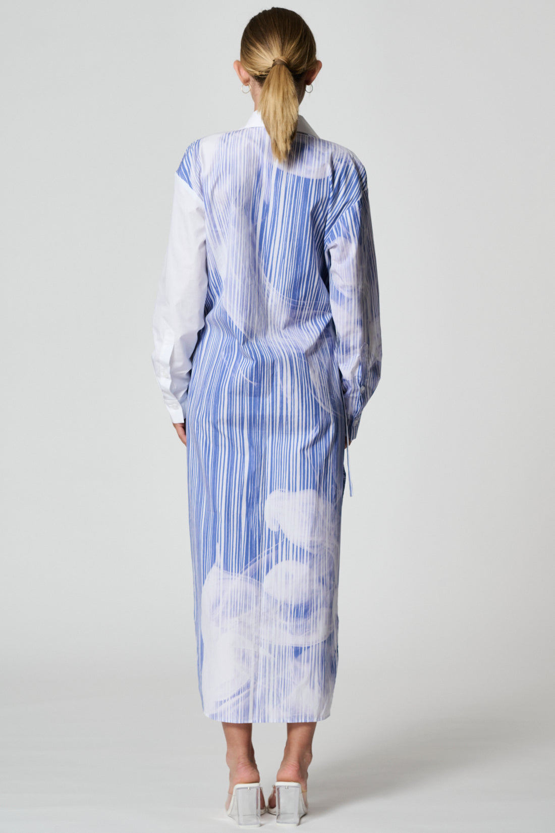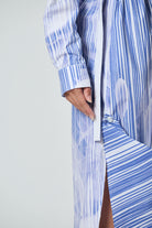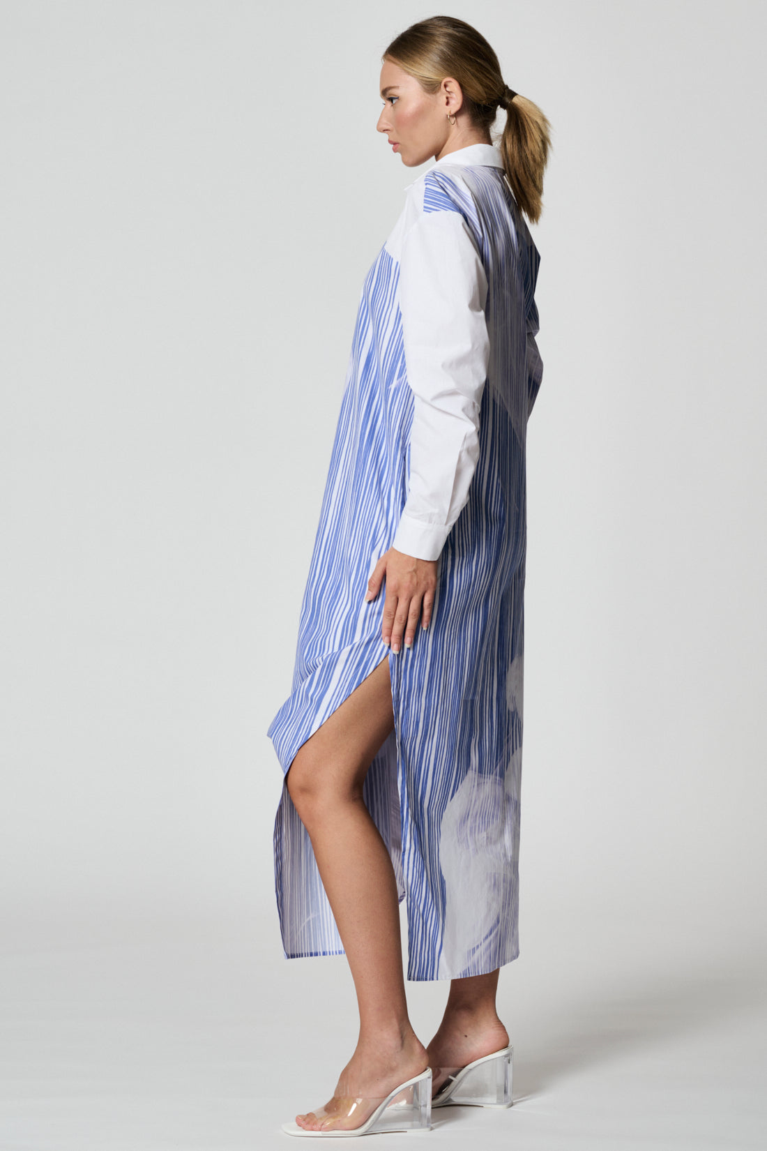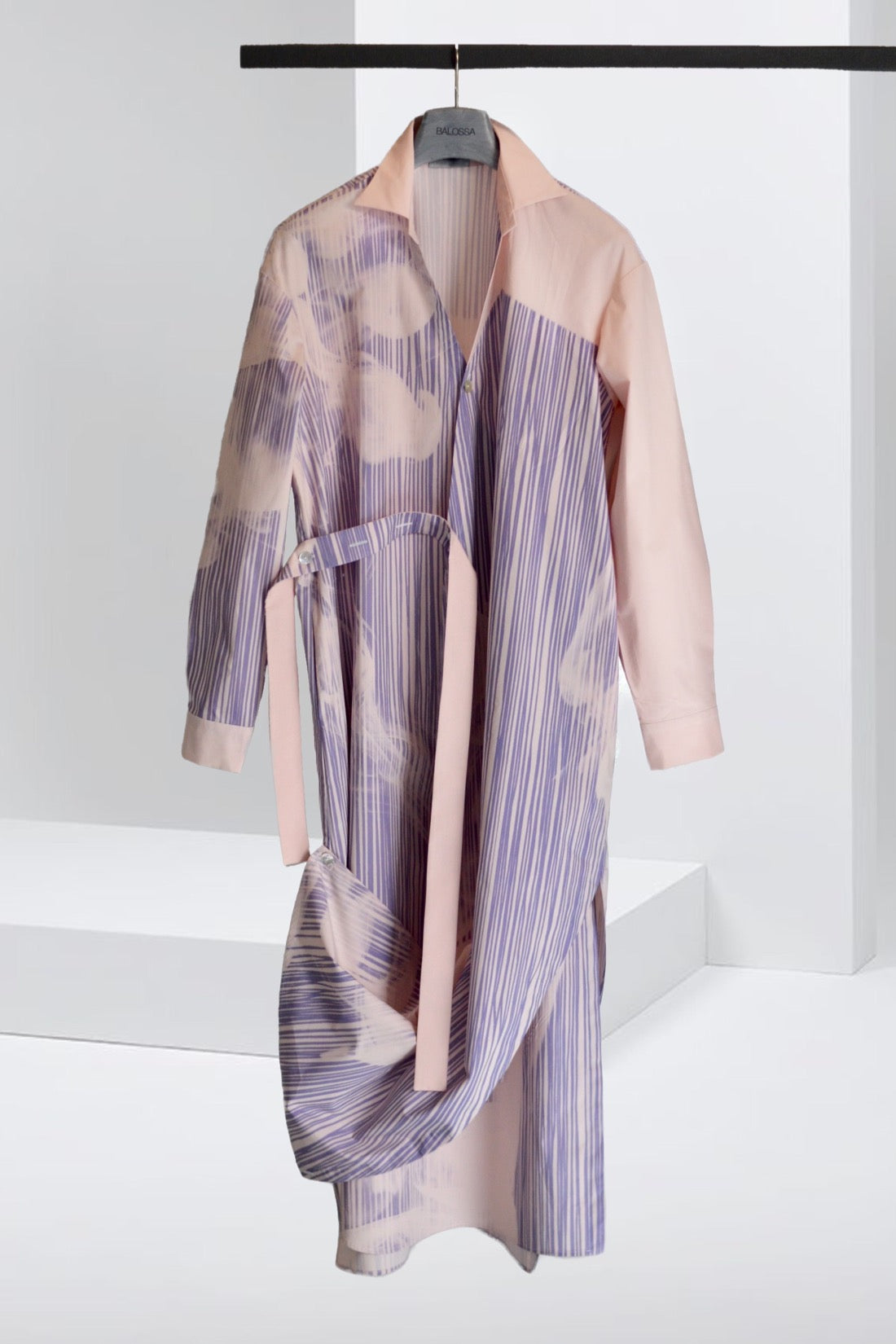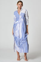 Long regular-fit shirt-dress with V colllar. The wrap dress features splits on both sides. Left hem corner can be fixed on the right side with a button. Two-tone belt allows you to wear the dress in different ways. Two side-seam pockets, internal button.