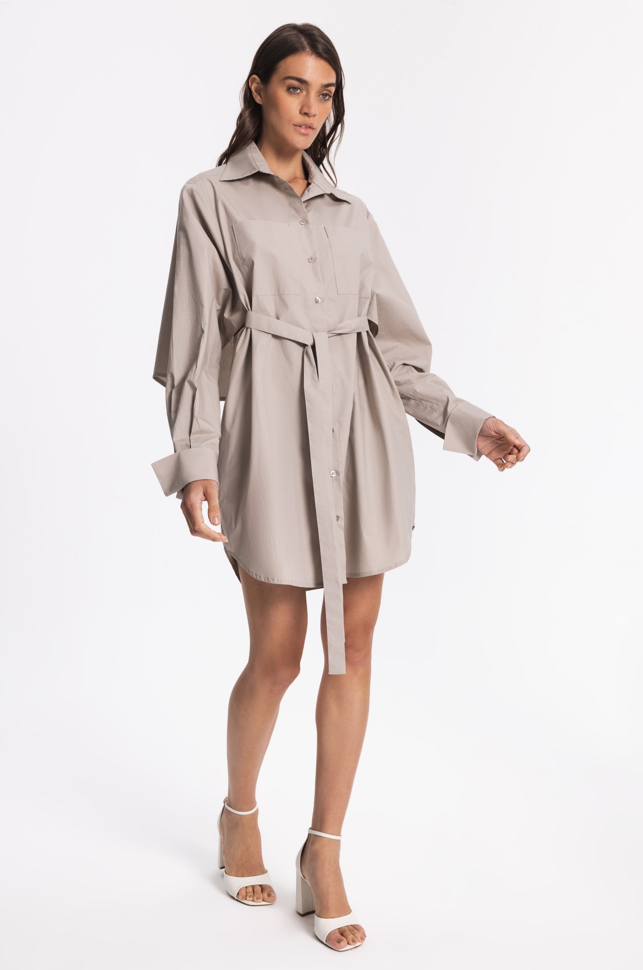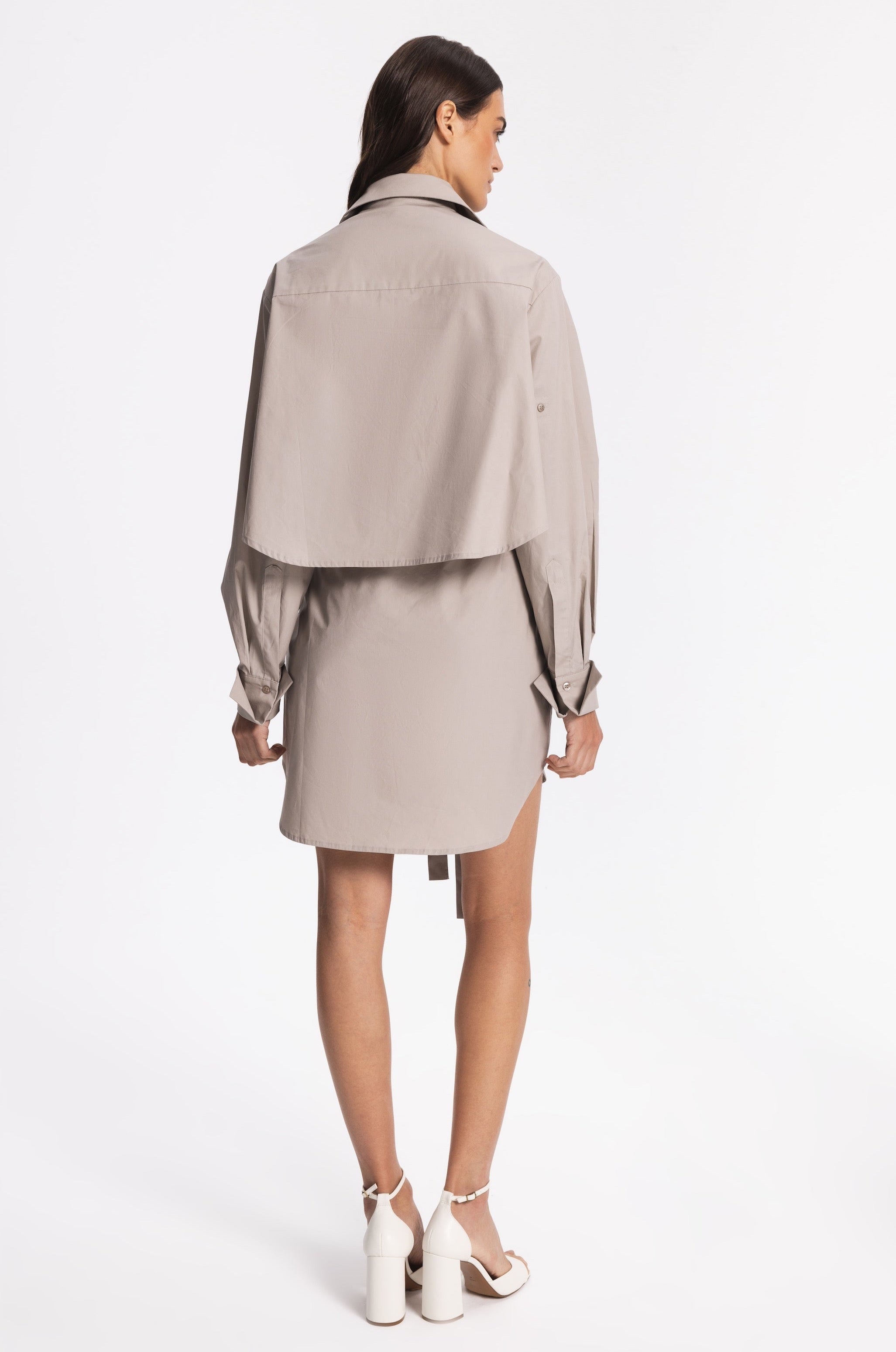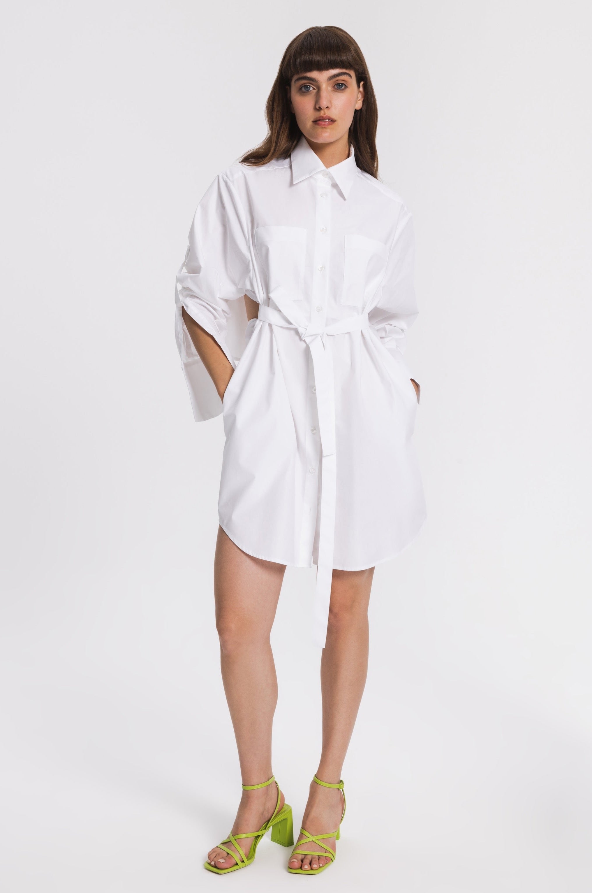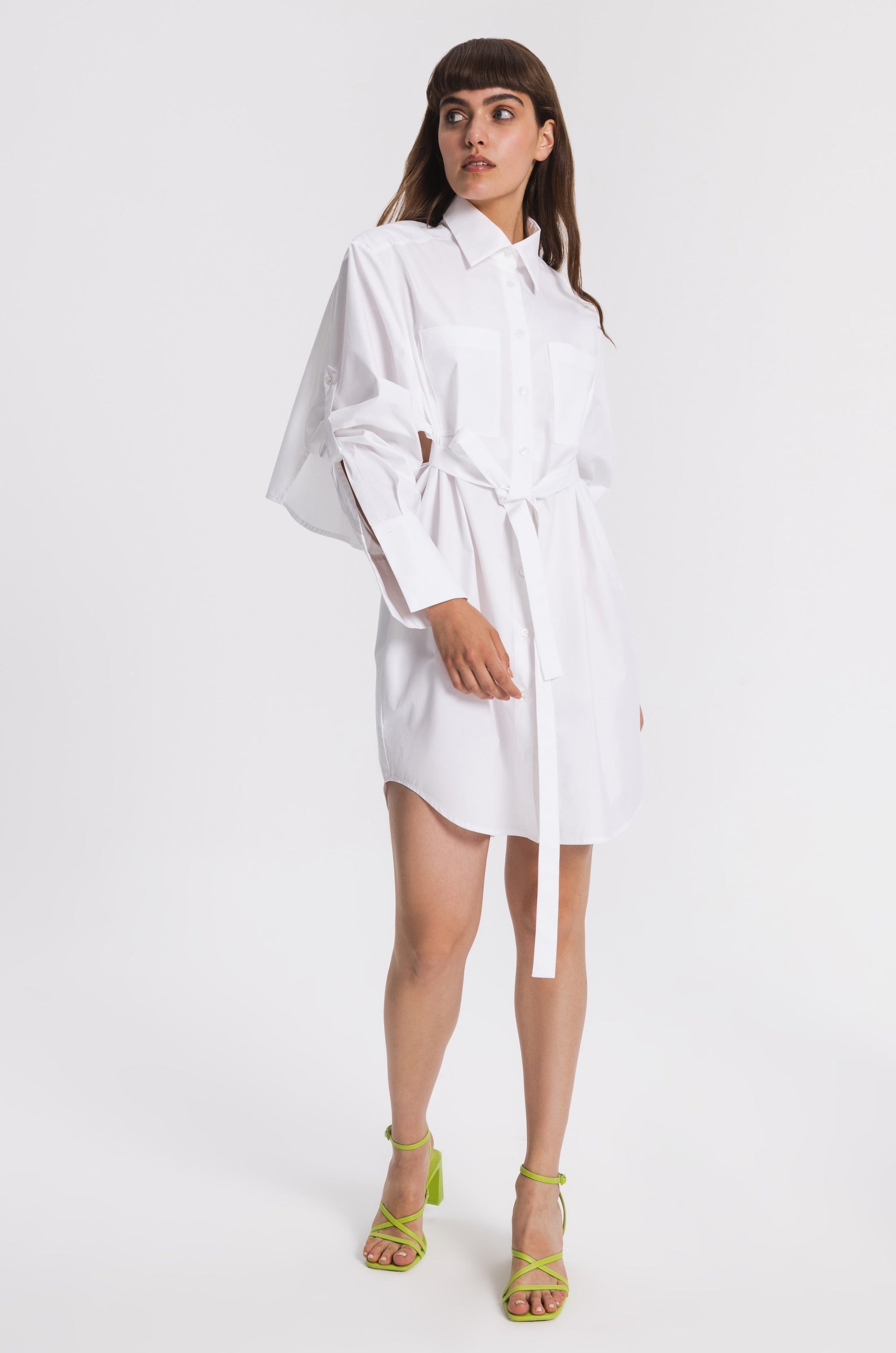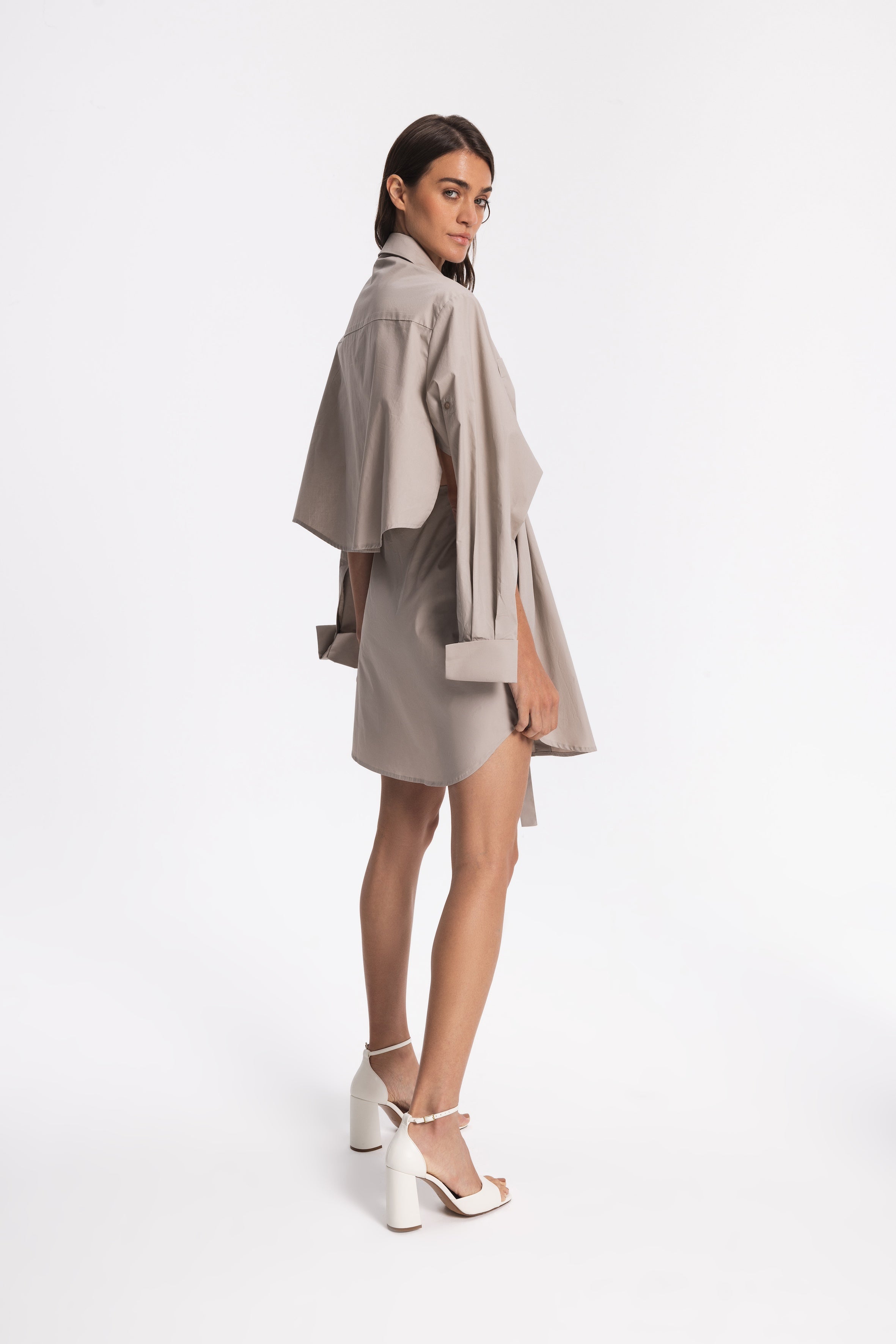 Short poplin dress cut on the back, with a fabric belt and regular front buttoning. The sleeves can be fixed by the fabric strap. This peace can be customised in different ways.