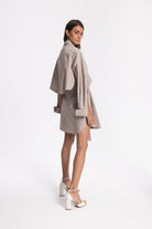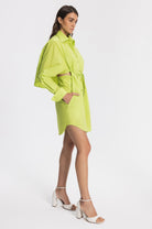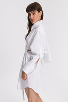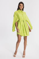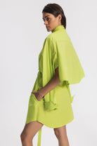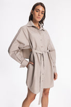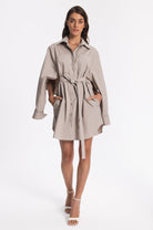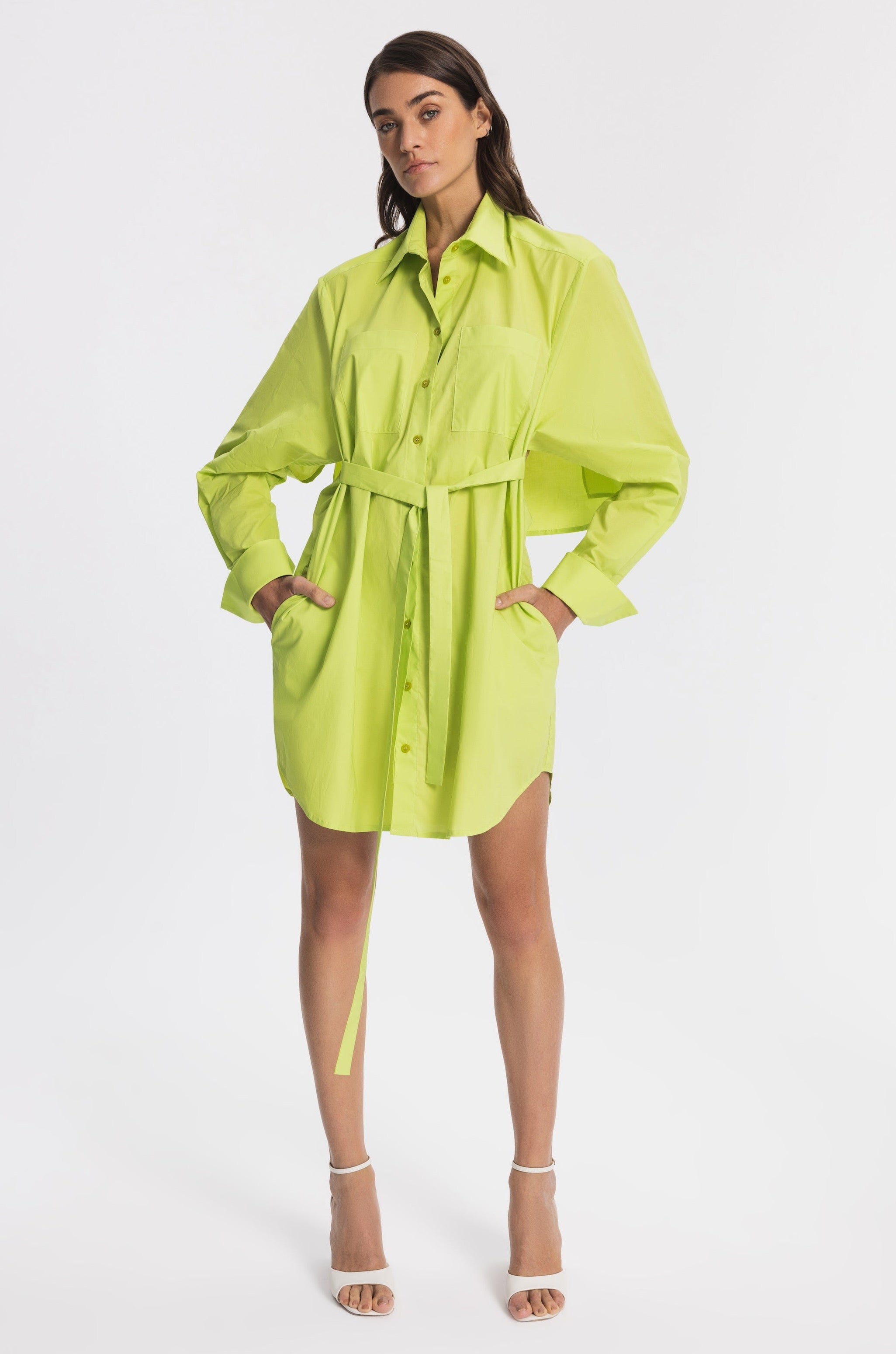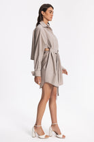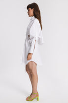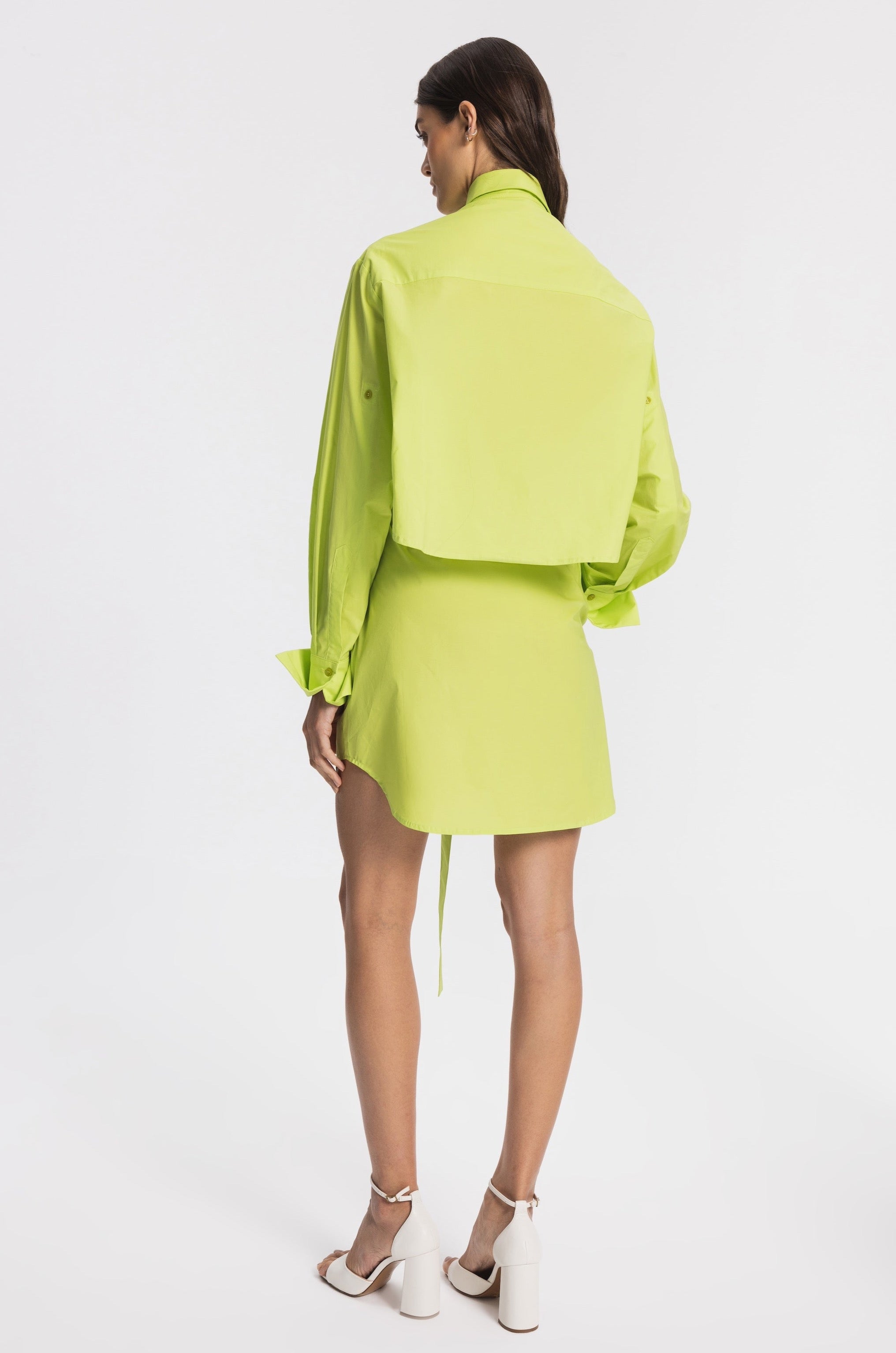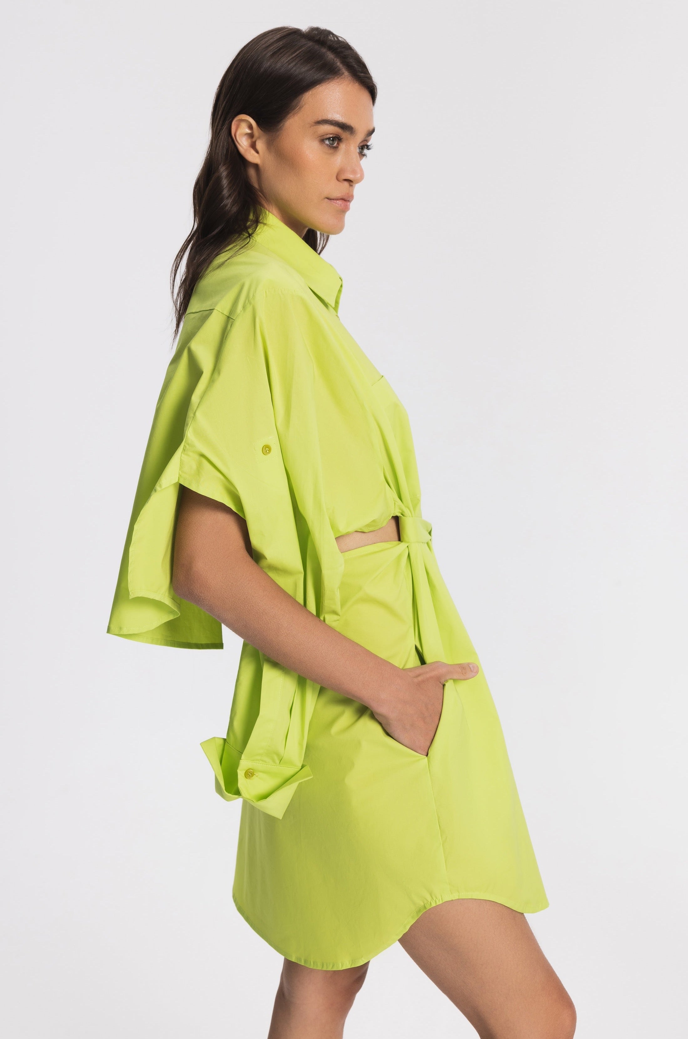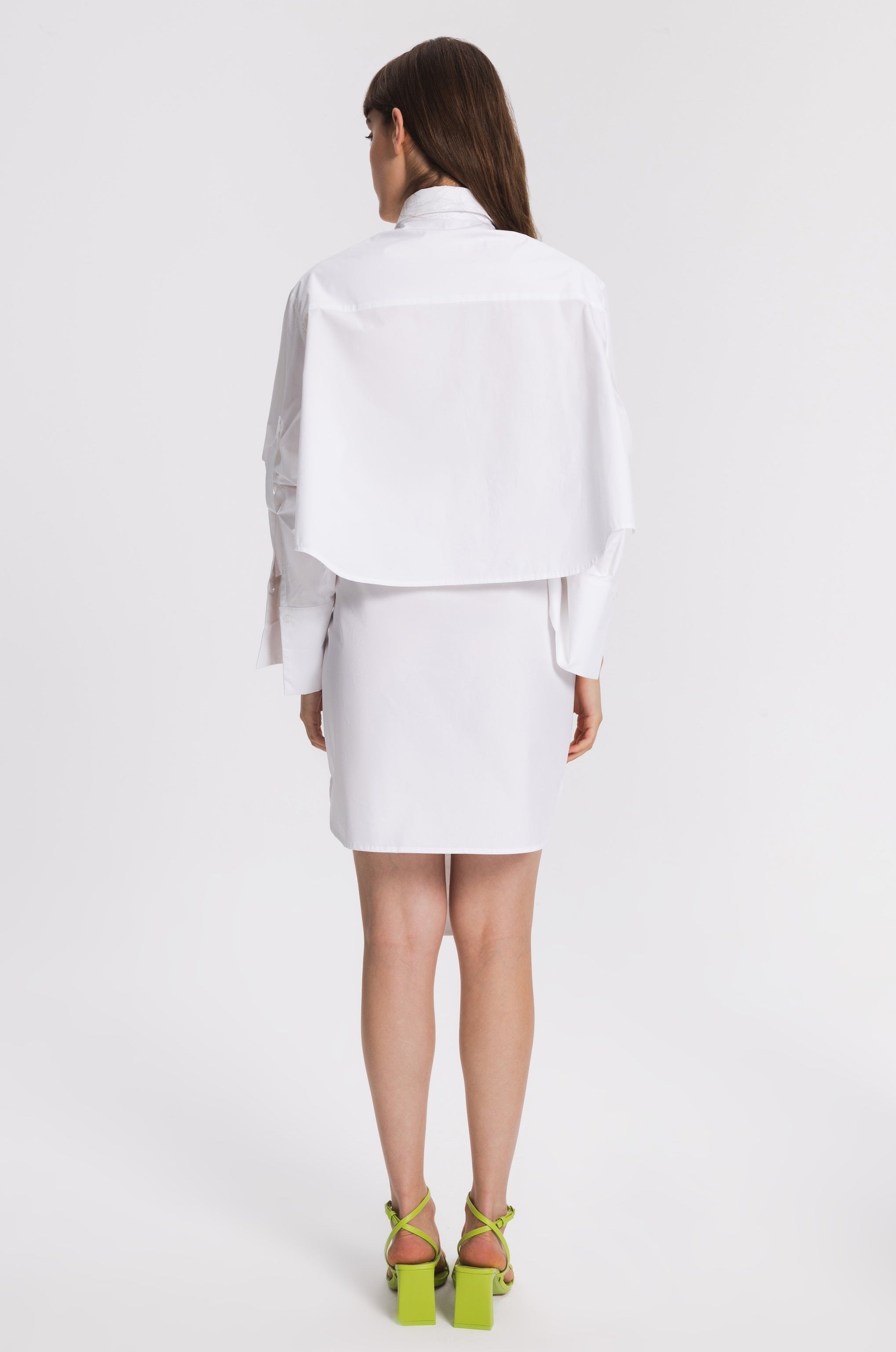 Short poplin dress cut on the back, with a fabric belt and regular front buttoning. The sleeves can be fixed by the fabric strap. This peace can be customised in different ways.
