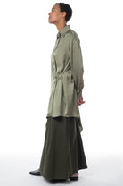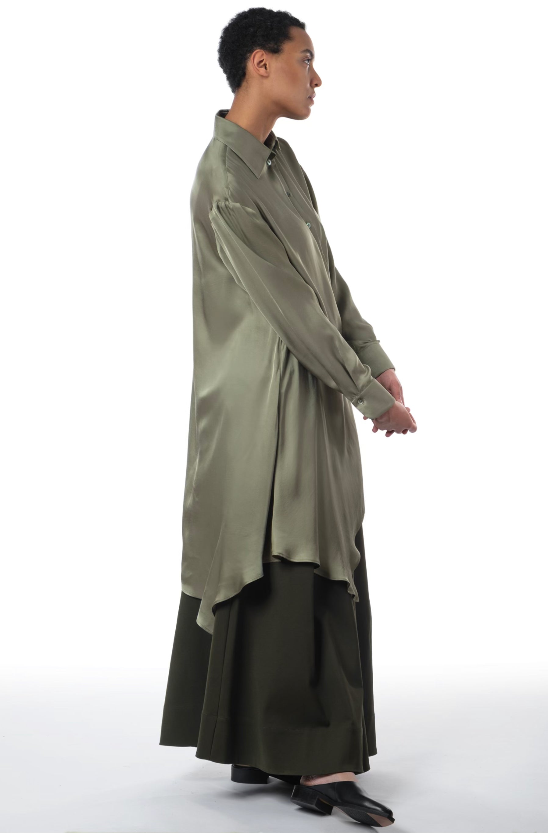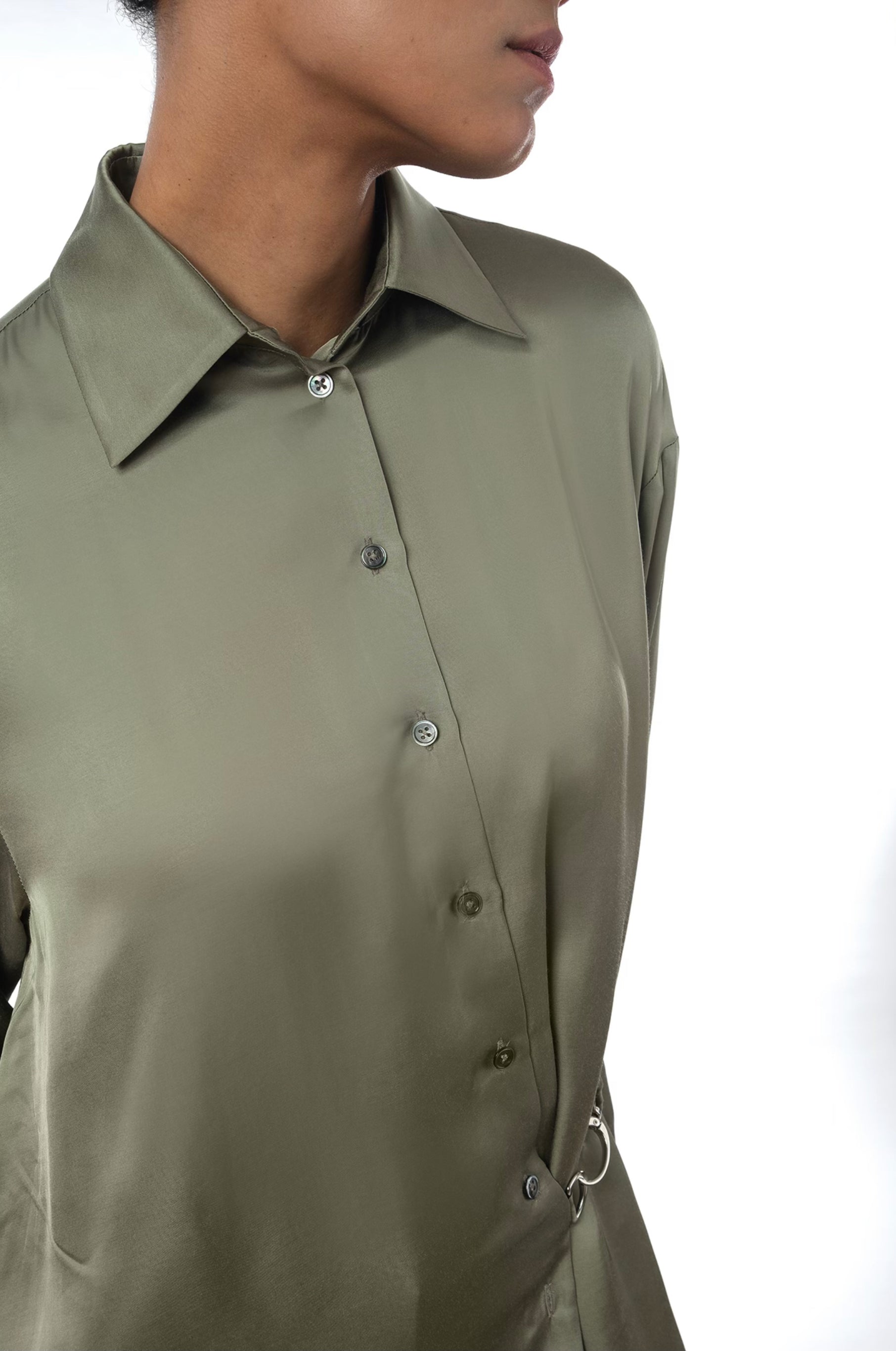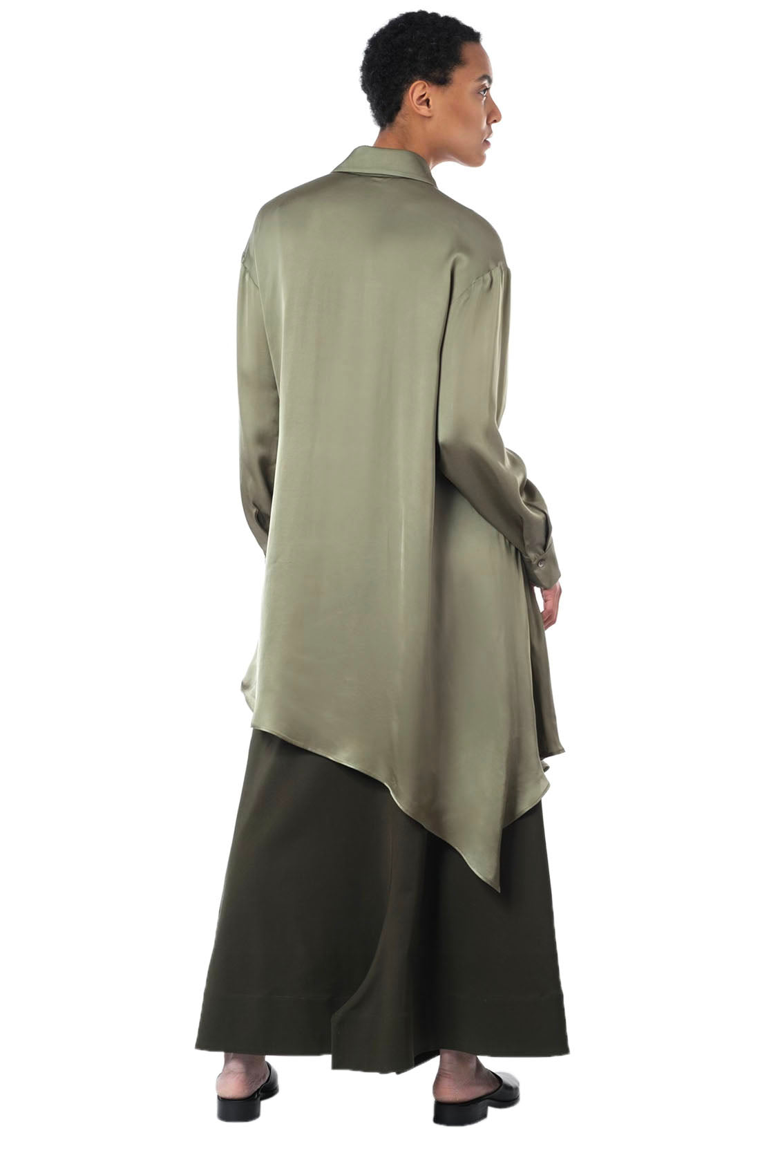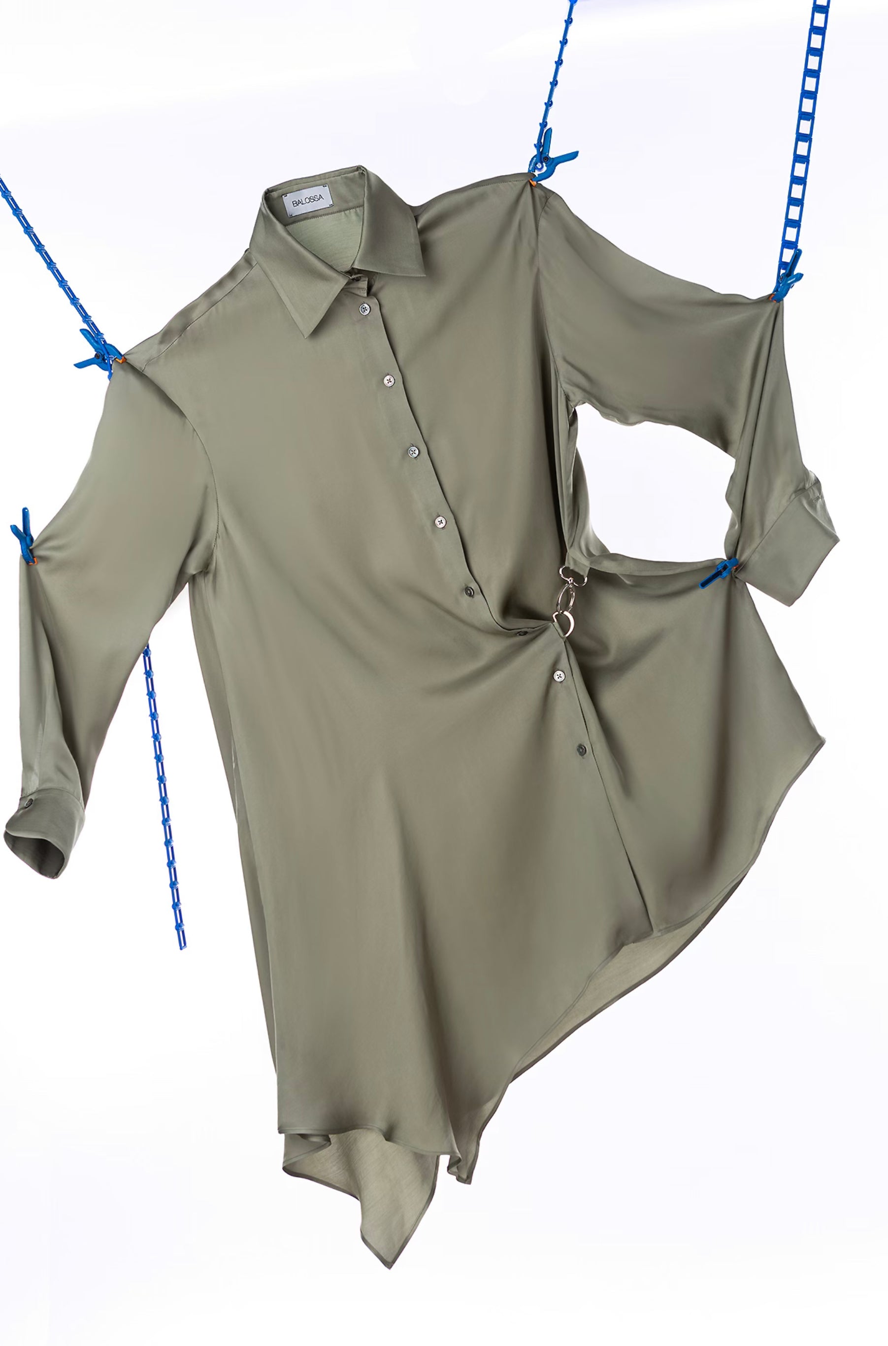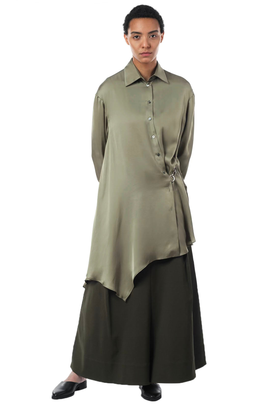 LONG SLEEVED VISCOSE SHIRT WITH A TOUCH OF SILK. THE LAST BUTTON BECOMES A METAL HOOK, CREATING AN ASYMMETRICAL EFFECT THAT FINISHES WITH AN ELEGANT POINT AT THE BACK. BLACK PEARL BUTTONS AND CLASSIC COLLAR.