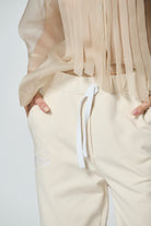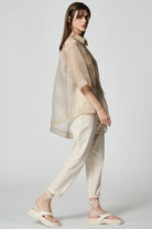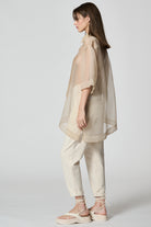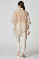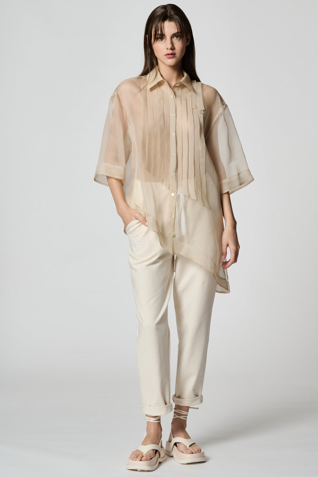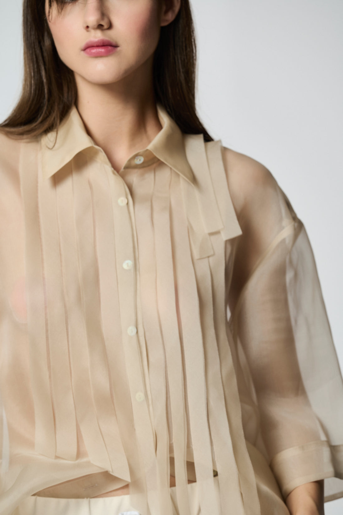 Oversize transparent shirt with front decorations and mid length large sleeves. This shirt features an asymmetrical hem cut and one side slit.