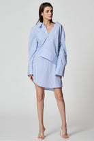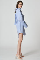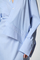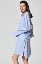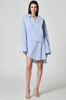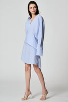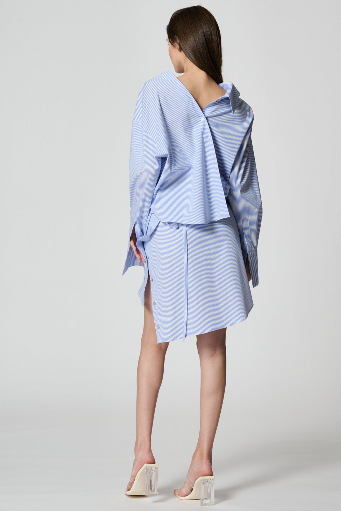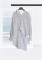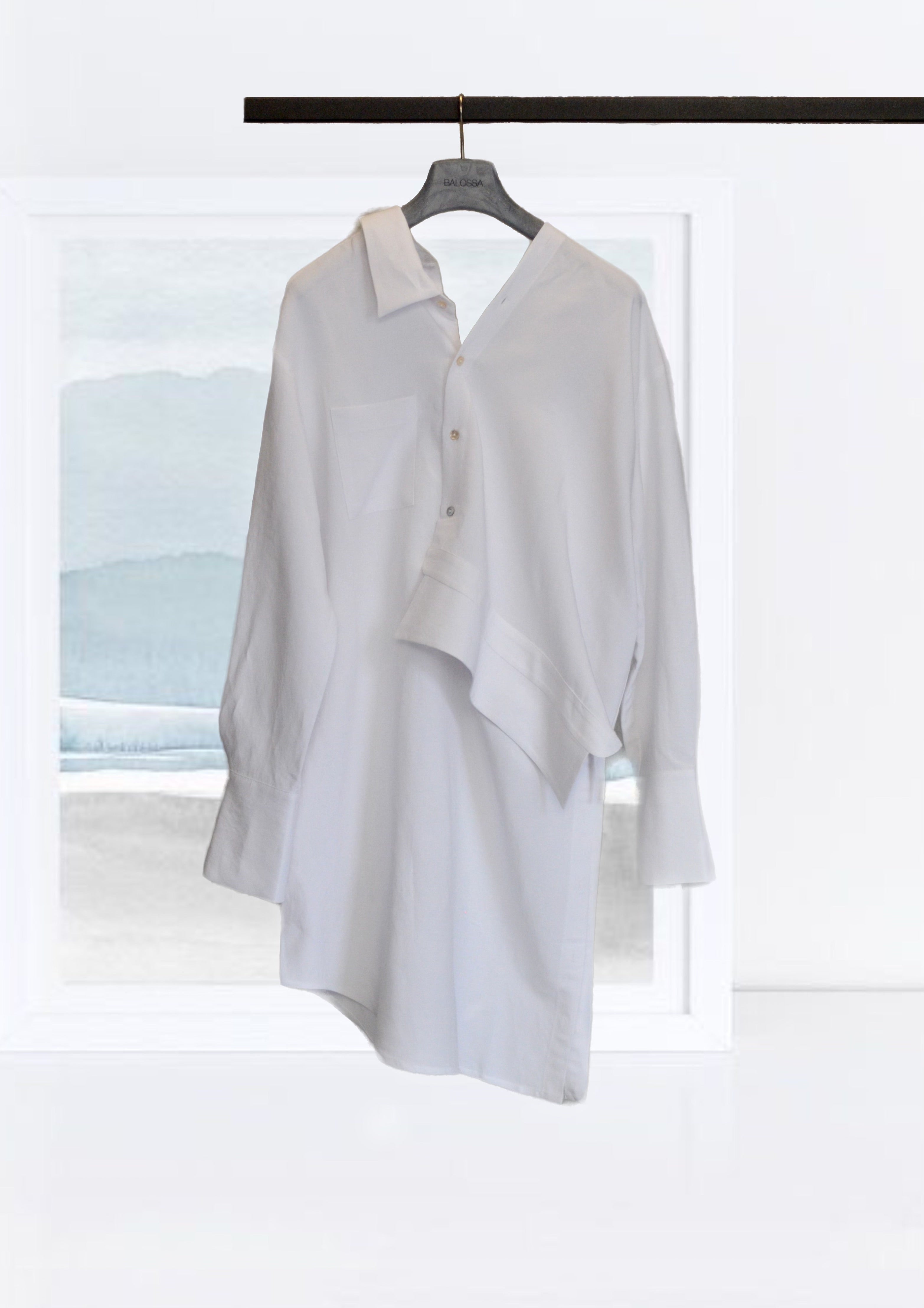 Transformable shirt-dress. Side closure with the buttons left side long and a lace. The short part of the shirt on left side can be customized by buttons in many ways. The decorative collar on the hem of the shorter part.