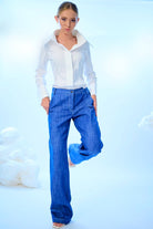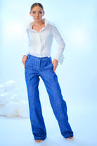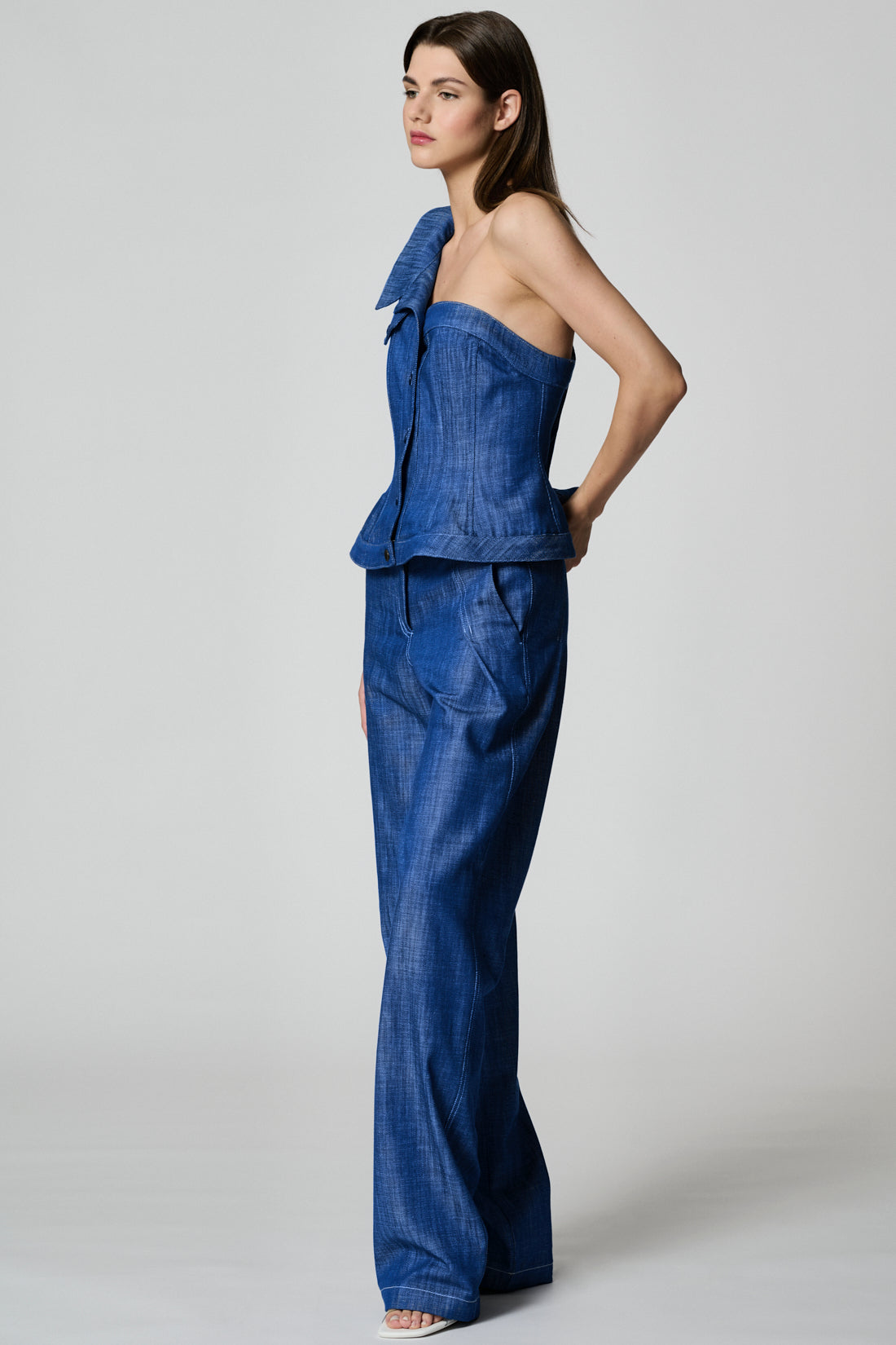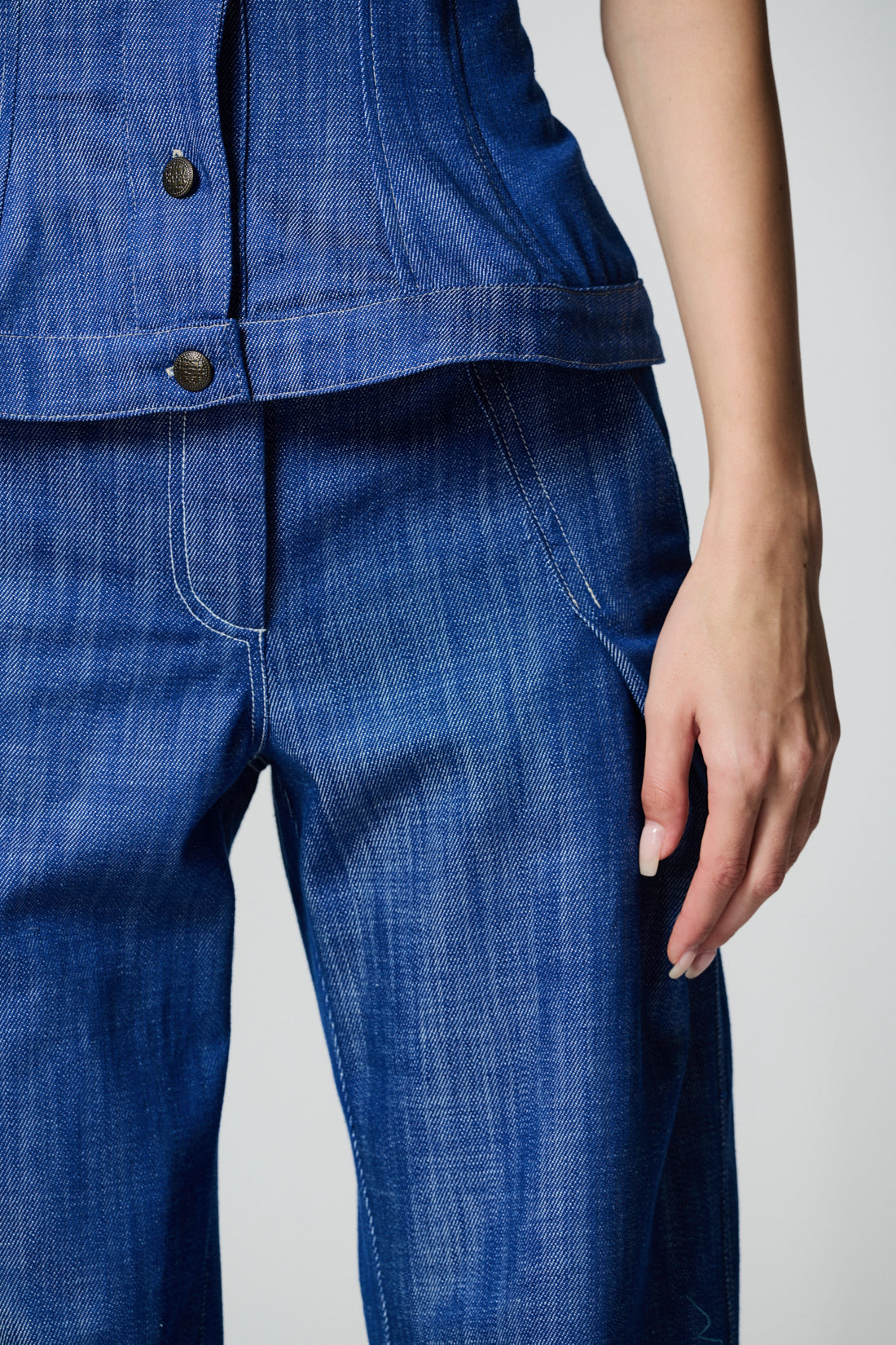 Straight-cut pants in denim with two side slanted pockets and a single welt pocket behind. This pans feature a wide sewn fold on left front side.