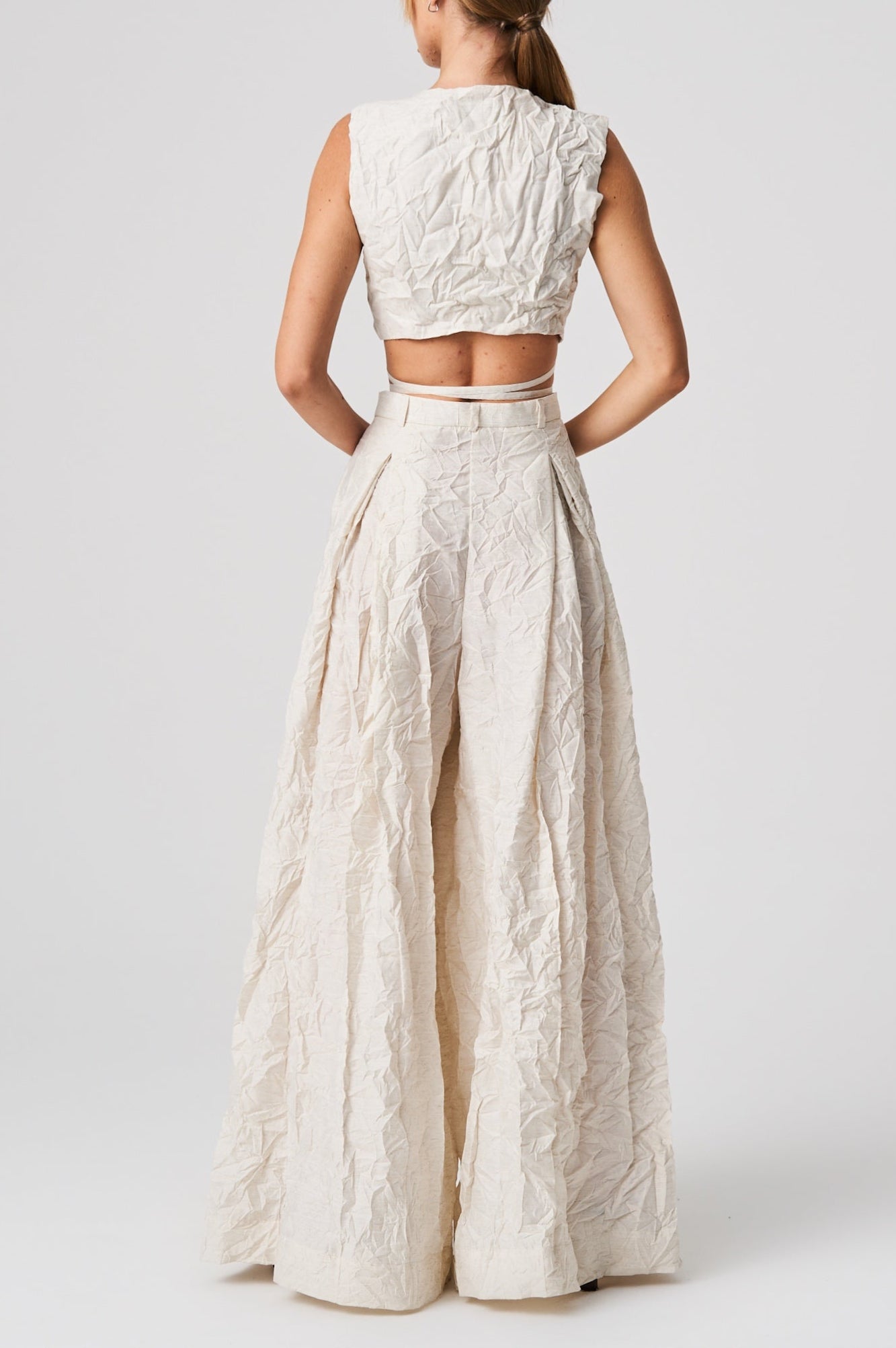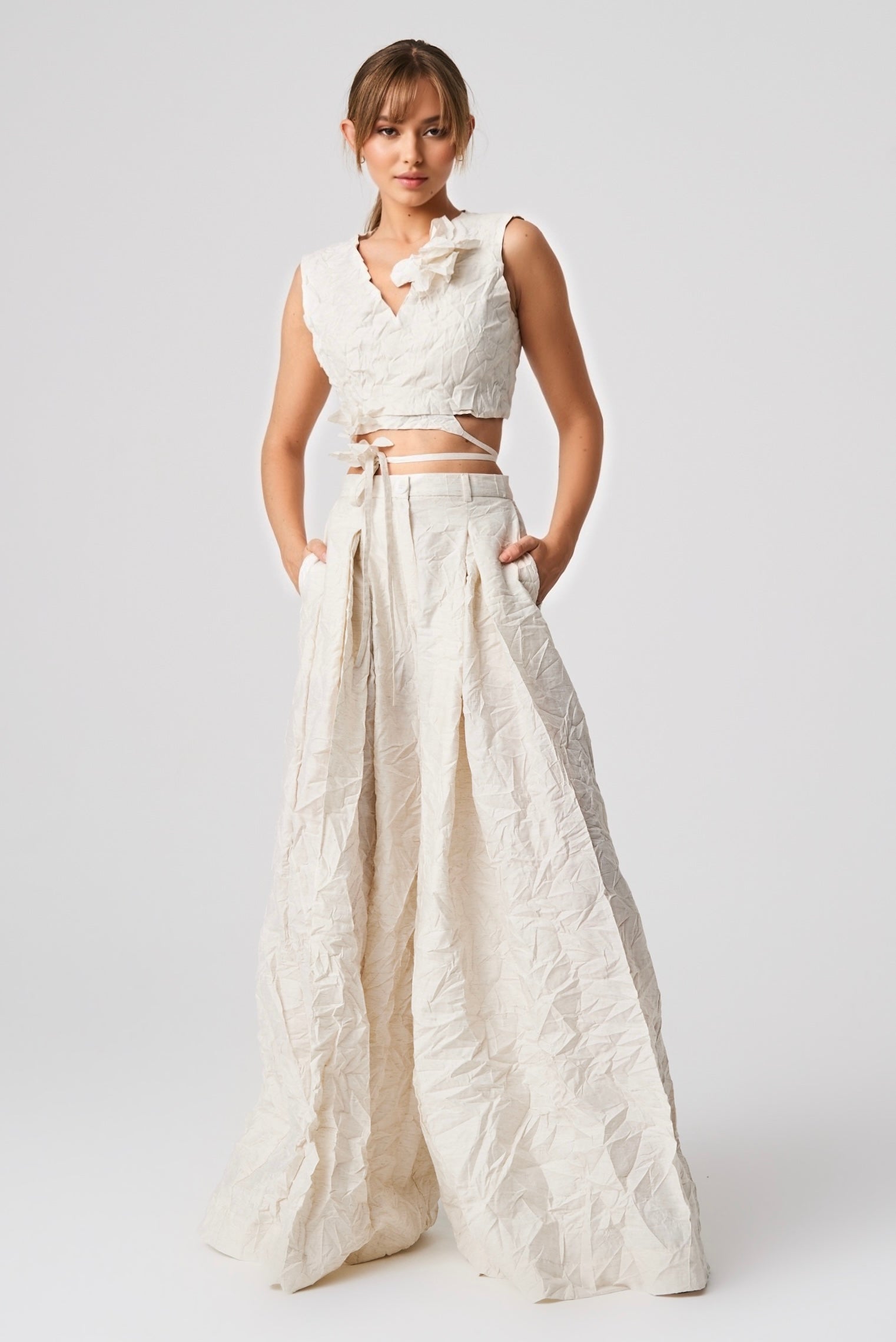 High-waisted pants with extra-wide flared legs. This design features two side pockets and double pleats at the front and back. The unique feature of this garment is the crinkled and crispy-effect fabric.