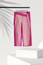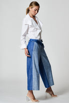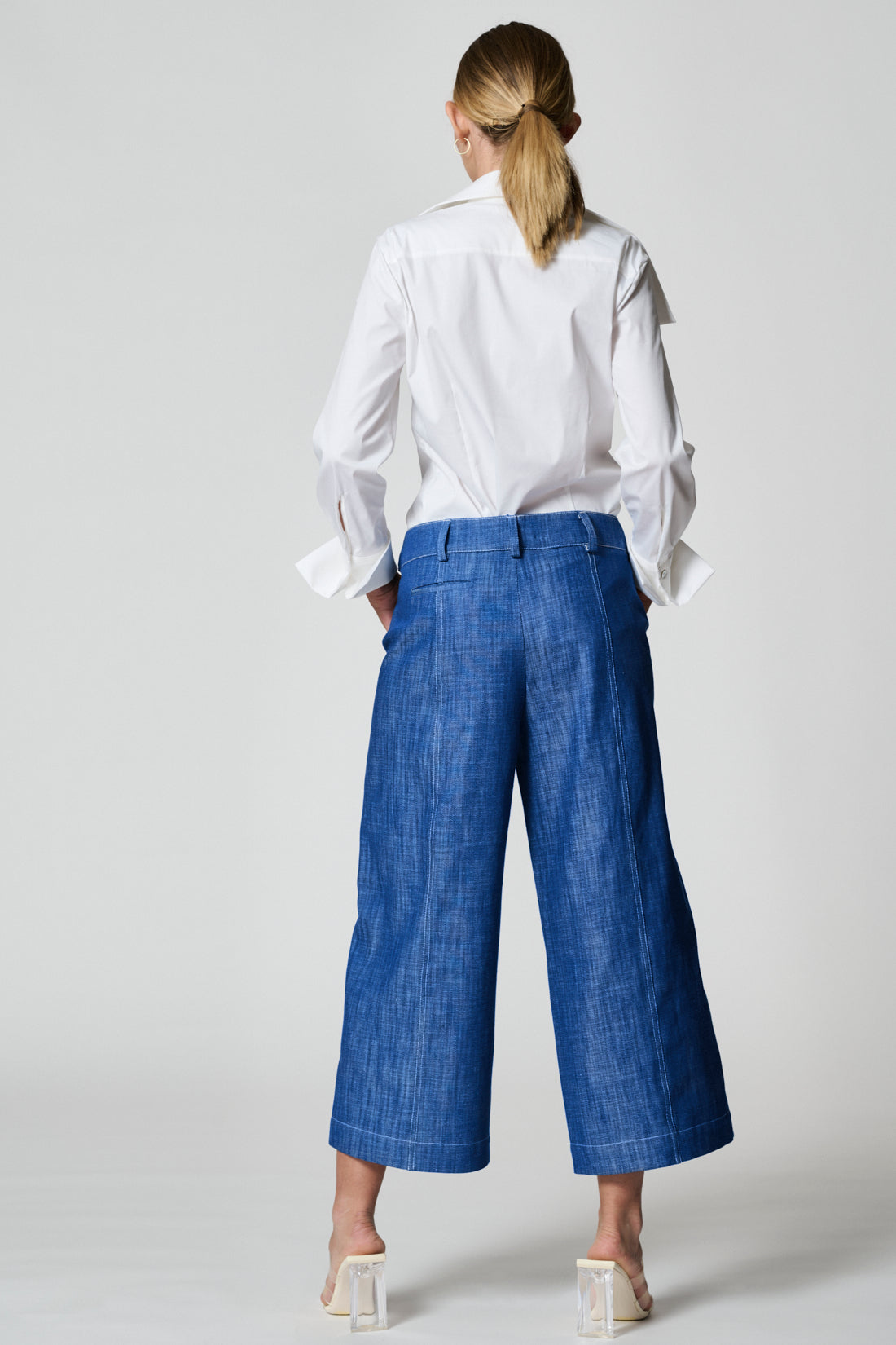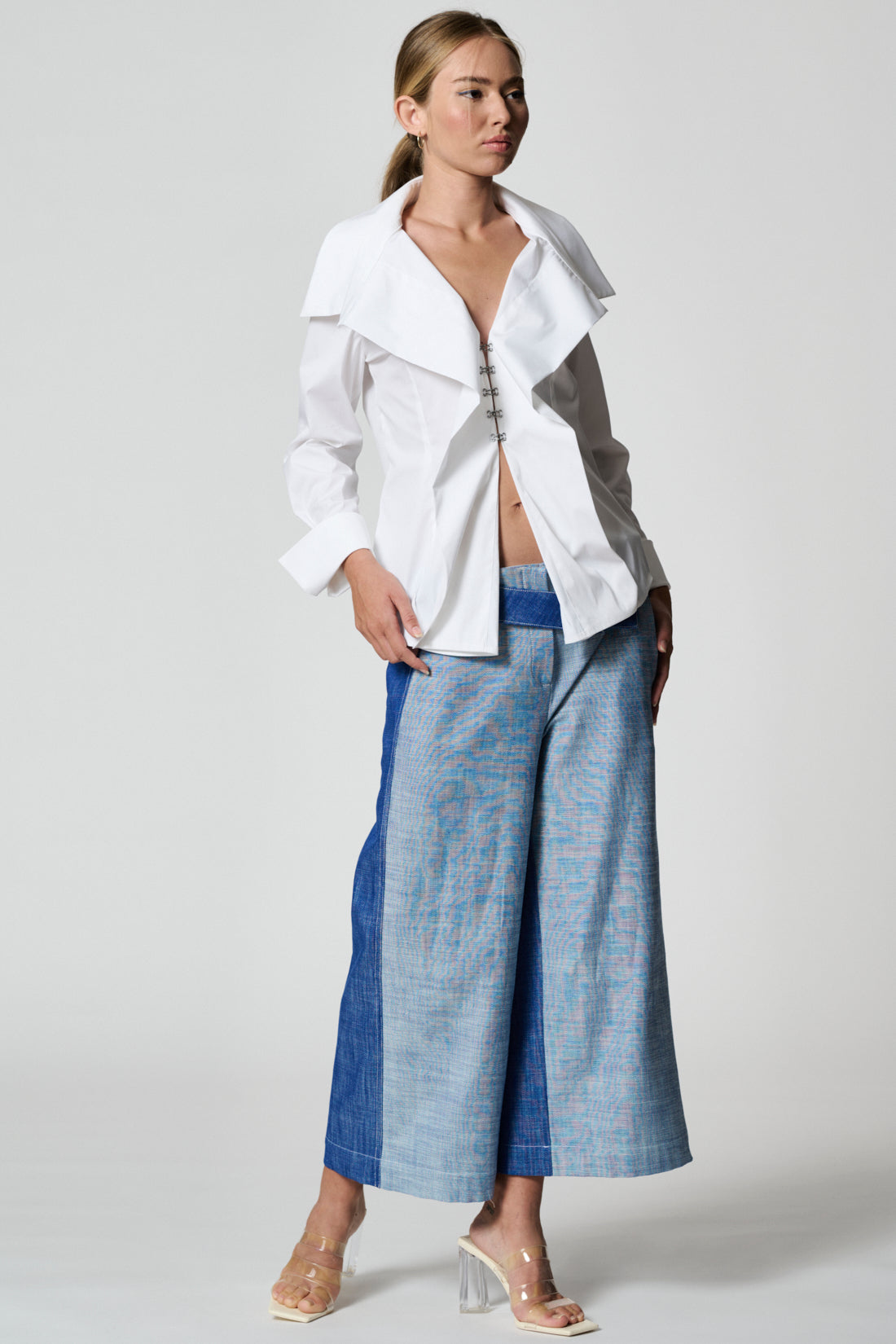 Wide-leg regula-fit pants. Front zip closure, the belt in contrasting color that wraps from one side of the hip and is fixed at the front transversely with a metal button. Front slant pockets, a welt poscket at the back.
