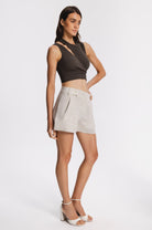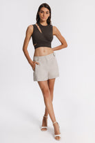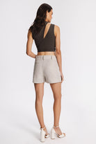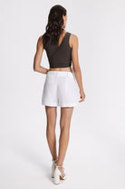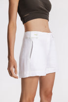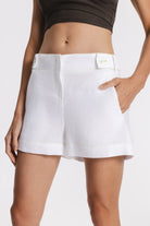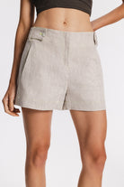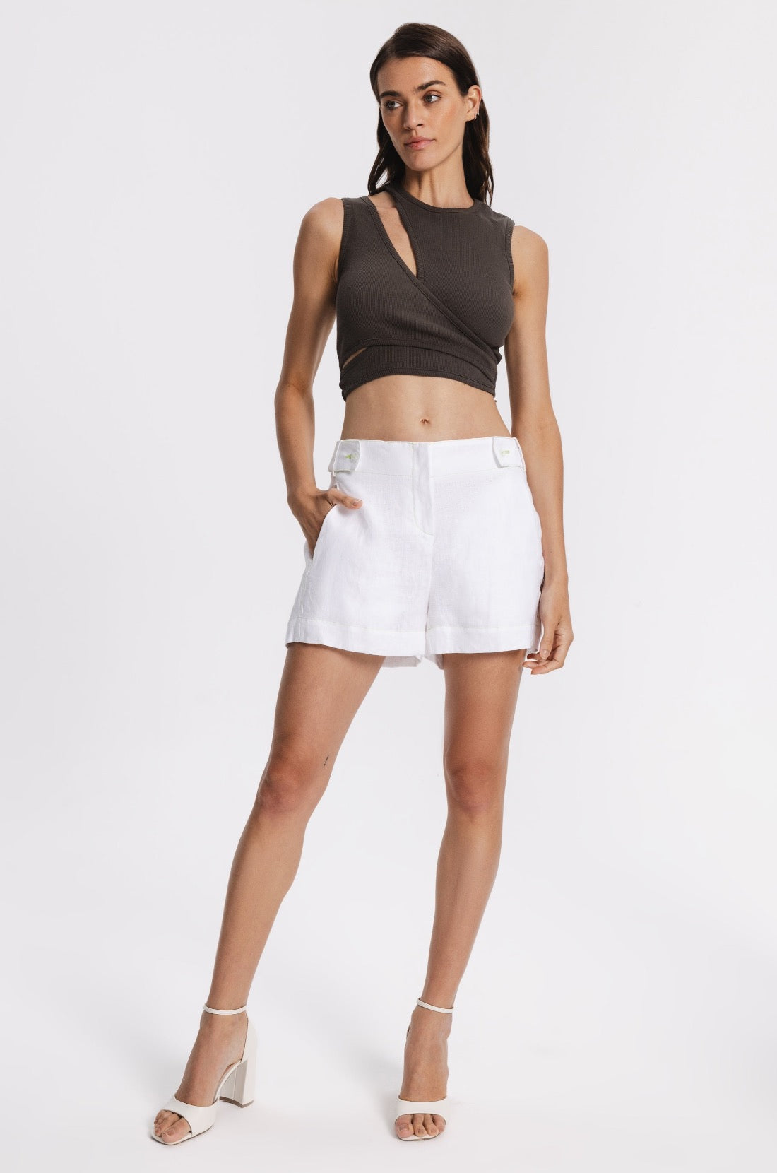 Regular fit linen shorts. Front zip closure. Lateral slant pockets. Two clips with button at the waist. Stitching with contrasting thread.