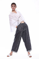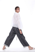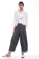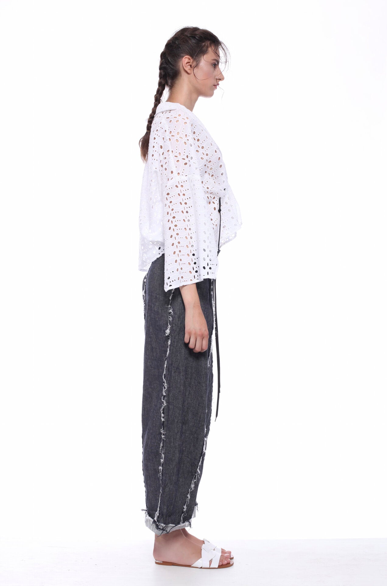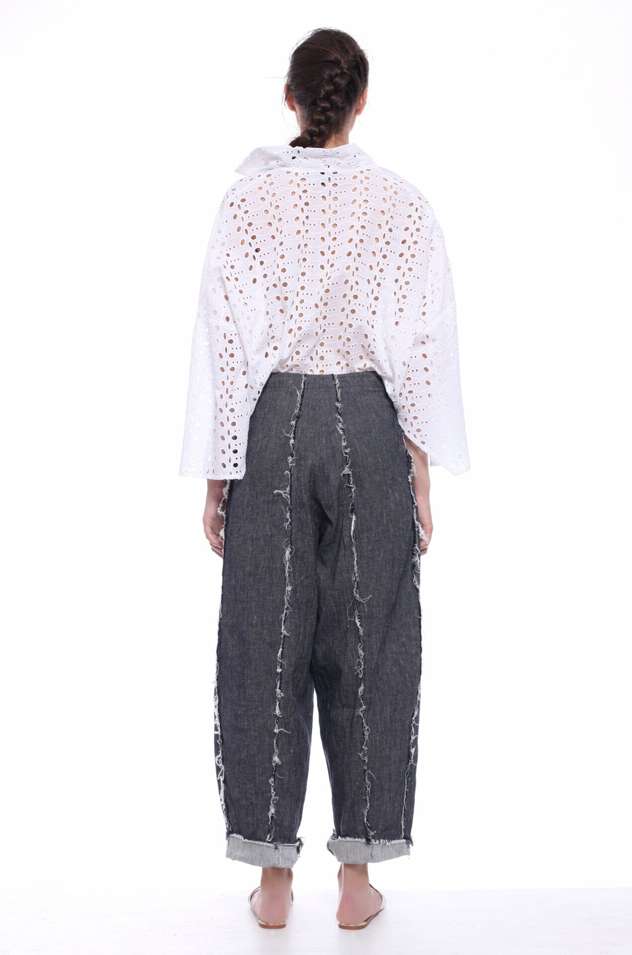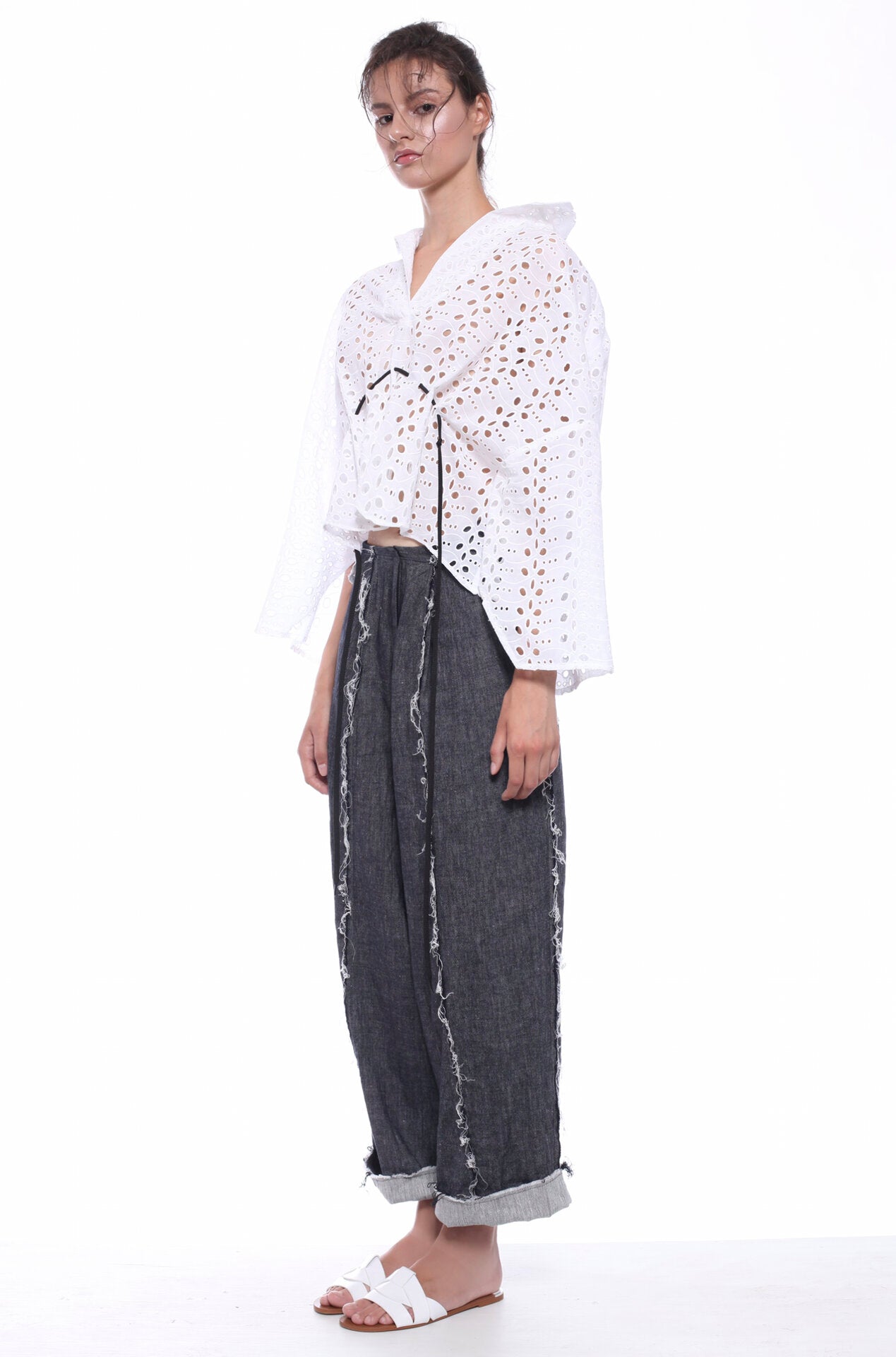 WIDE-LEG TROUSERS IN LIGHT COTTON-LINEN STRETCH DENIM. RAW CUT STITCHING, SIDE POCKETS, LOW WAIST. SPECIAL WASHING FOR SOFTER EFFECT FOR EVERYDAY COMFORT USE.