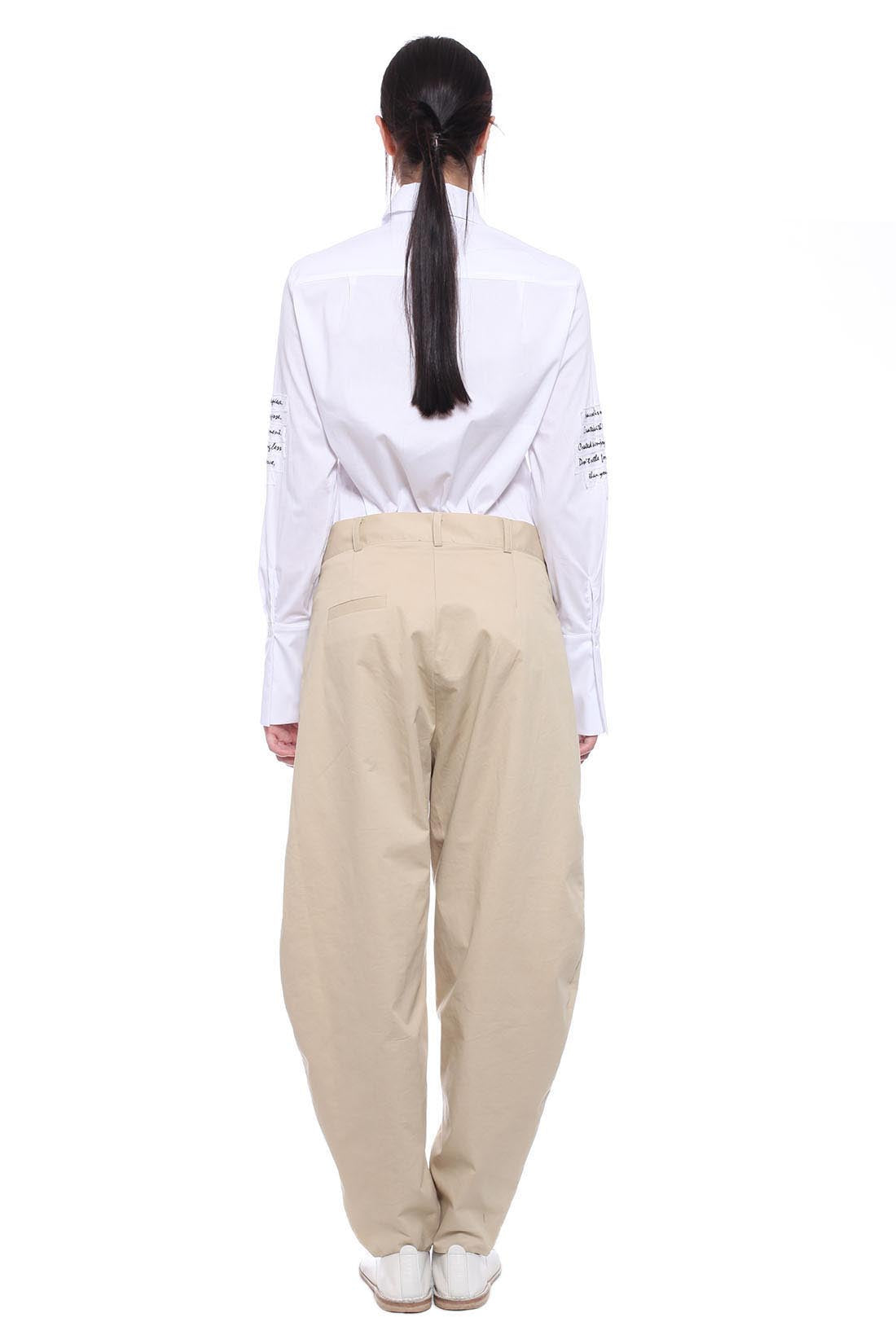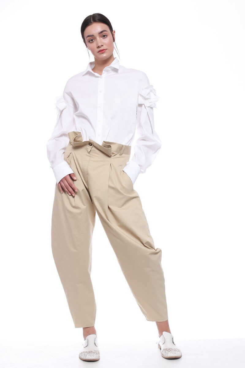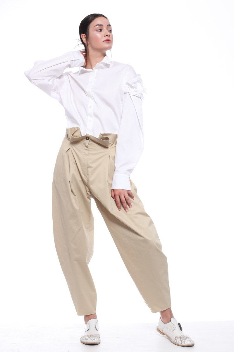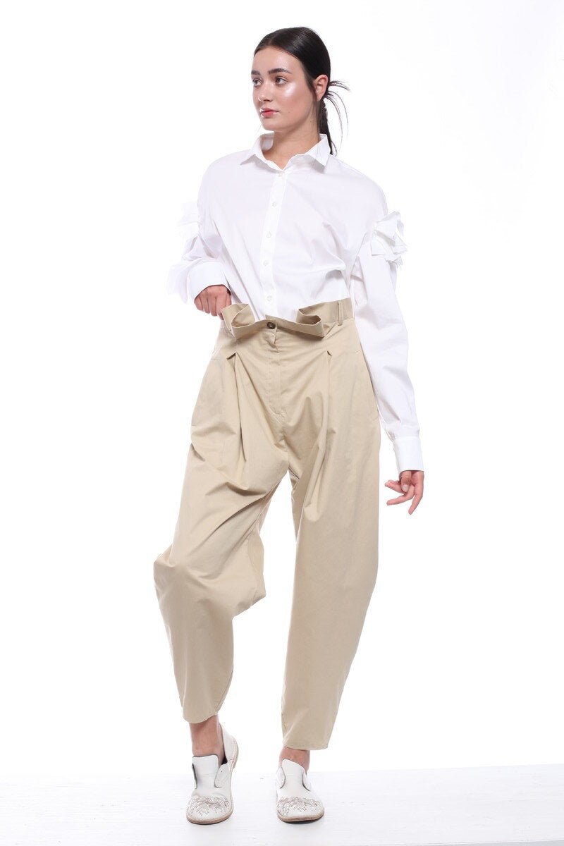 CONTEMPORARY HIGH-WAISTED TROUSERS WITH FRONT PLEATS AND TWO SIDE POCKETS. MADE OF PURE, LIGHTWEIGHT COTTON 'TRENCH' FABRIC.