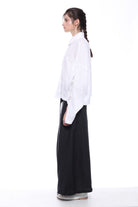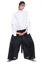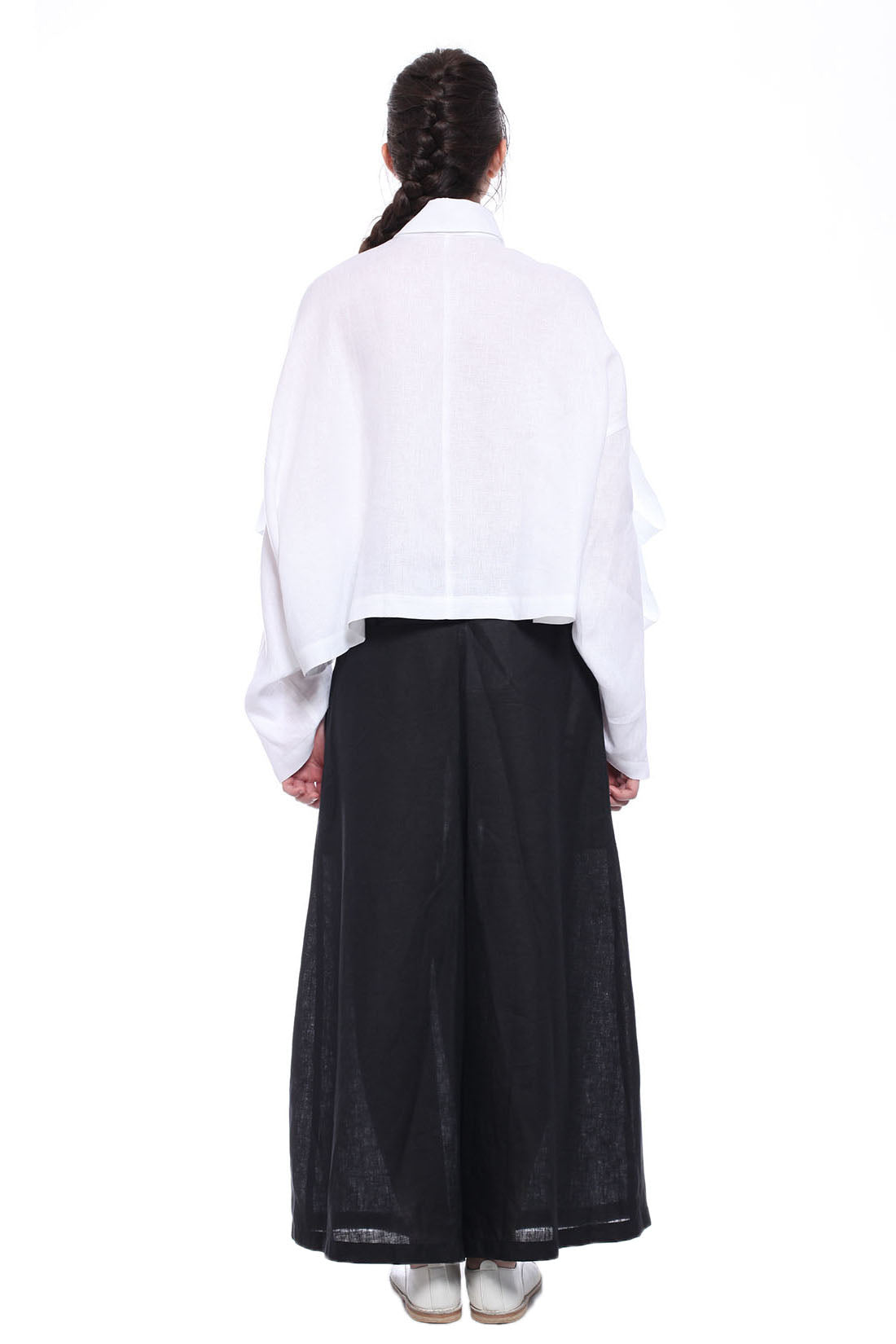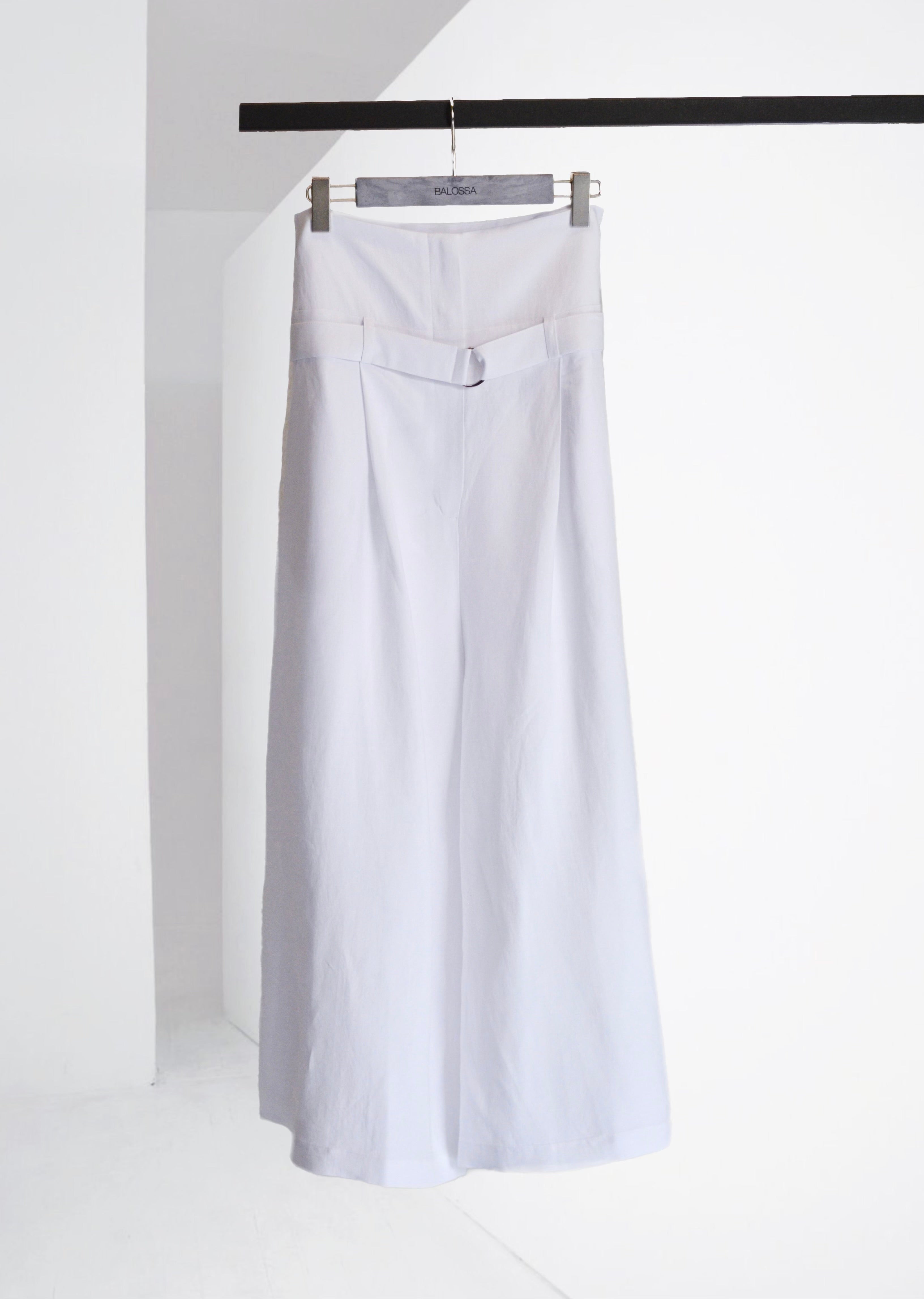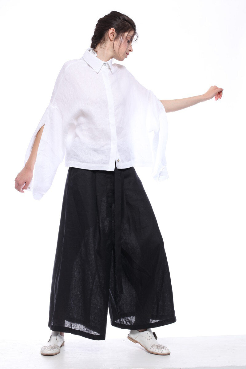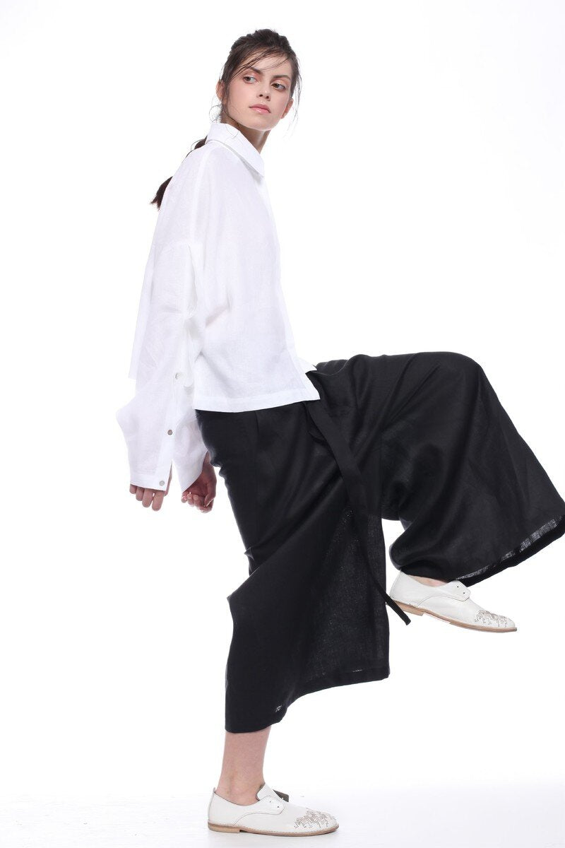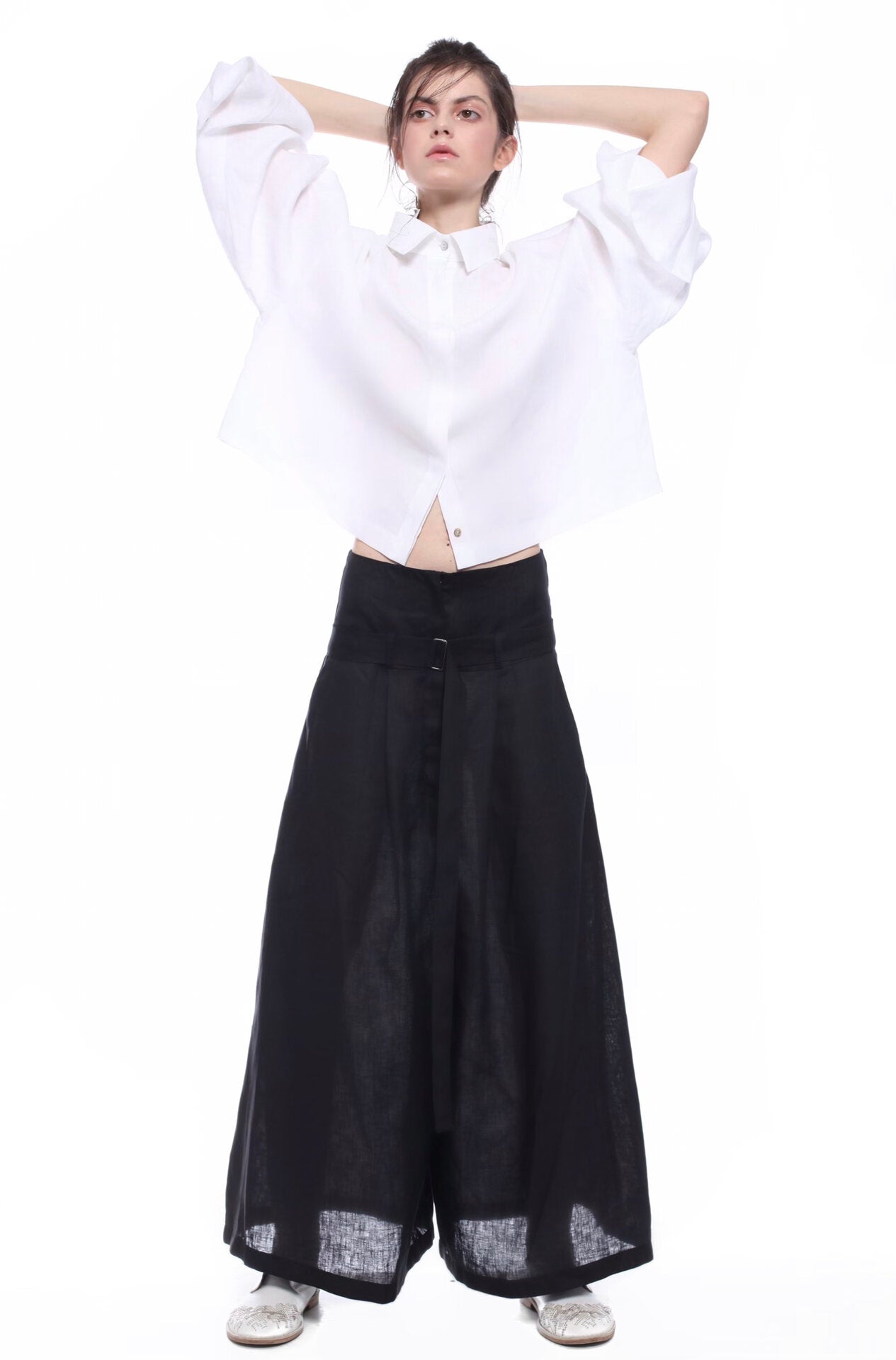 WIDE LINEN AND COTTON LOW CROTCH TROUSERS WITH ADJUSTABLE BELT. THE WIDTH MAKES IT CONFORTABLE AND ENVELOPING. IT FITS ALL TIPE OF SHIRTS LONGER AND SHORTER ONES.
