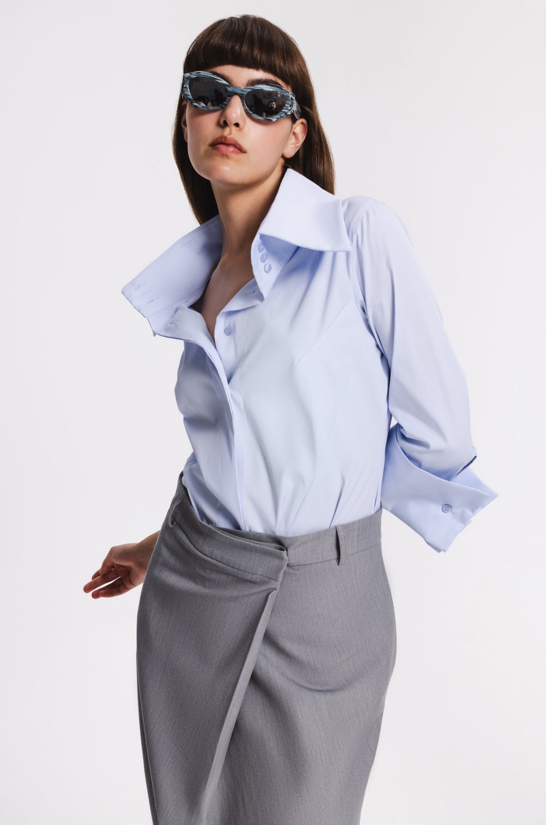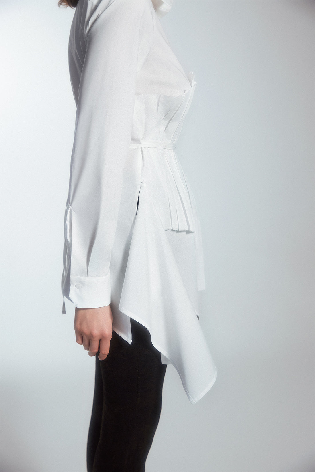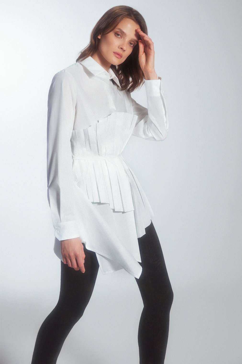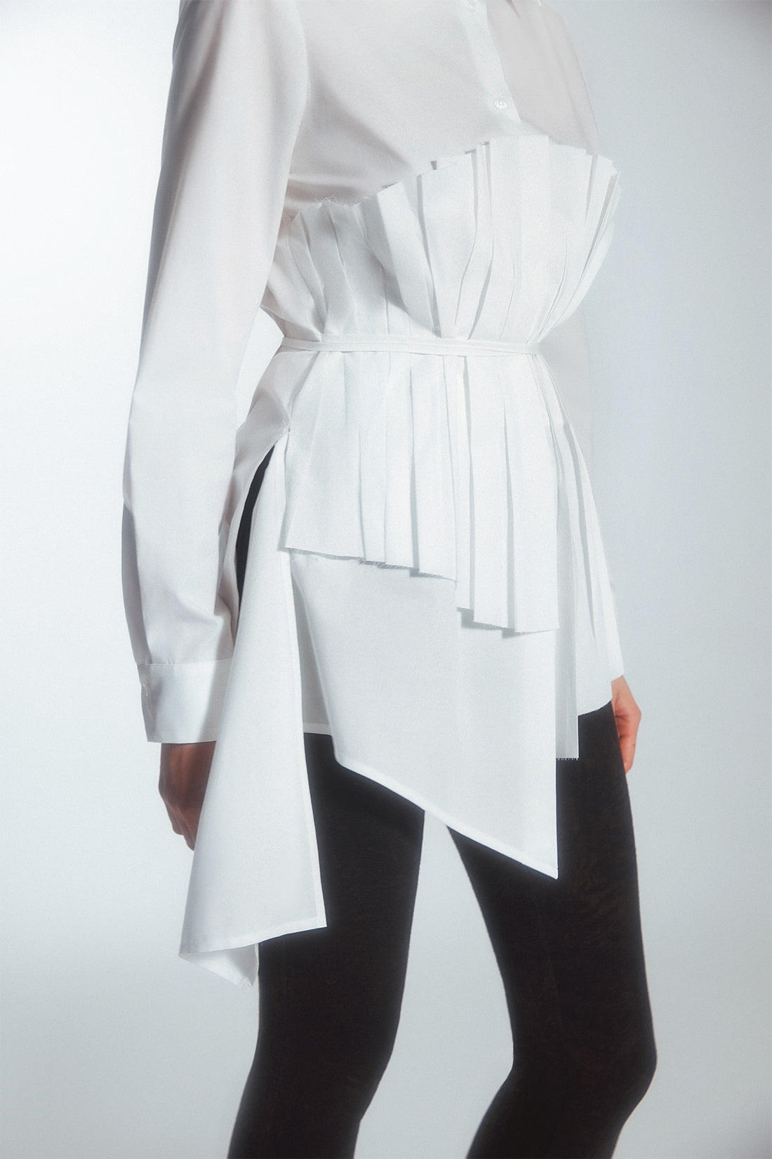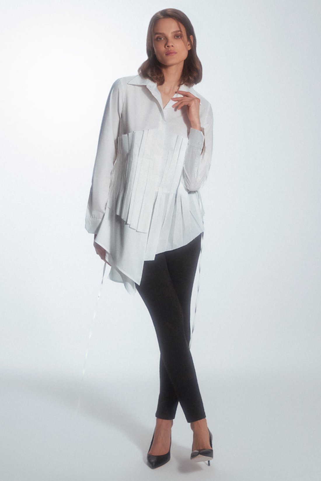 Crafted with impeccable precision, this shirts transforms simplicity into an art form, featuring avant-garde silhouettes that redefine elegance. Its crisp lines, luxurious fabric, and innovative tailoring make it a timeless statement, perfect for the modern women who embraces both versatility and bold style.