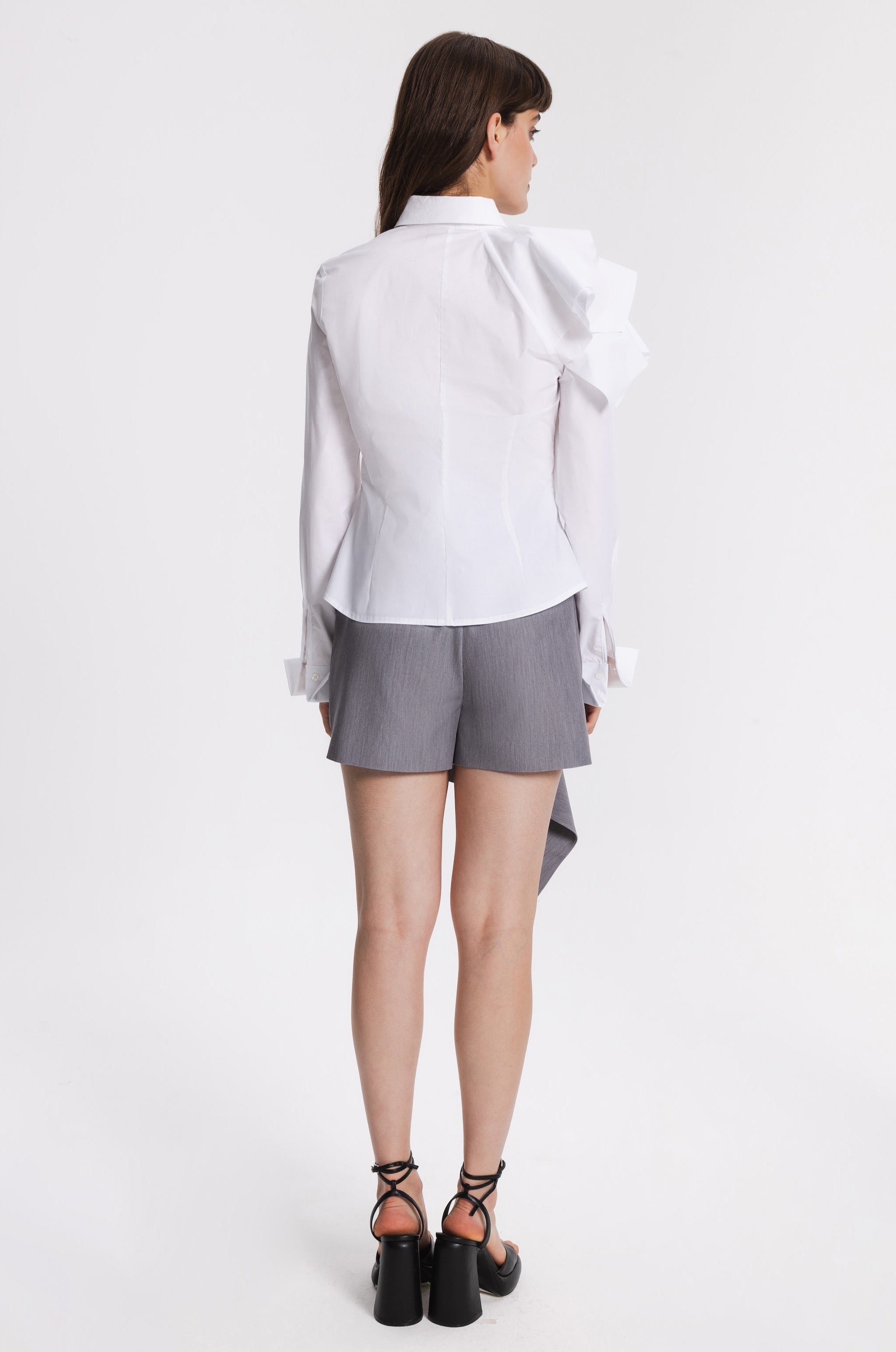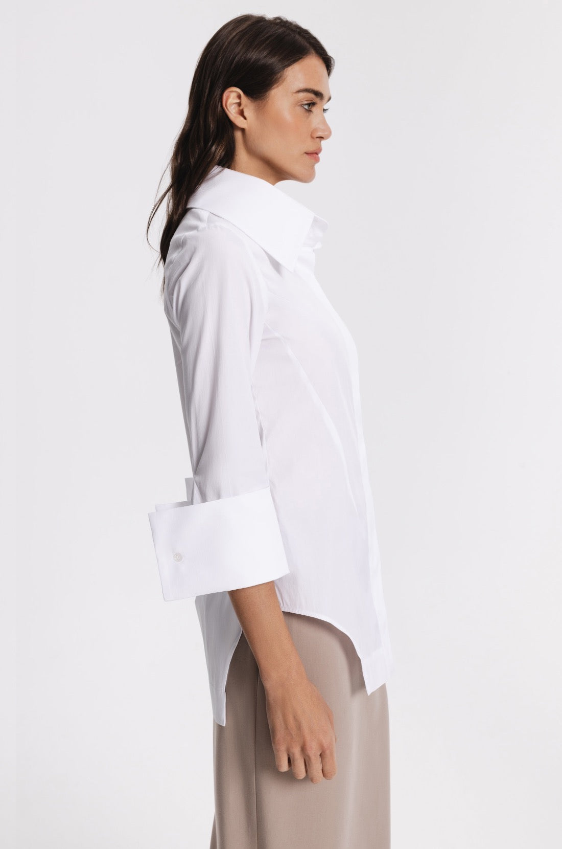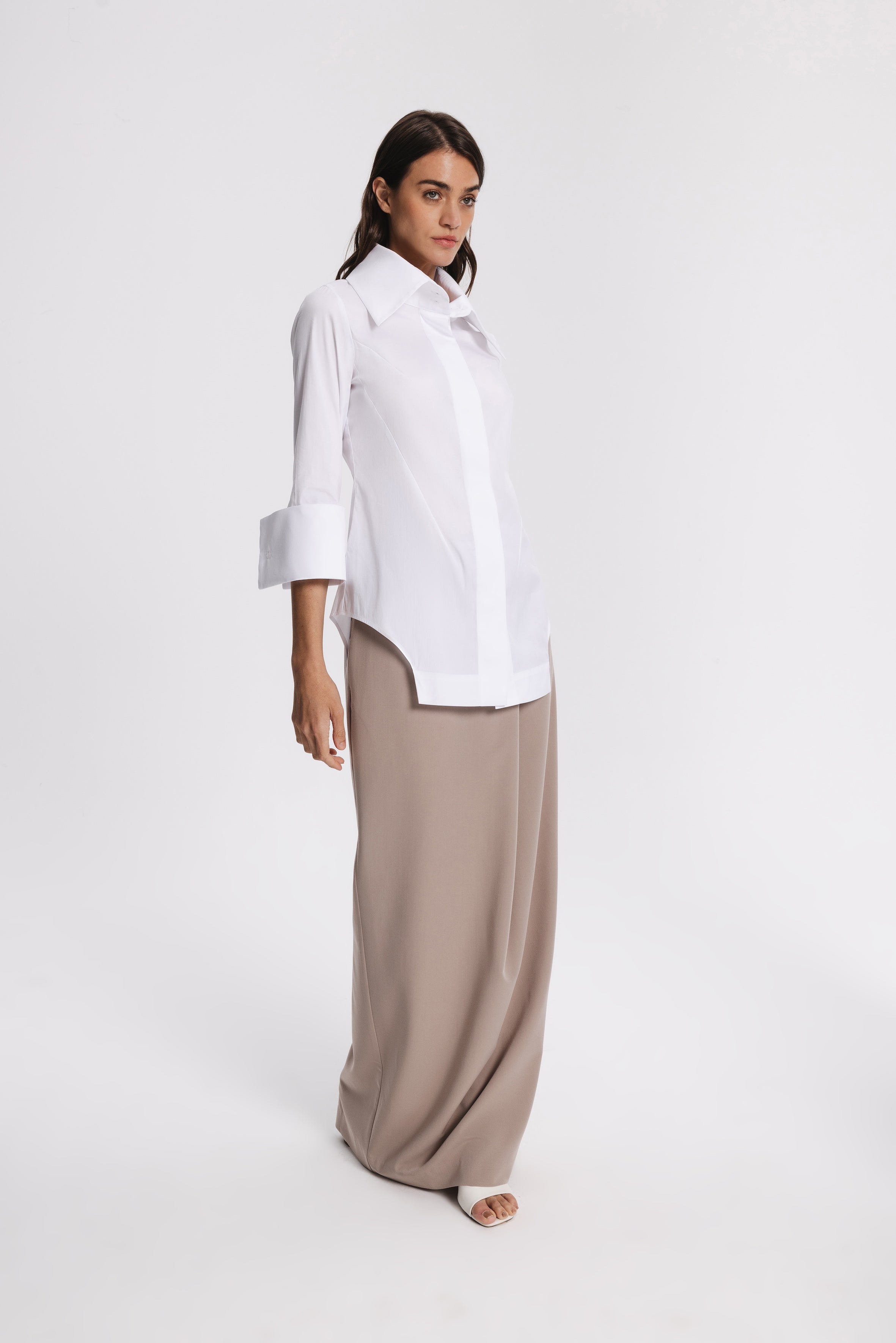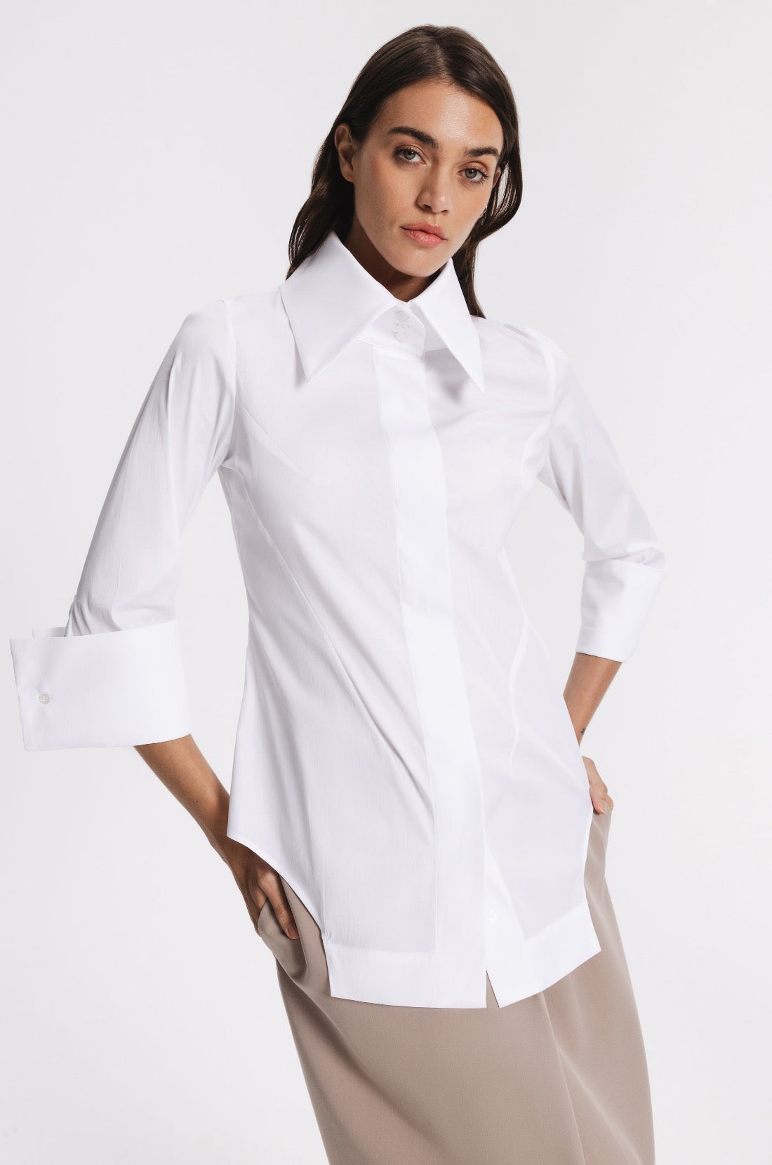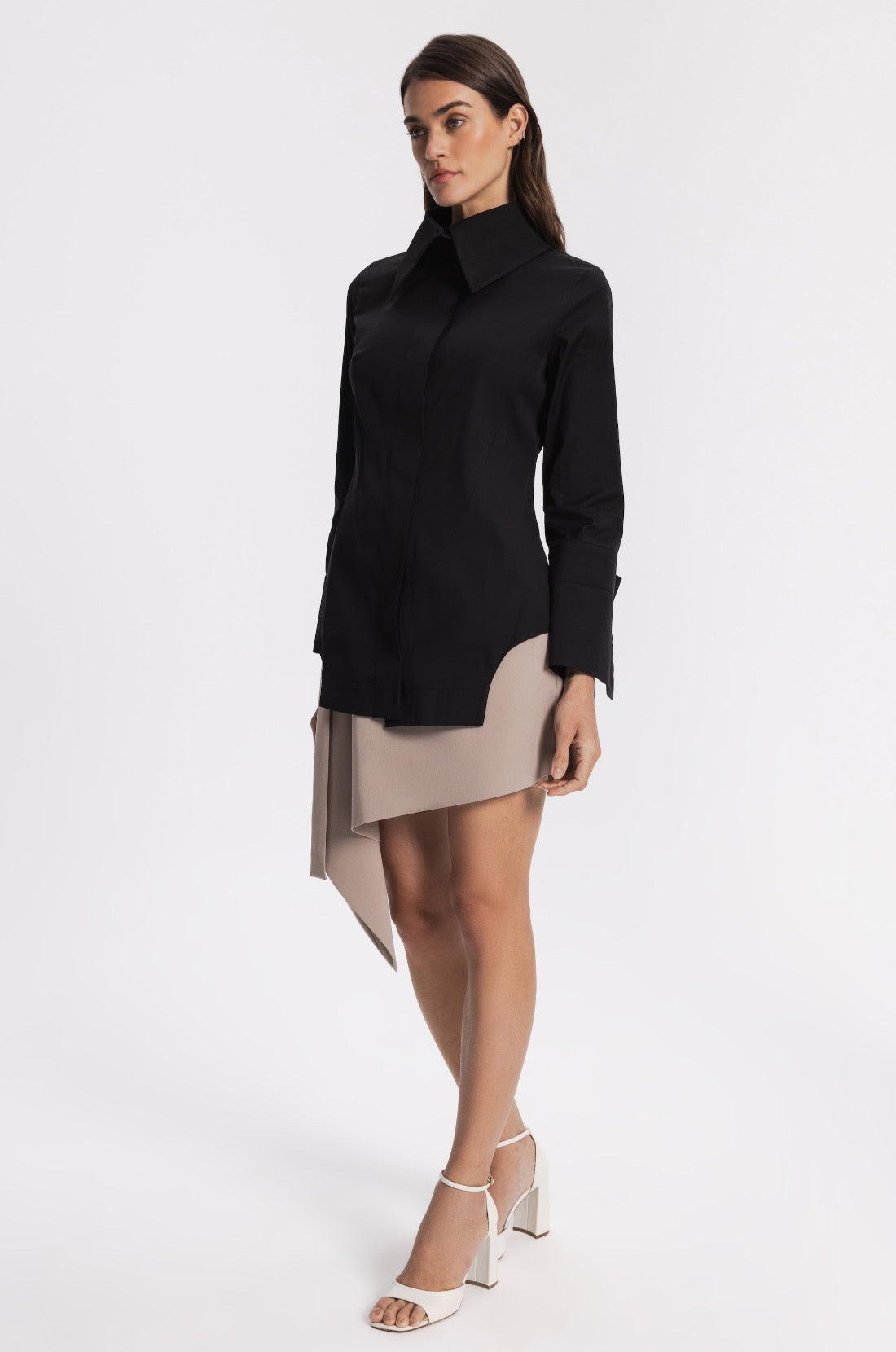 Crafted with impeccable precision, this shirts transforms simplicity into an art form, featuring avant-garde silhouettes that redefine elegance. Its crisp lines, luxurious fabric, and innovative tailoring make it a timeless statement, perfect for the modern women who embraces both versatility and bold style.