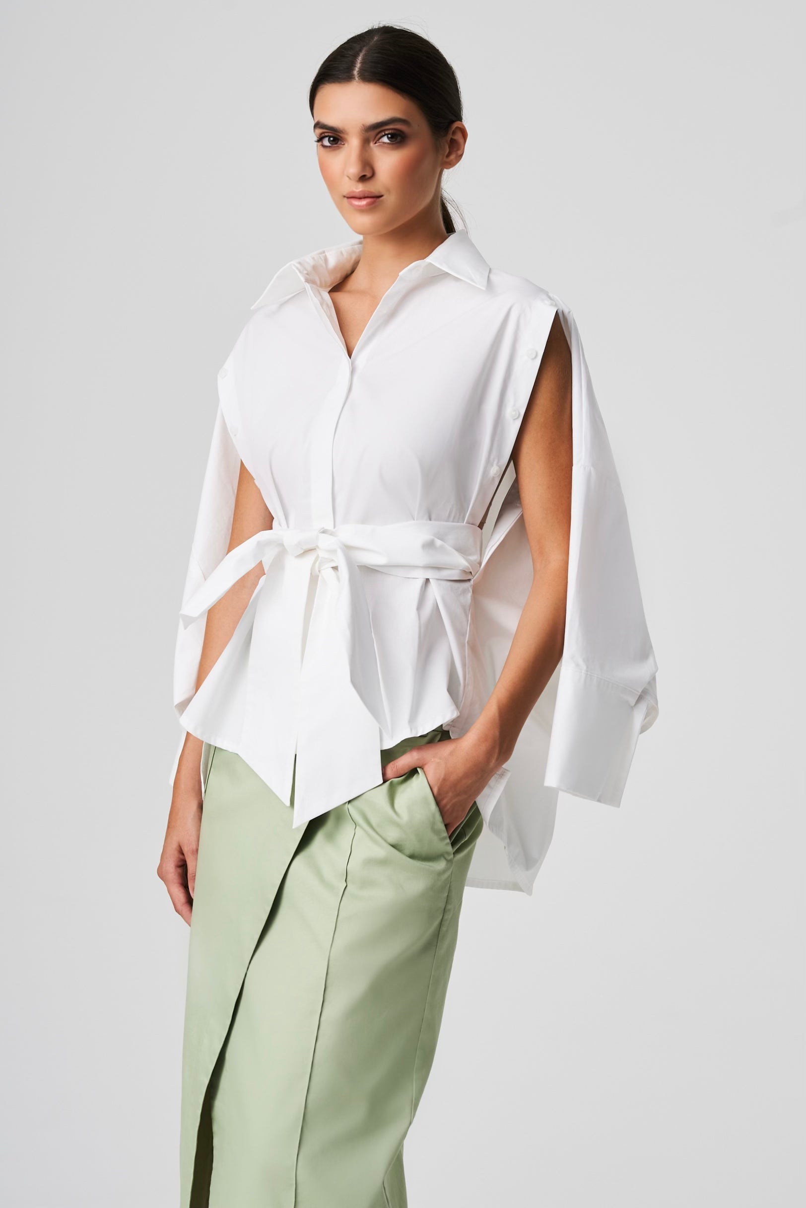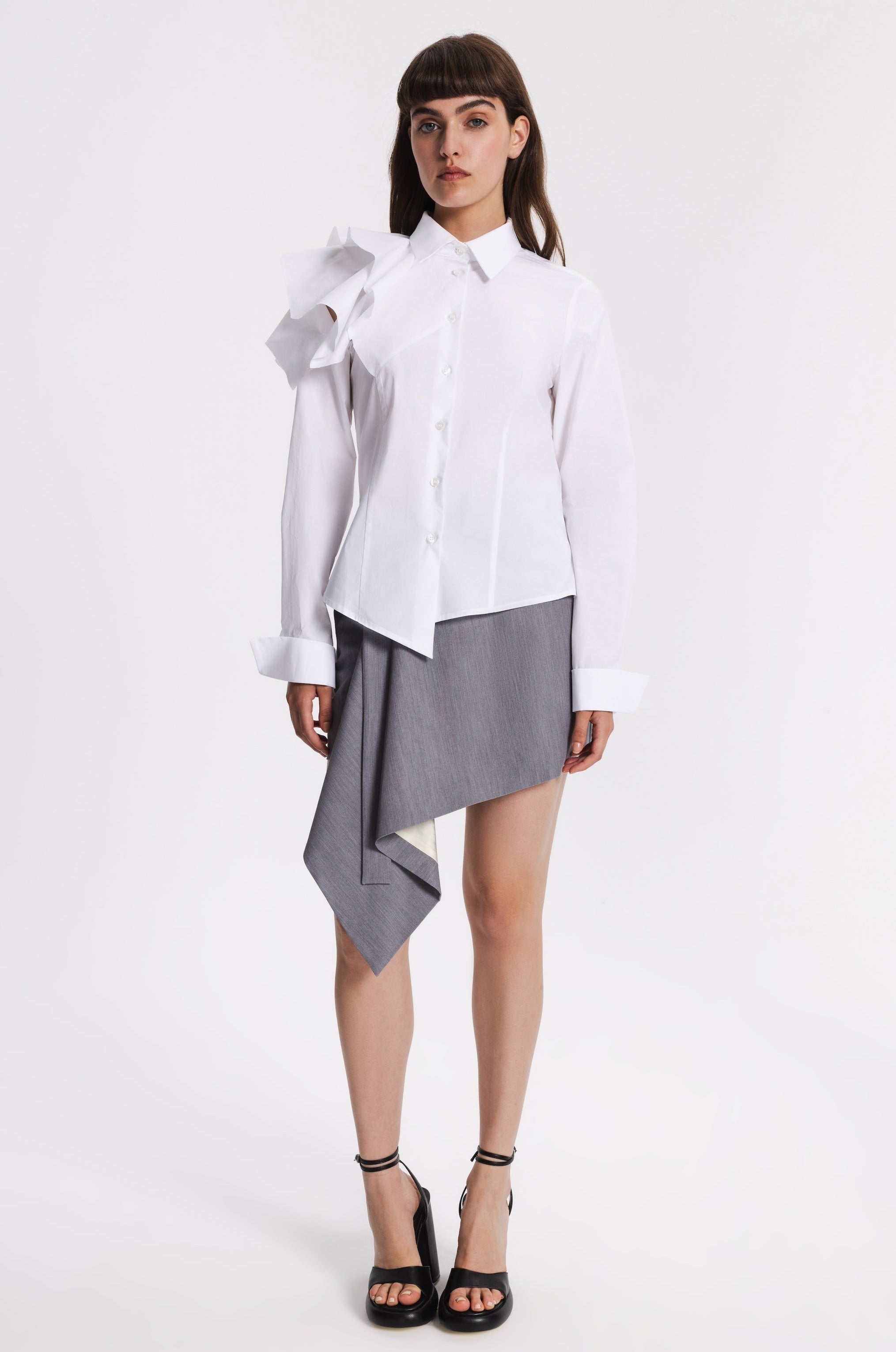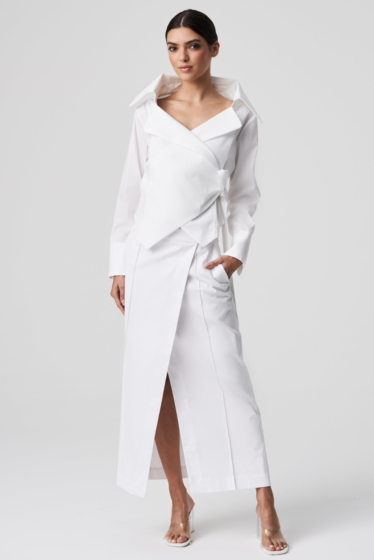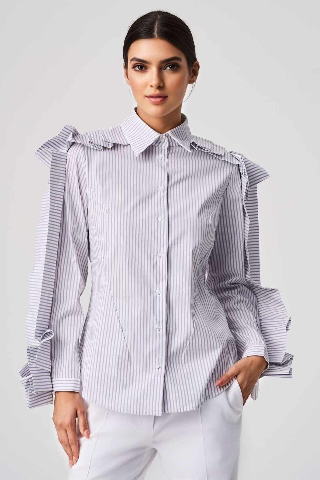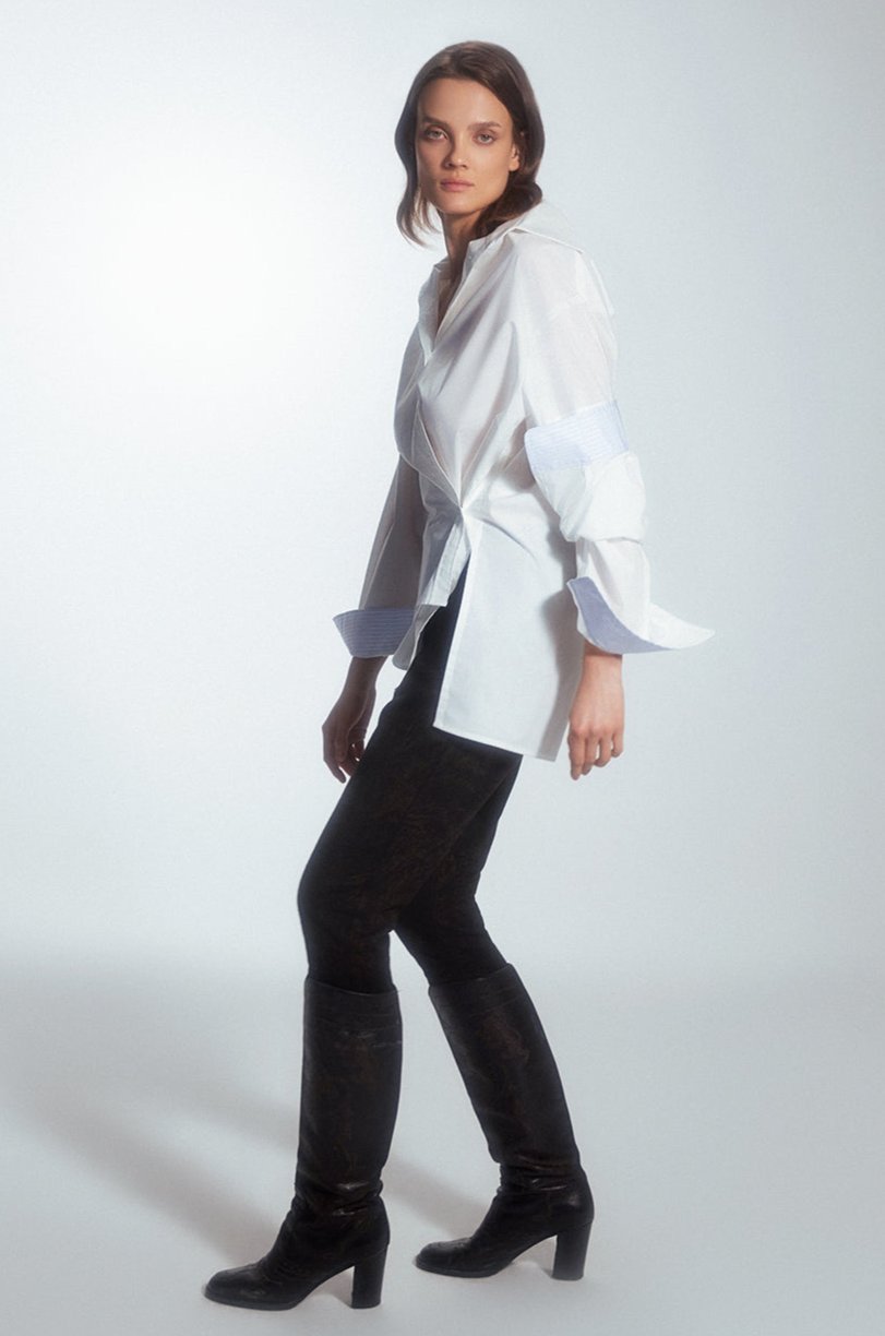 Crafted with impeccable precision, this shirts transforms simplicity into an art form, featuring avant-garde silhouettes that redefine elegance. Its crisp lines, luxurious fabric, and innovative tailoring make it a timeless statement, perfect for the modern women who embraces both versatility and bold style.