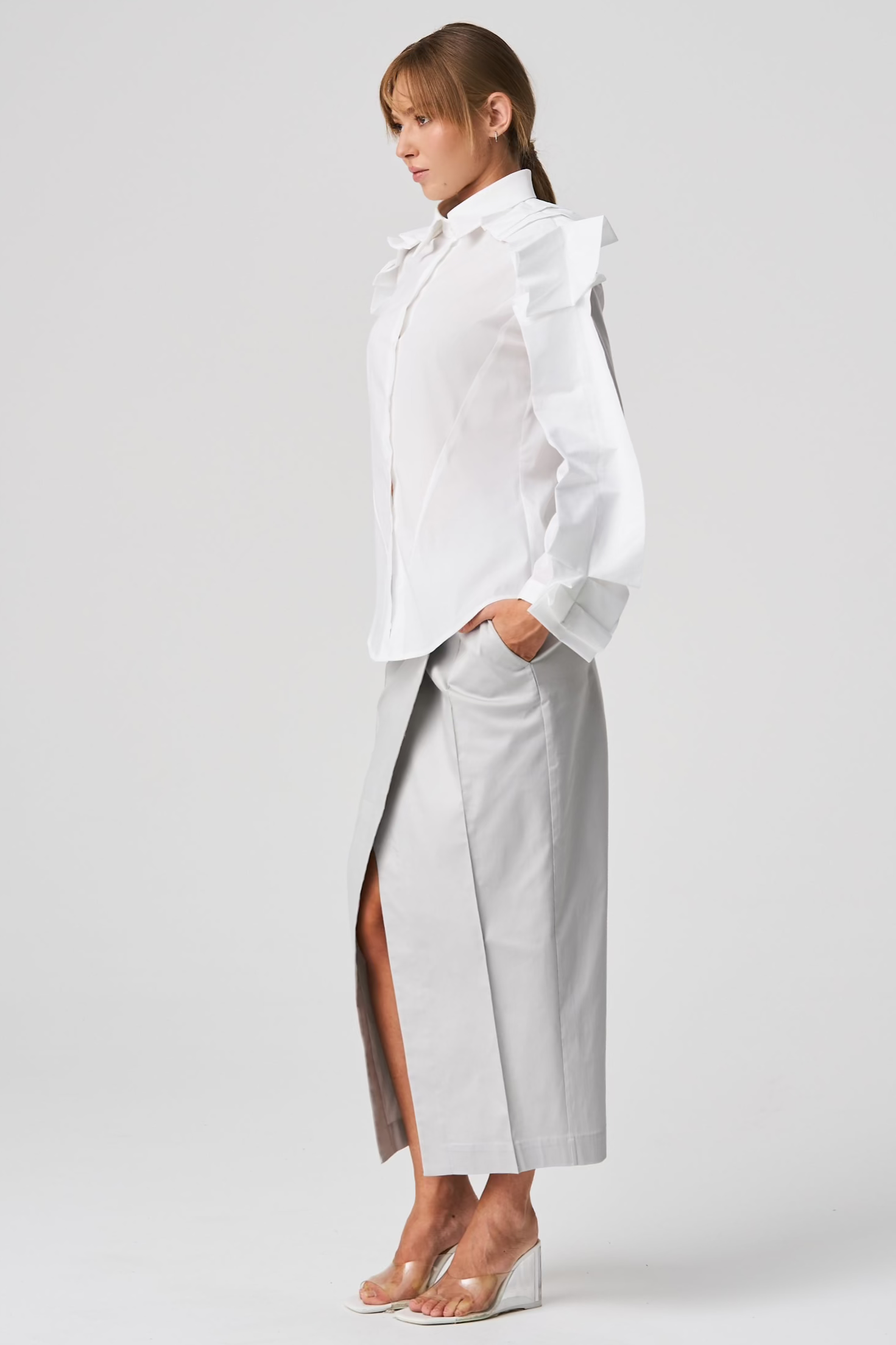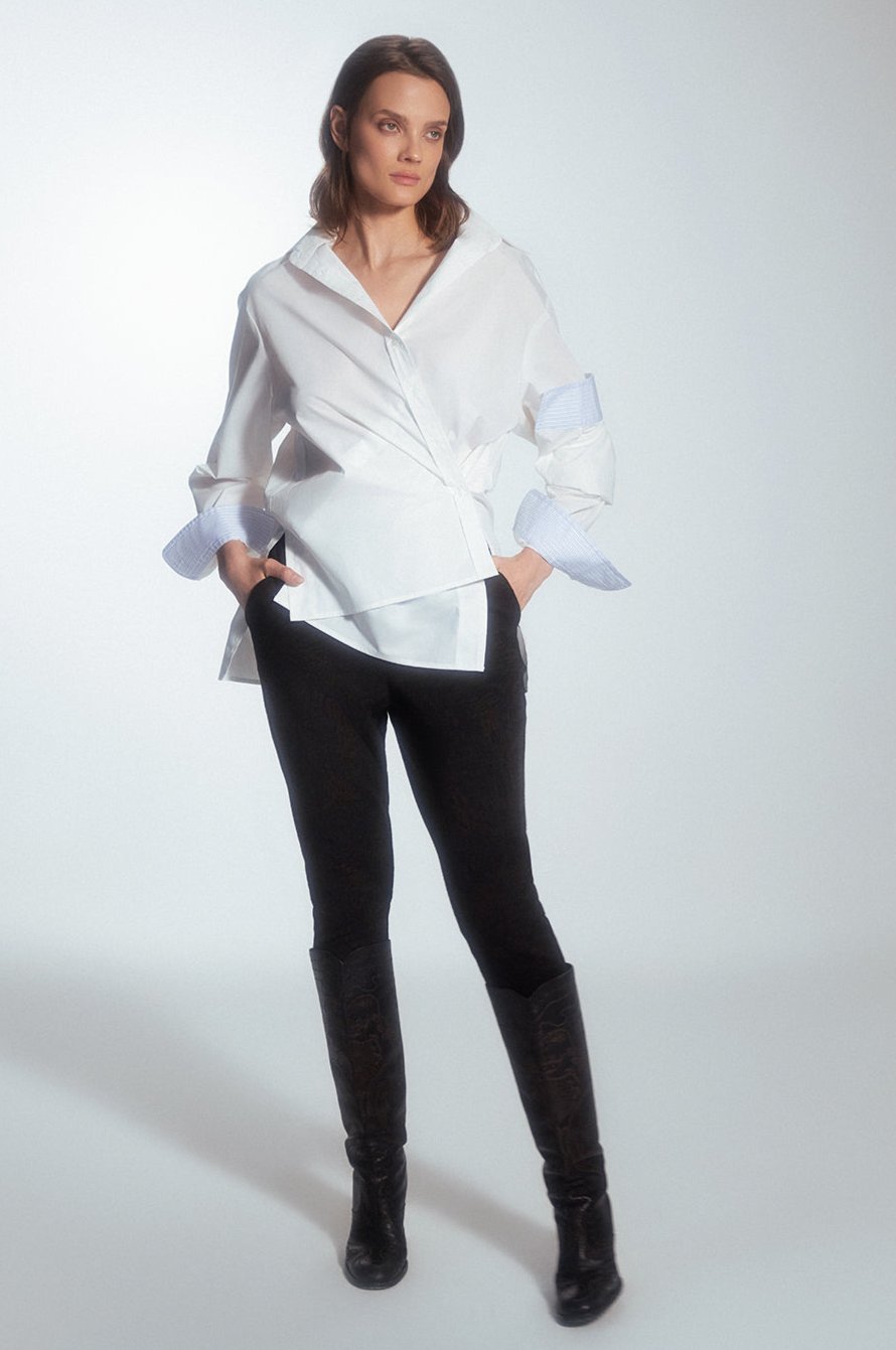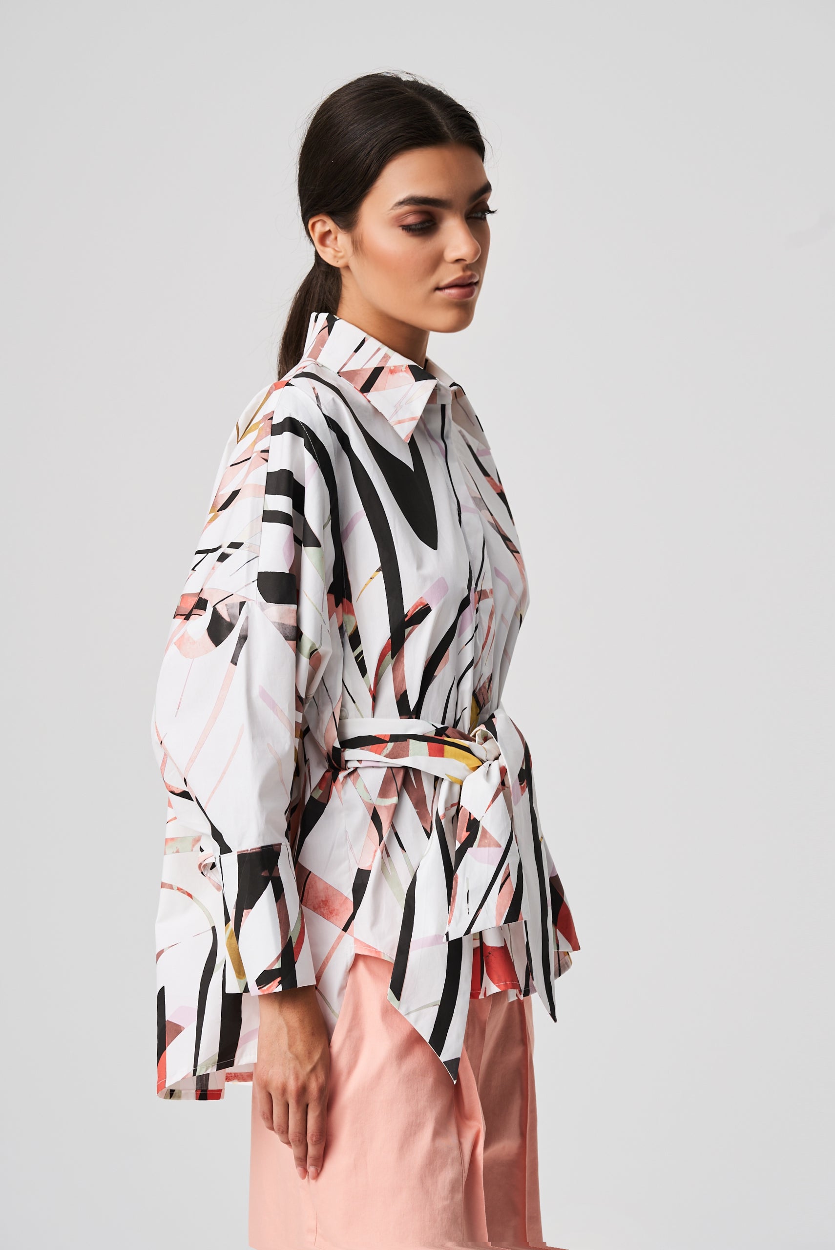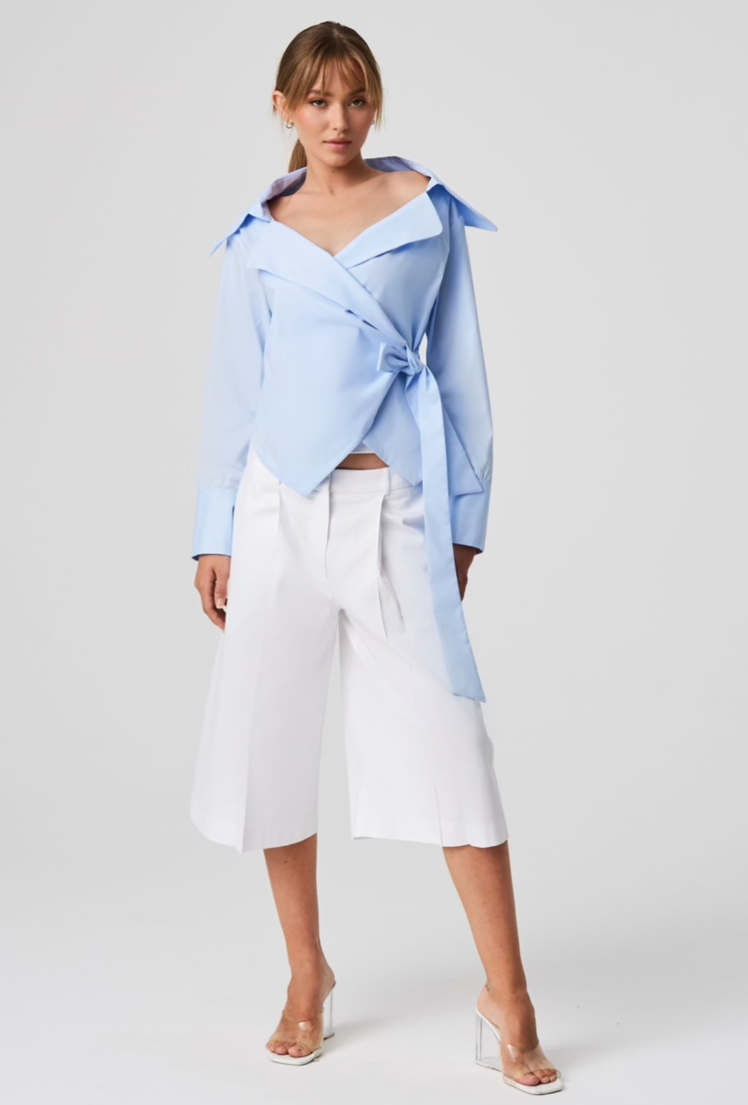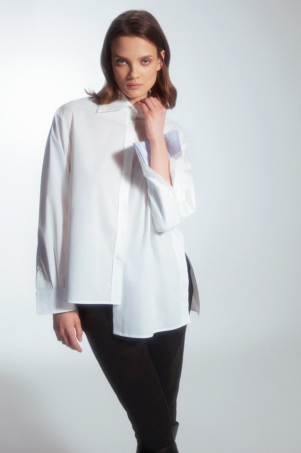 Crafted with impeccable precision, this shirts transforms simplicity into an art form, featuring avant-garde silhouettes that redefine elegance. Its crisp lines, luxurious fabric, and innovative tailoring make it a timeless statement, perfect for the modern women who embraces both versatility and bold style.