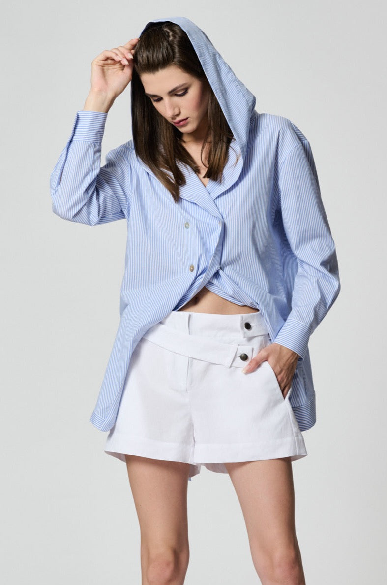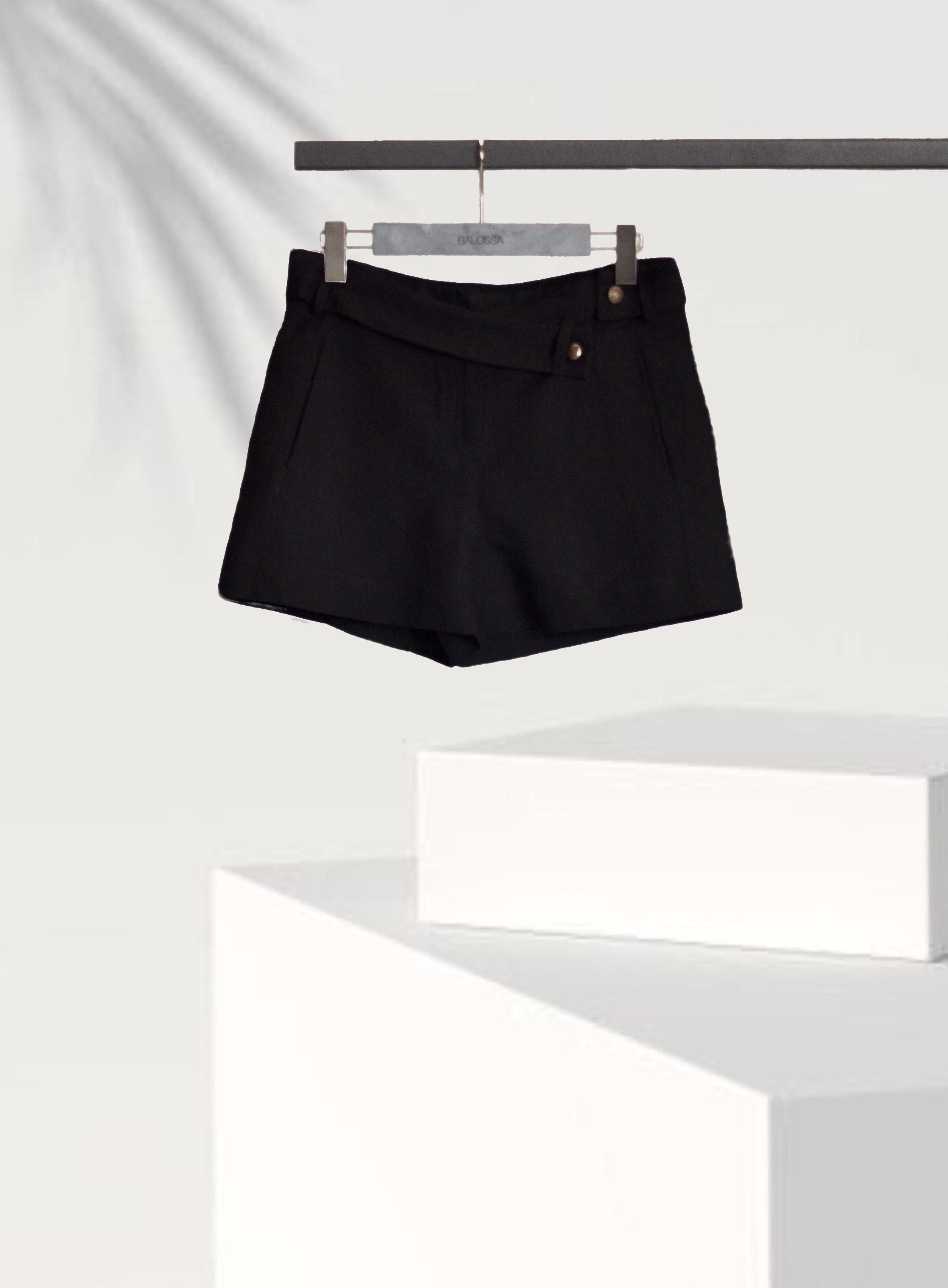 Regular fit shorts. Front zip closure, the belt that wraps from one side of the hip and is fixed at the front transversely with a metal button. Front slant pockets, a welt poscket at the back.