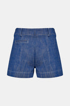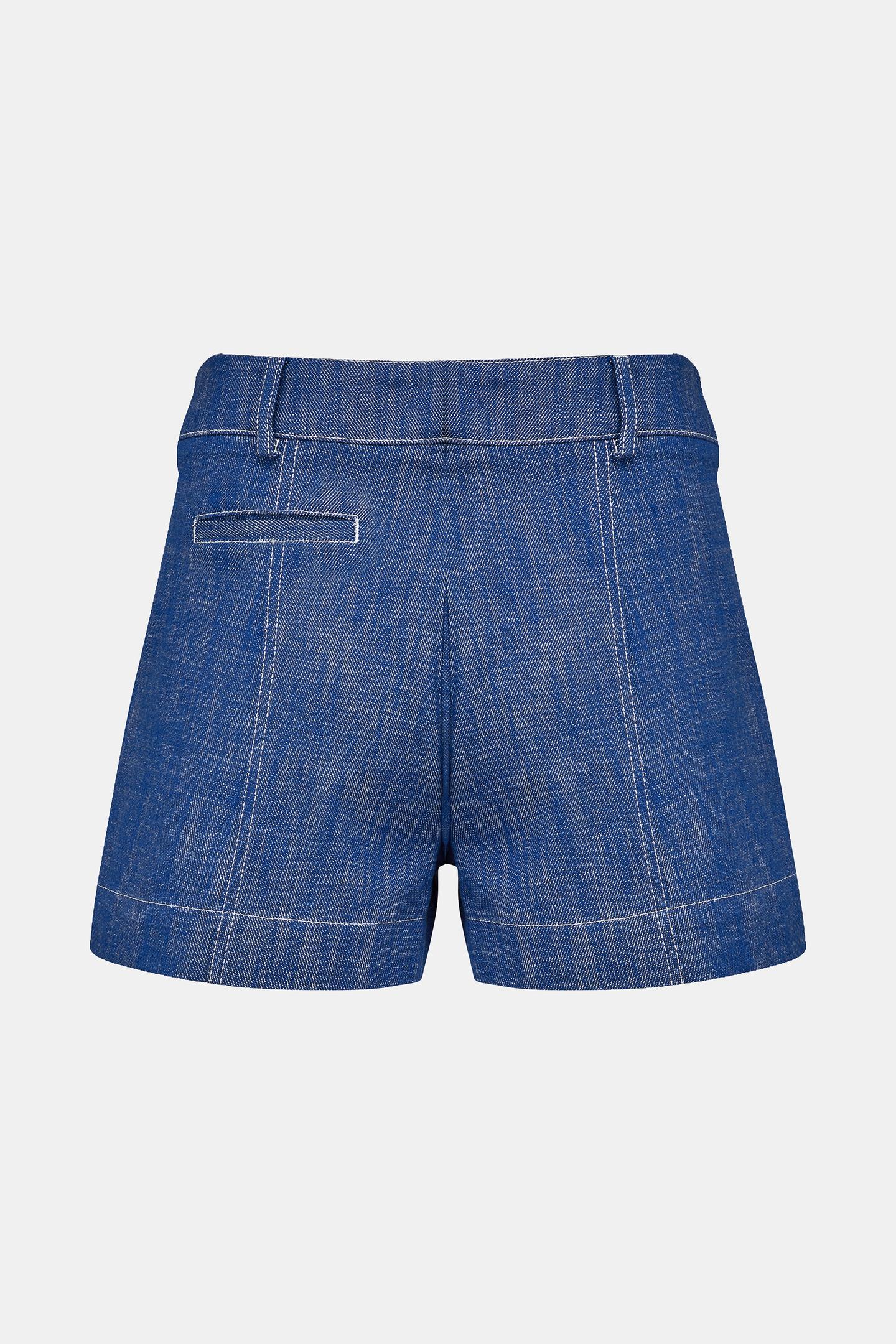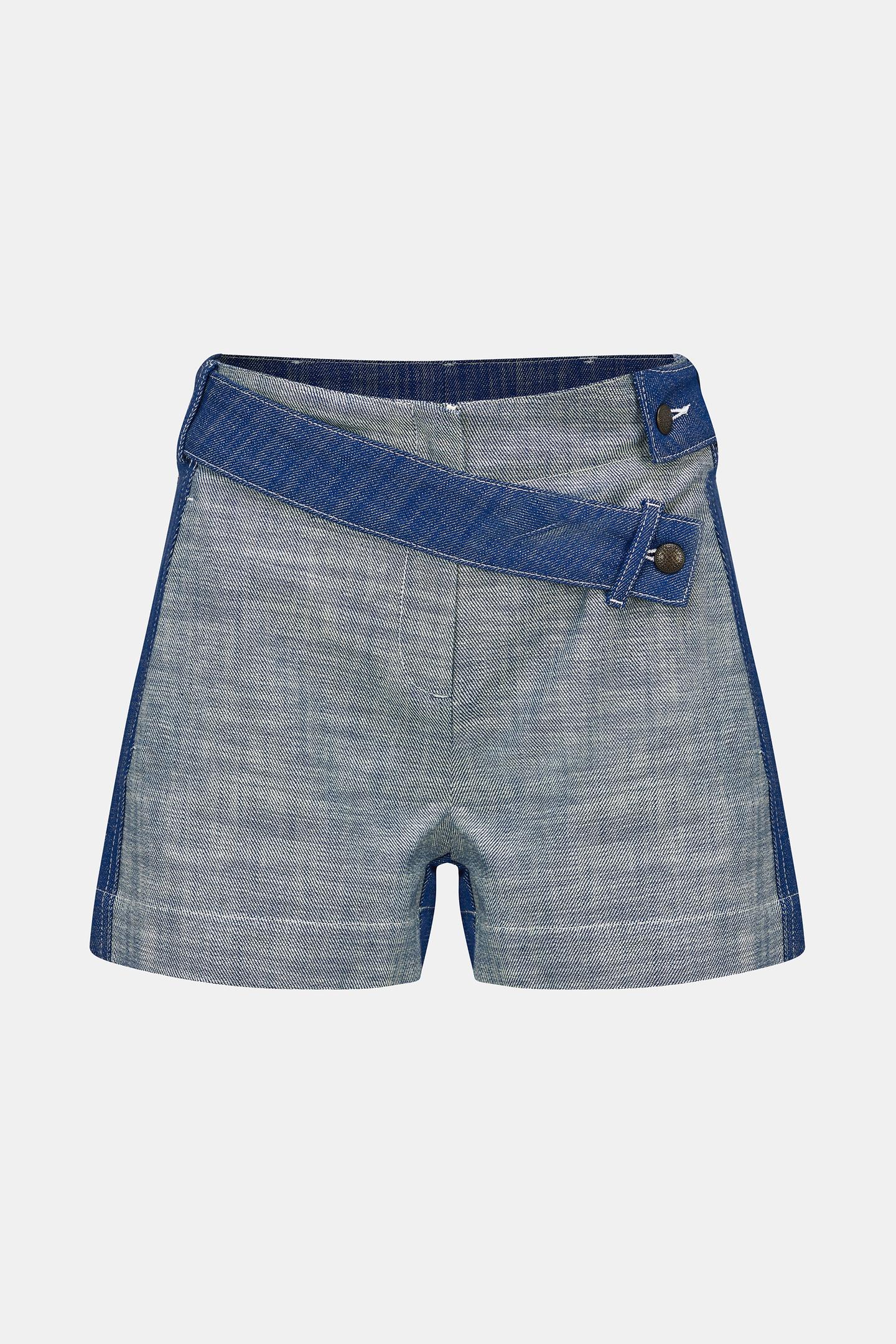 Regular-fit denim shorts. Front zip closure, the belt in contrasting color that wraps from one side of the hip and is fixed at the front transversely with a metal button. Front slant pockets, a welt poscket at the back.