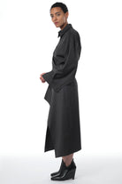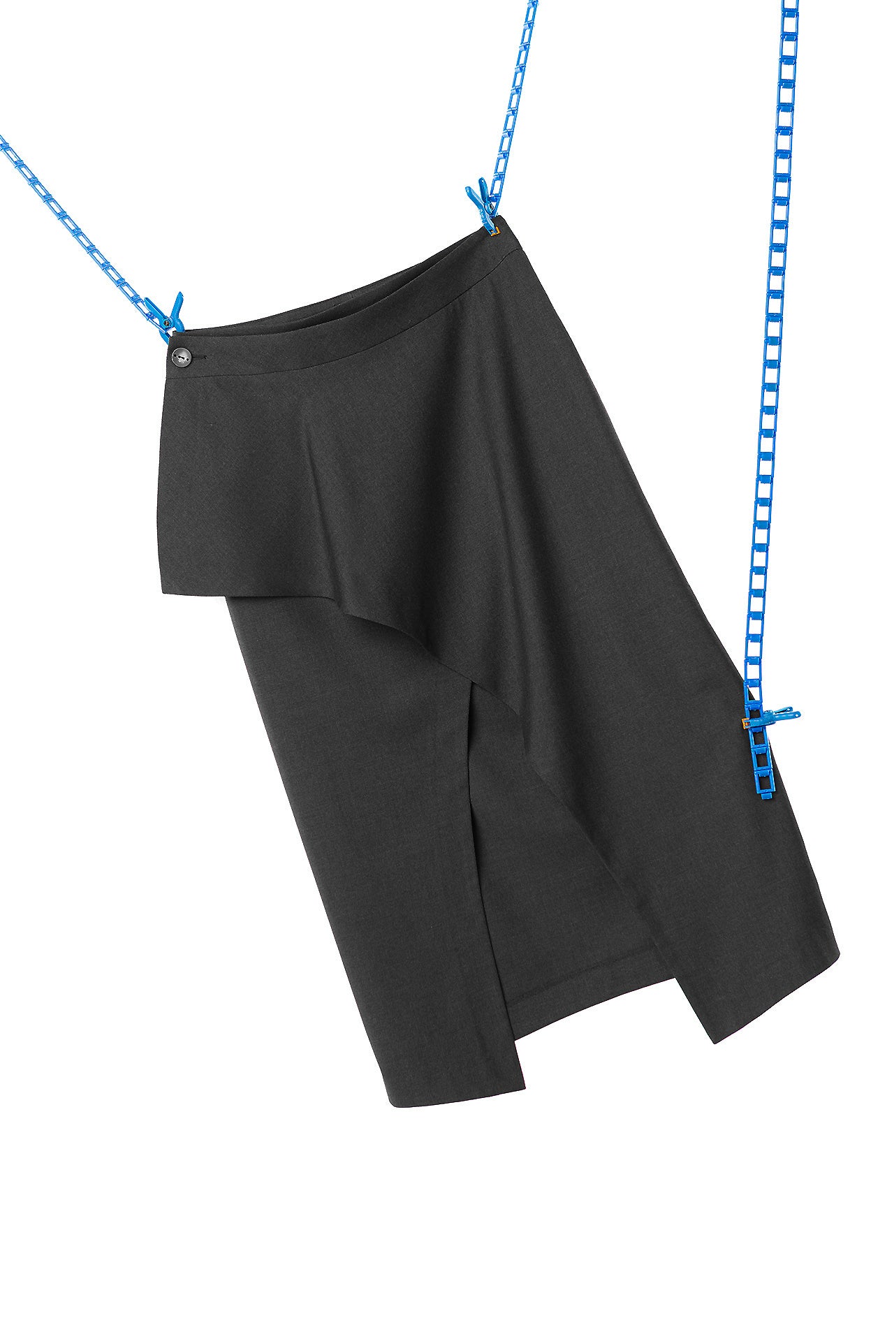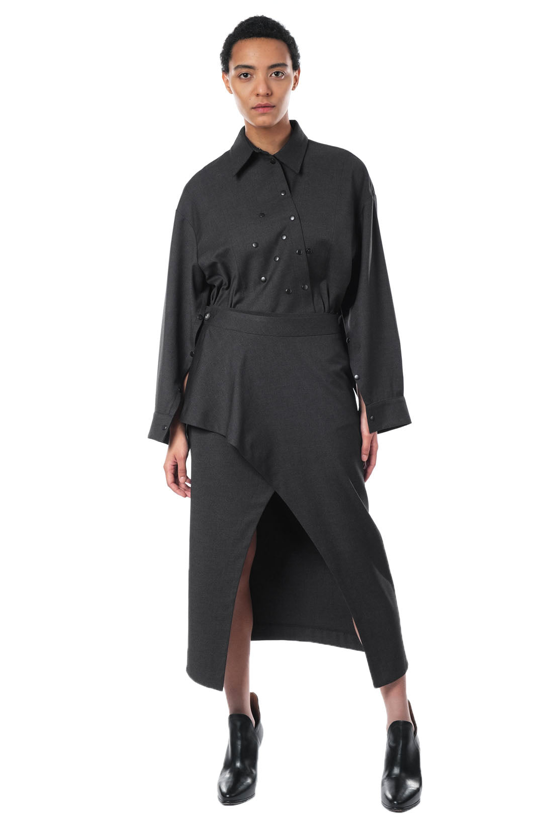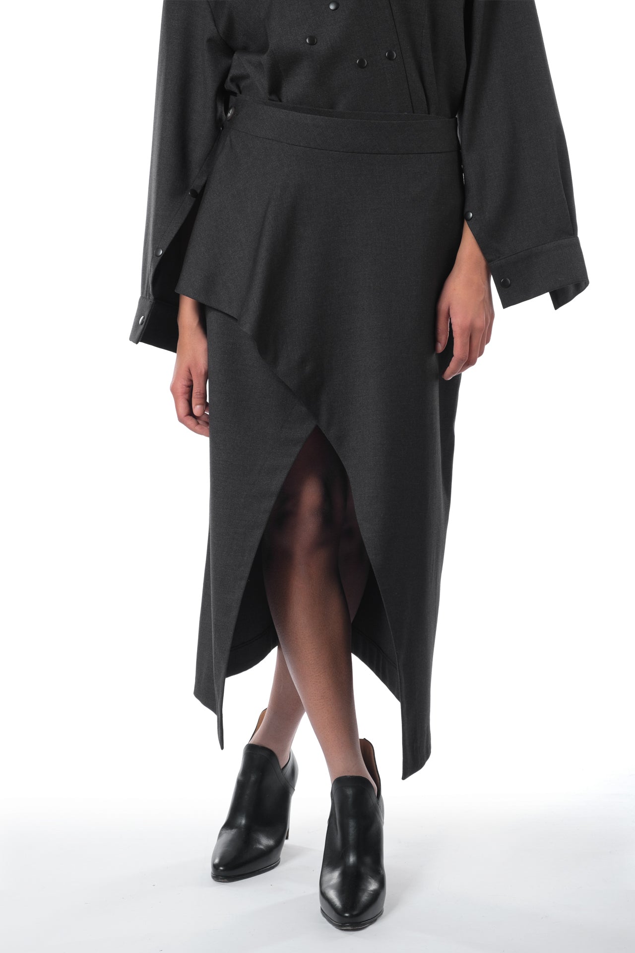 ASYMMETRIC SKIRT LONG AT THE BACK AND SHORT AT THE FRONT SIDE. SKIRT FOLDS OVER TO CLOSE AT TWO BUTTONS LOCATED ON THE HIP. MADE IN LIGHTWAIGHT WOOL SLTYLE FABRIC WITH HIGH WAIST. POCKETLESS.