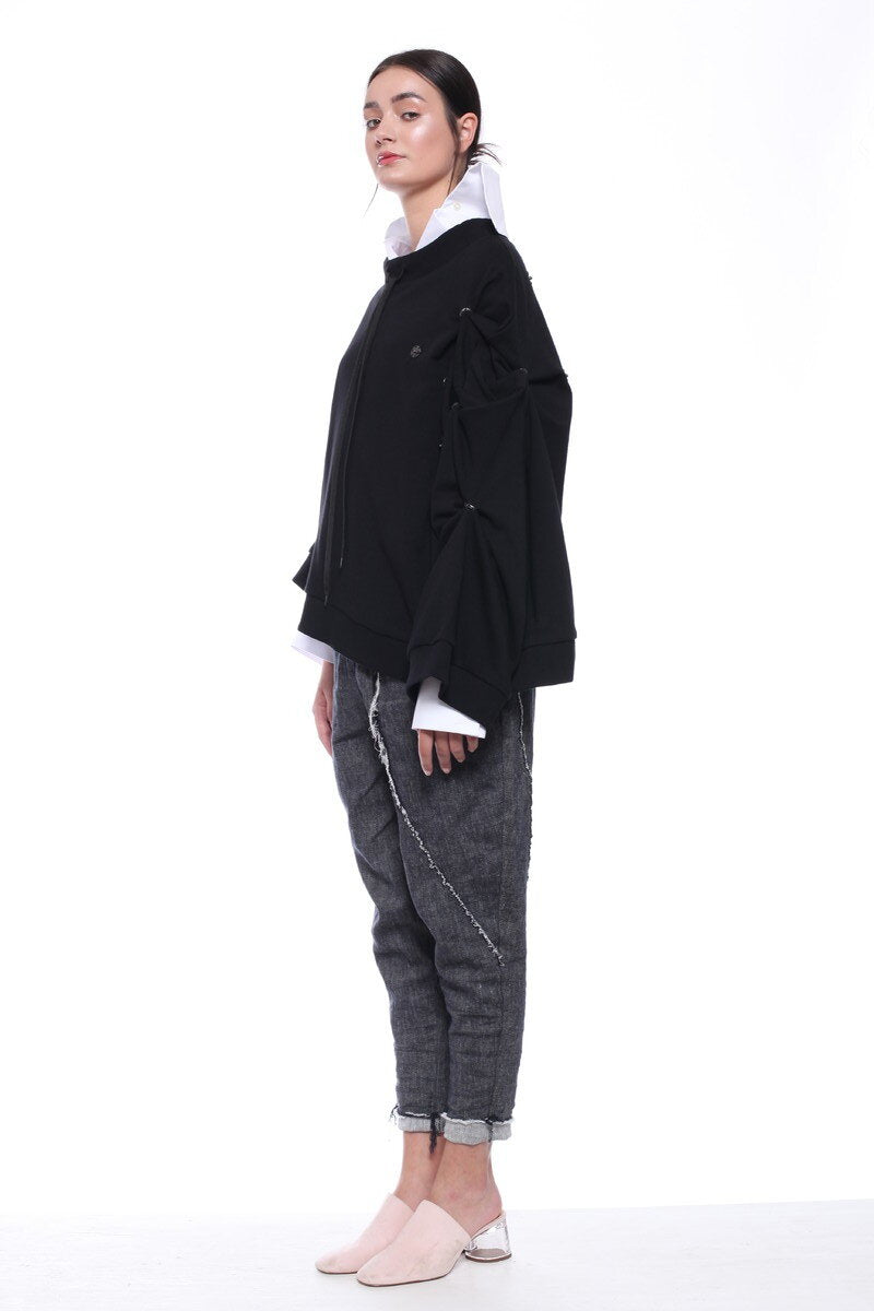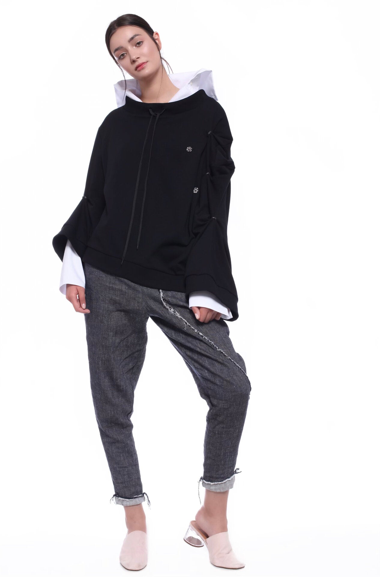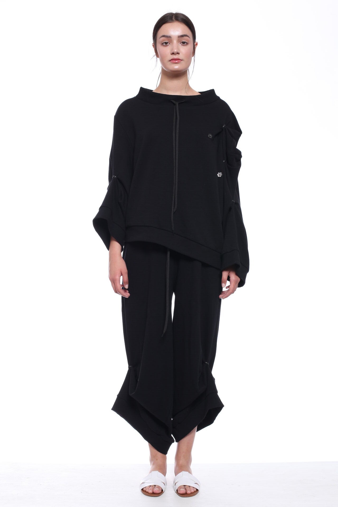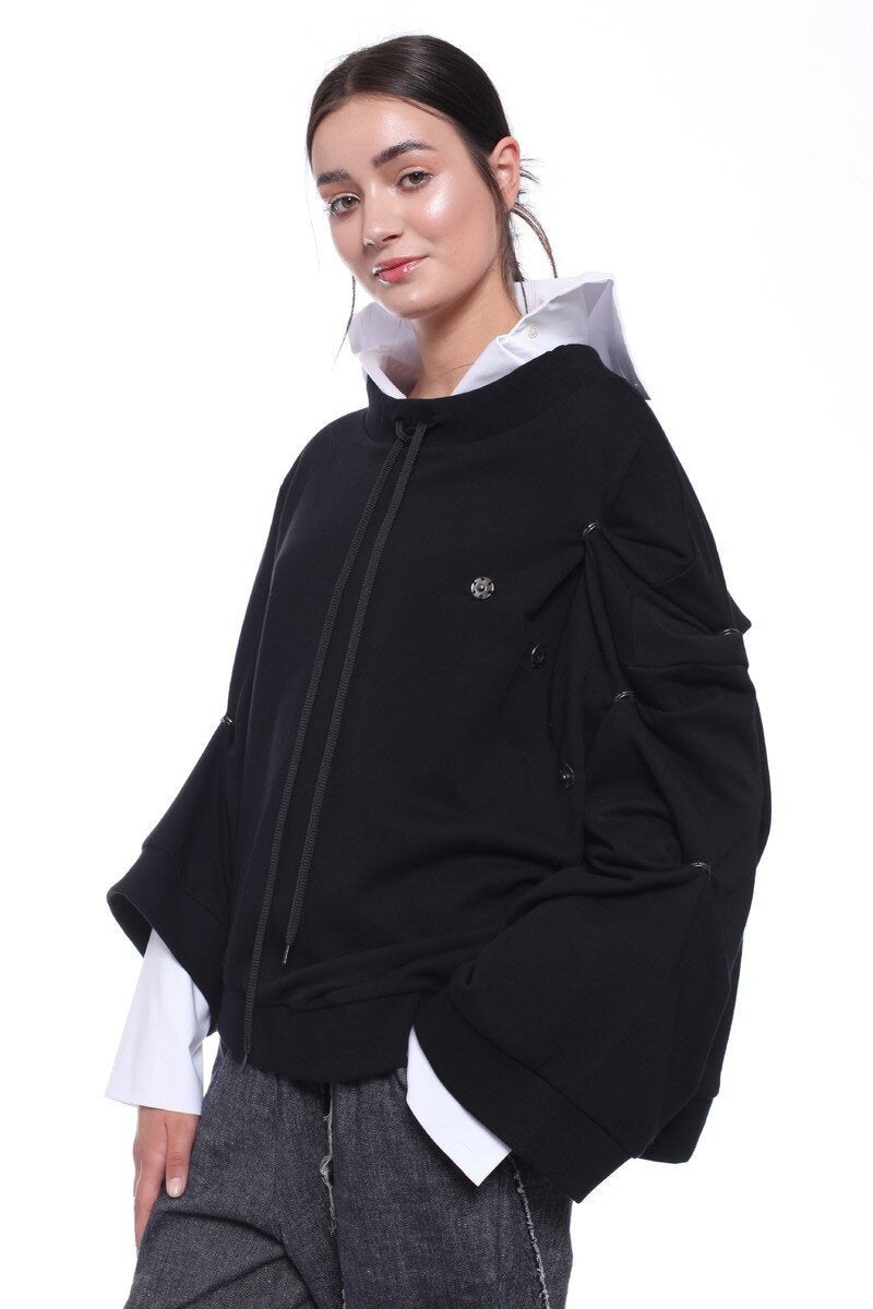 ASYMMETRIC LONG-SLEEVED UNSTRUCTURED JERSEY SWEATSHIRT, DECORATIVE SNAP FASTENERS ALLOW ADJUSTING SLEEVE LENGTH. DESIGNED AS A REFINED, EVERYDAY OUTFIT.
