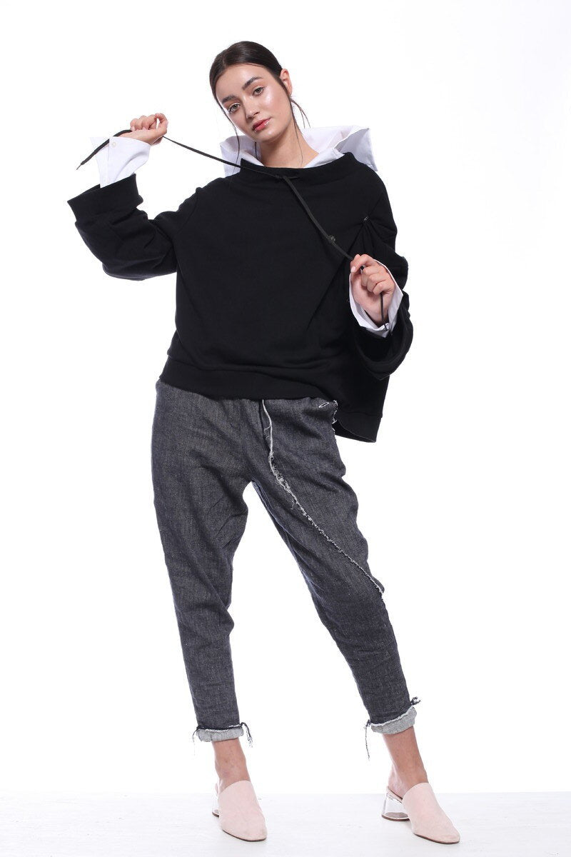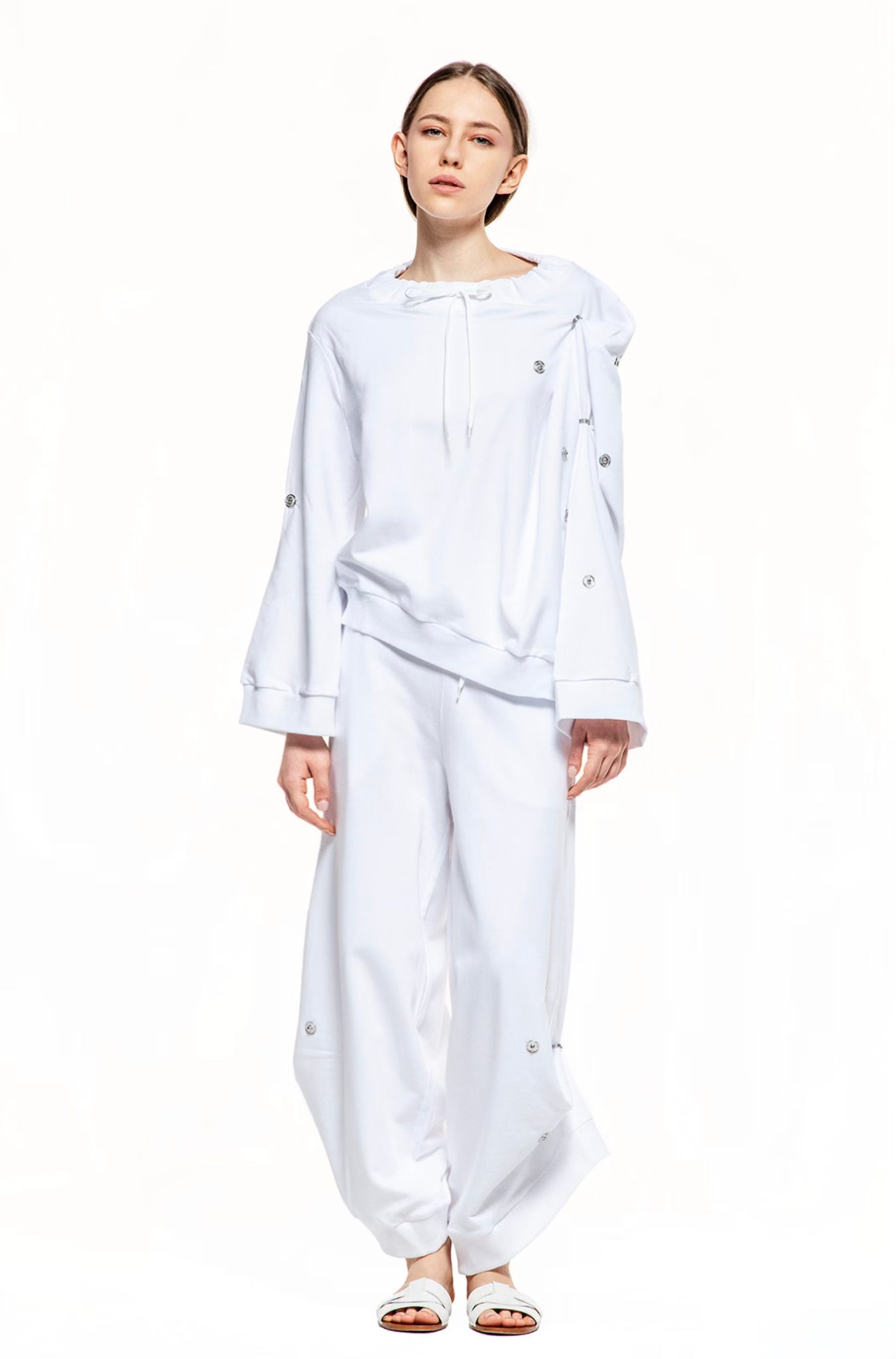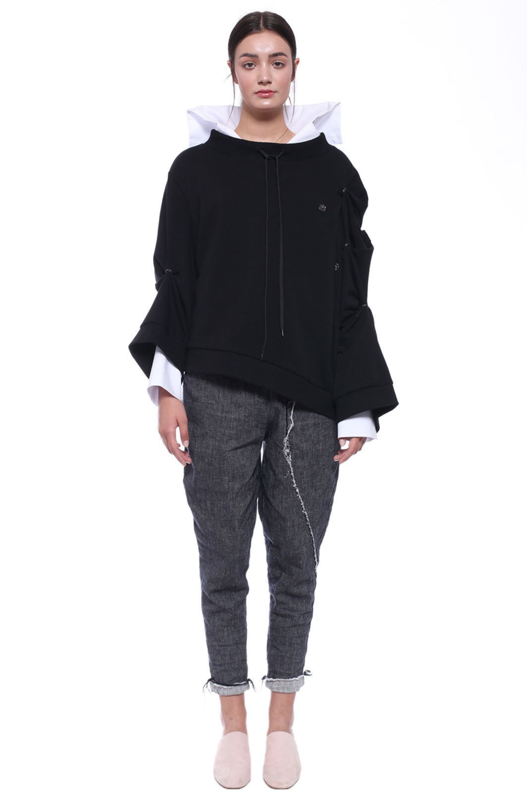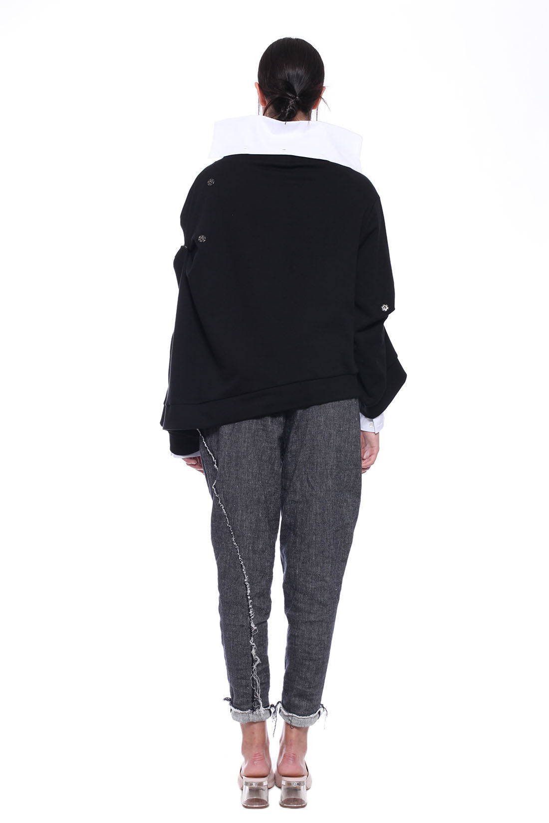 ASYMMETRIC LONG-SLEEVED UNSTRUCTURED JERSEY SWEATSHIRT, DECORATIVE SNAP FASTENERS ALLOW ADJUSTING SLEEVE LENGTH. DESIGNED AS A REFINED, EVERYDAY OUTFIT.