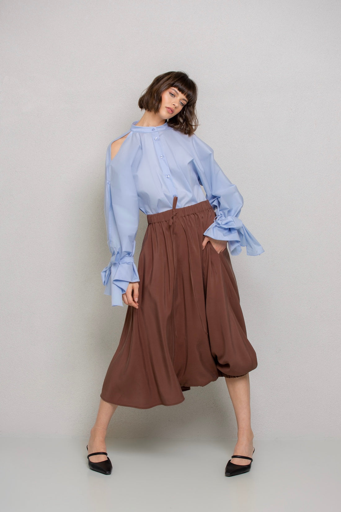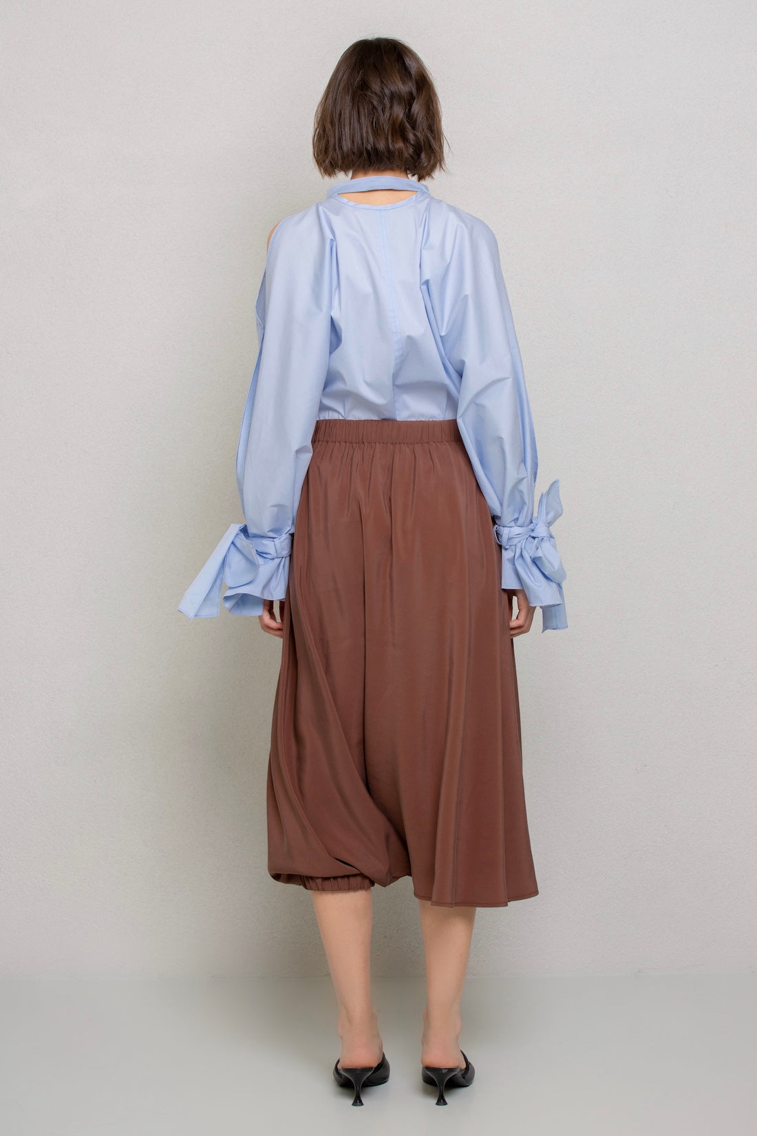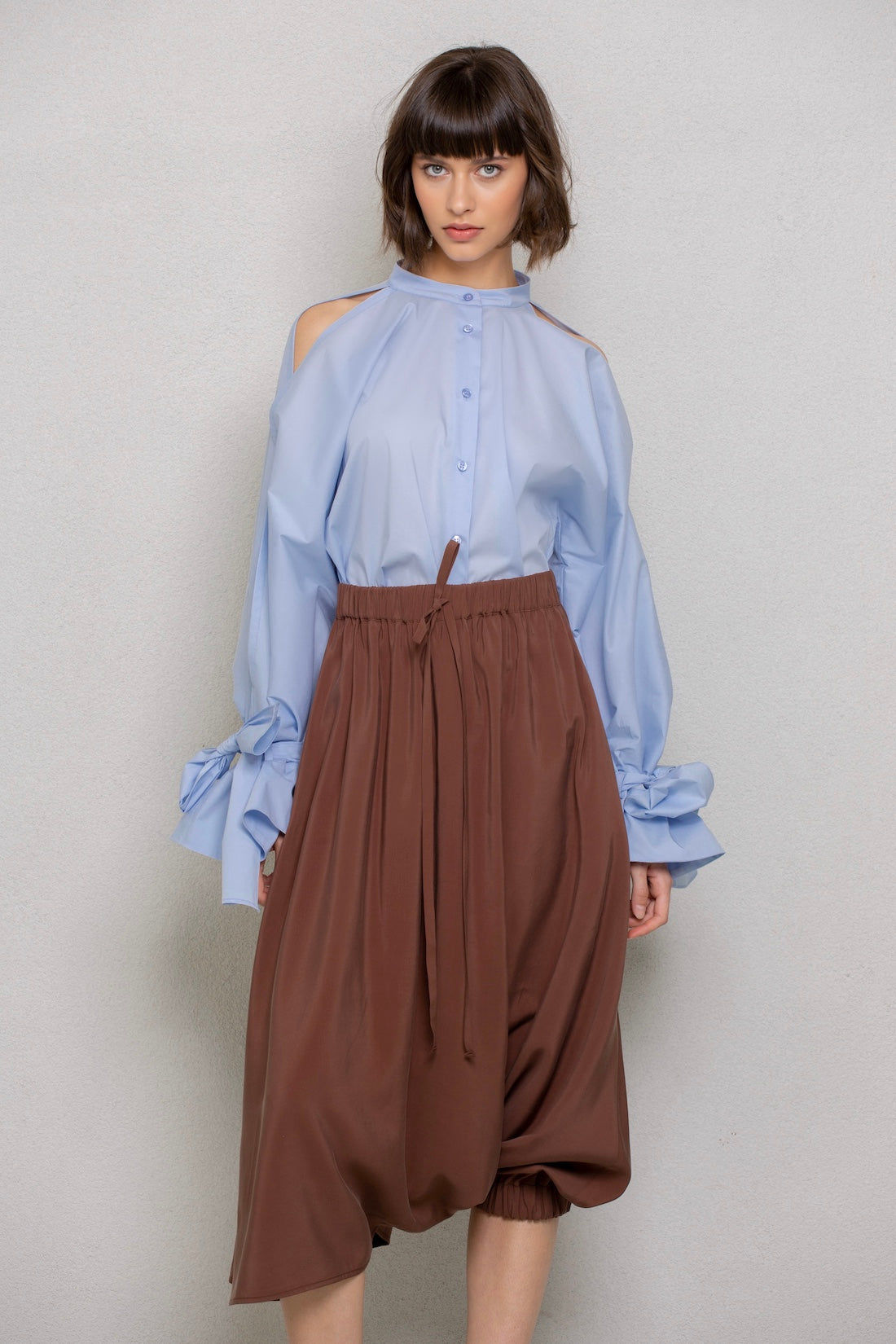 Midi skirt/trousers. Featuring a flared cut with an elasticated waistband and an drawstring. This garment functions as both a skirt and trousers: one leg is constructed like a pair of trousers, while the other remains skirt-like, two sides pockets . This version allows you to play with and personalize the piece in different ways.