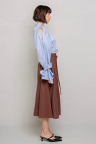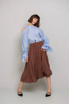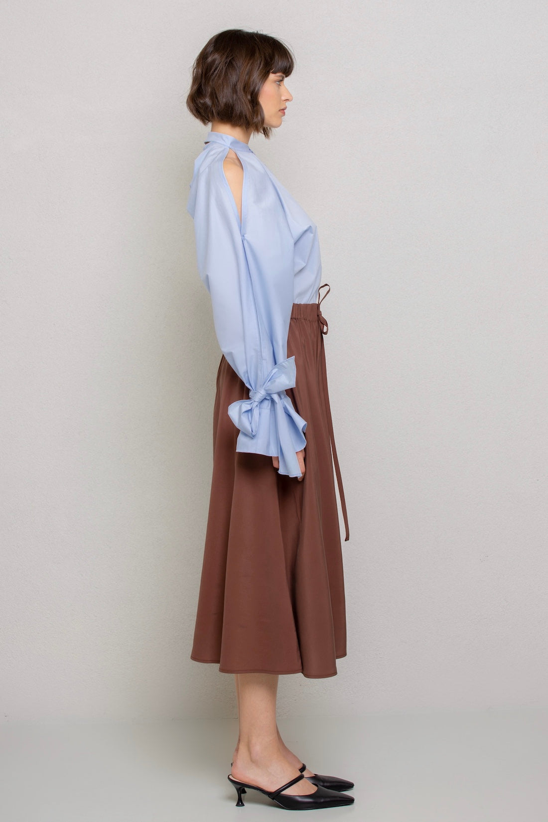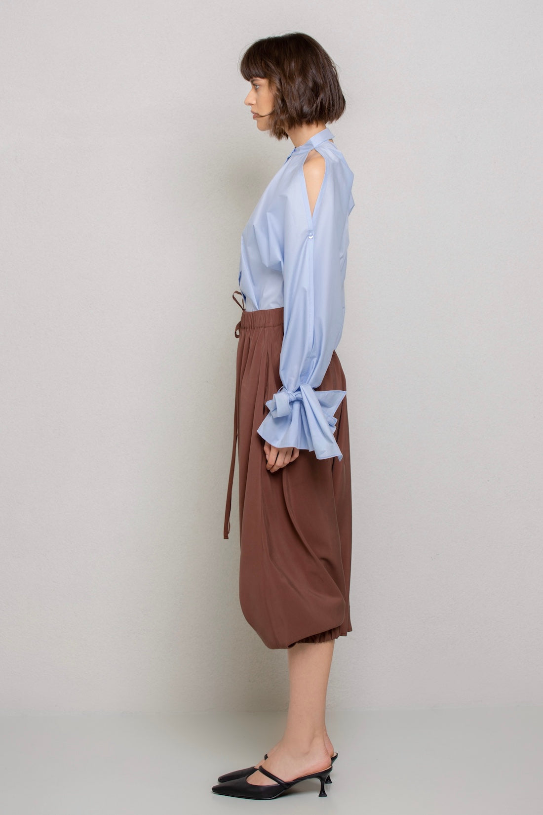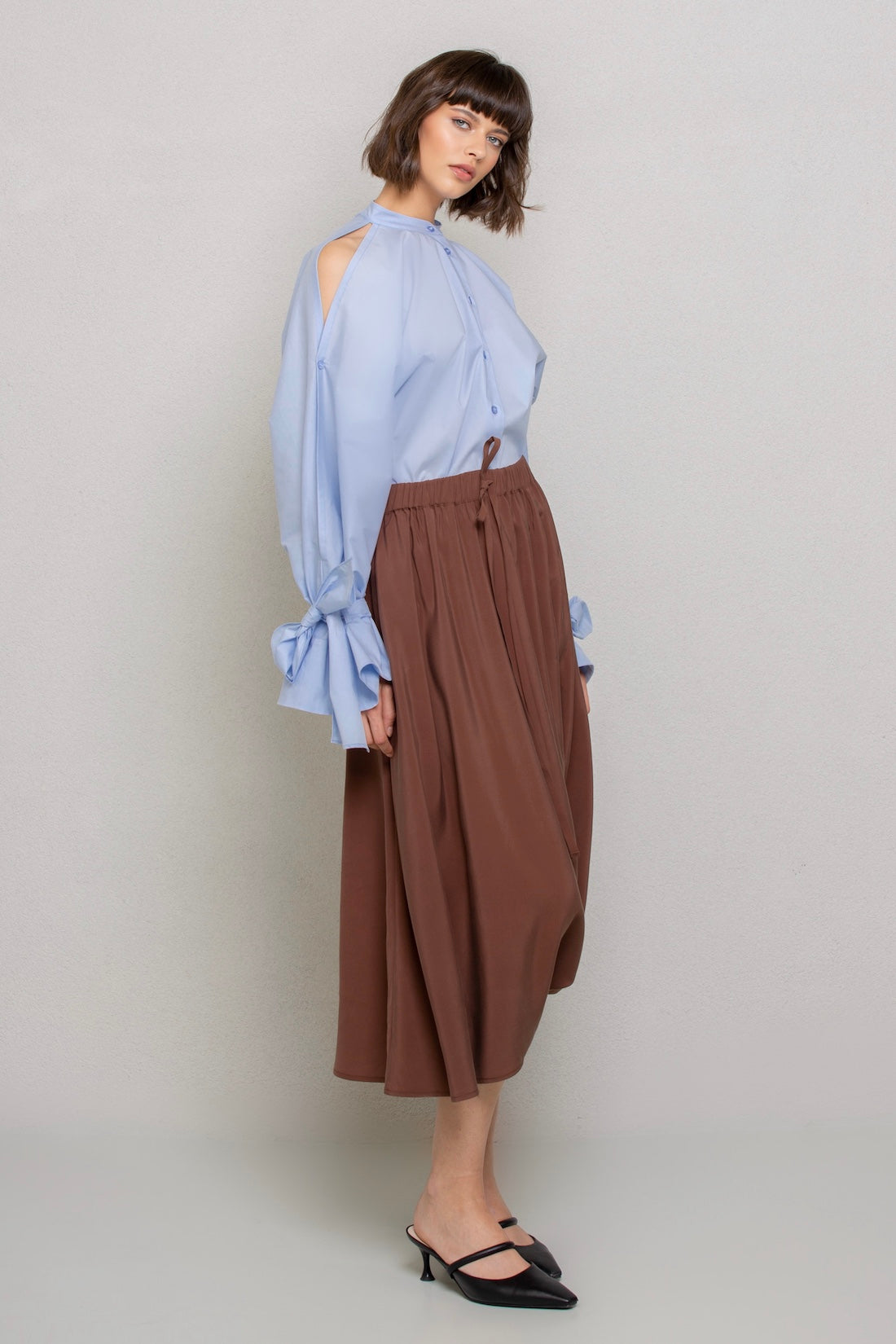Midi skirt/trousers. Featuring a flared cut with an elasticated waistband and an drawstring. This garment functions as both a skirt and trousers: one leg is constructed like a pair of trousers, while the other remains skirt-like, two sides pockets . This version allows you to play with and personalize the piece in different ways.