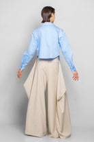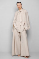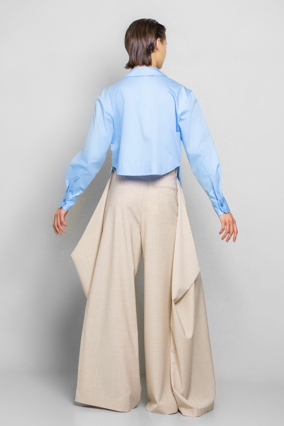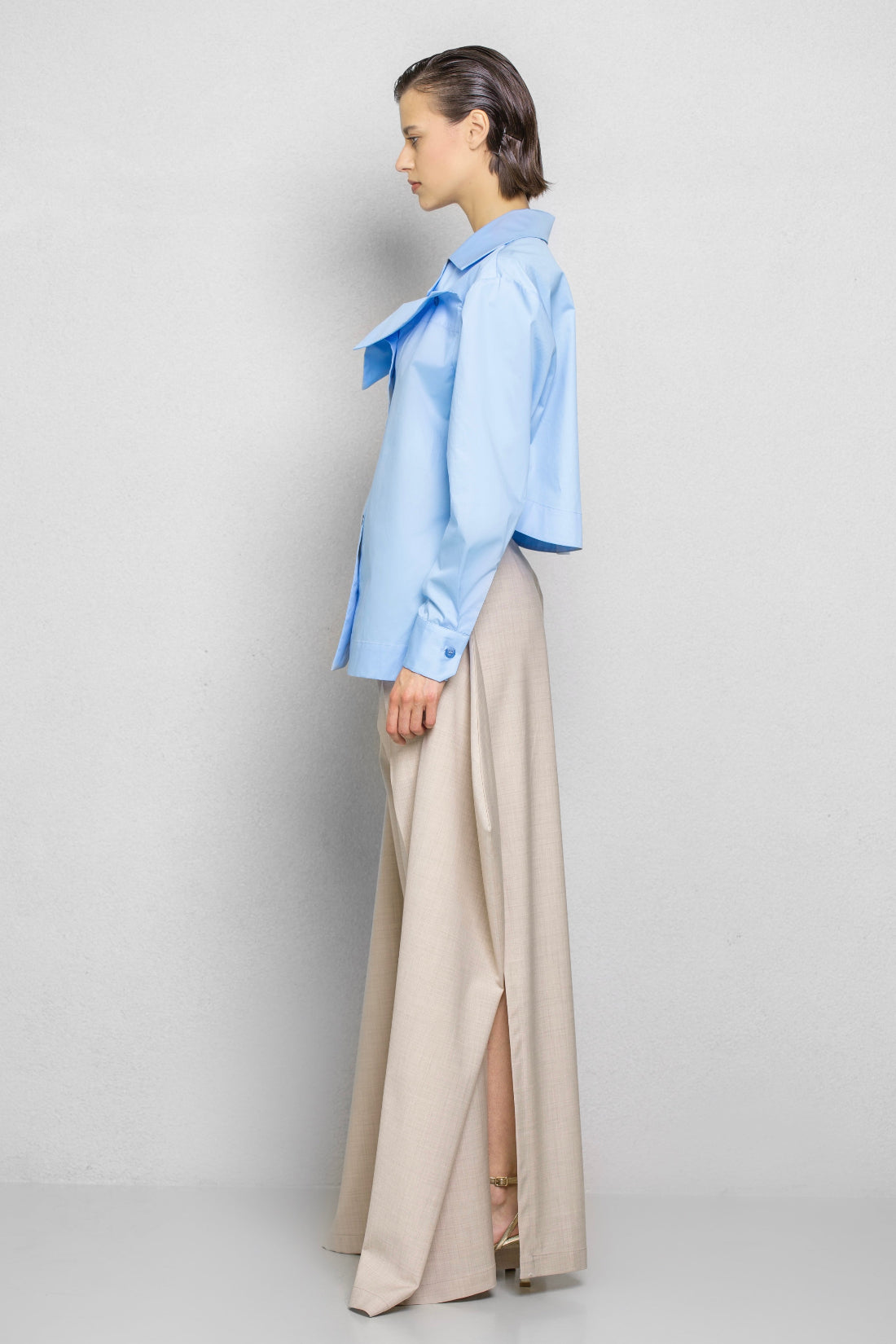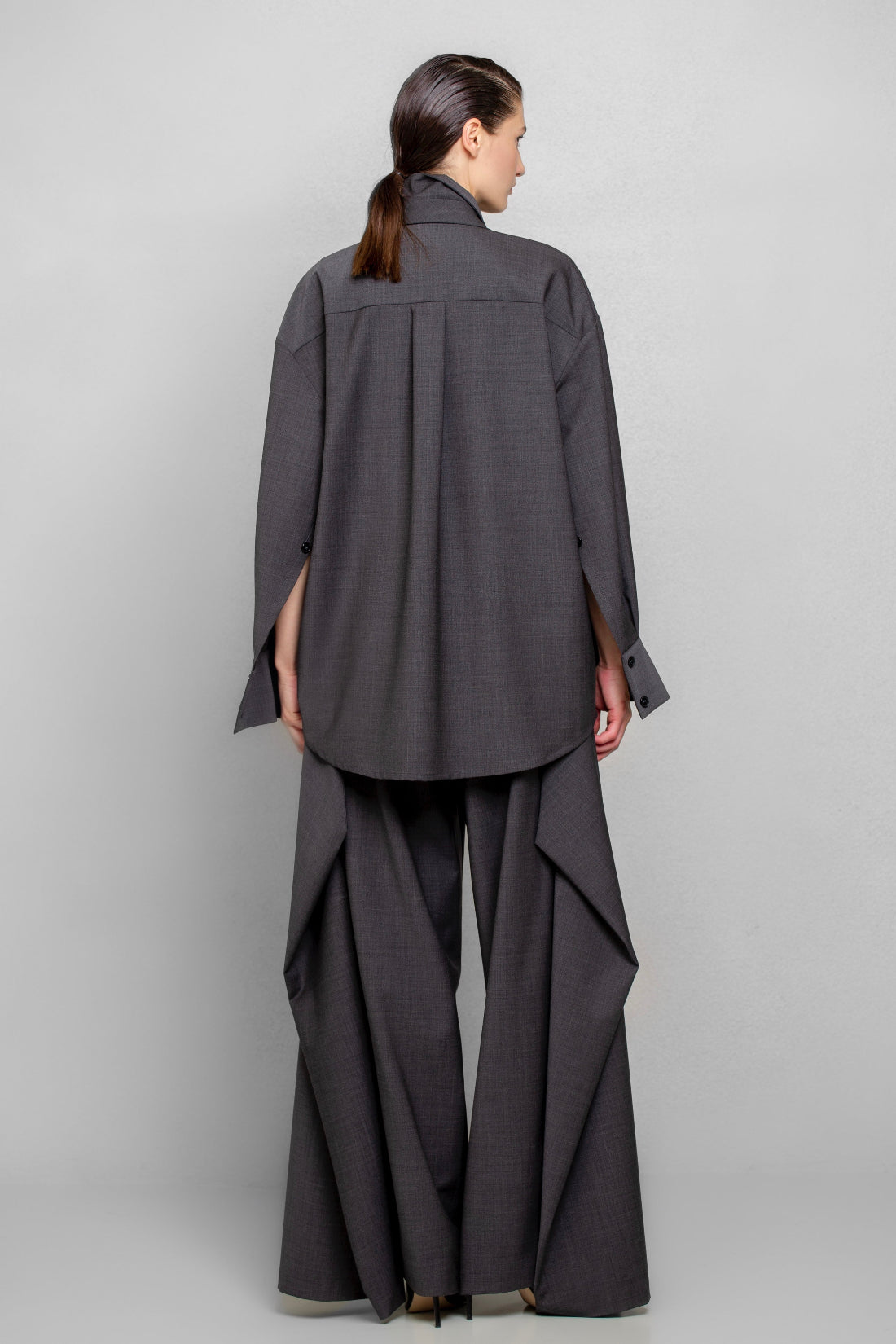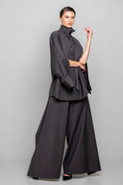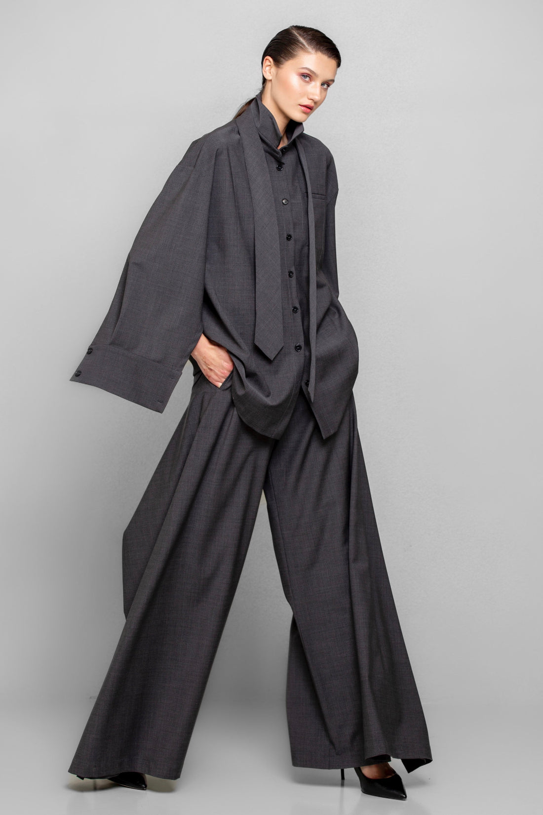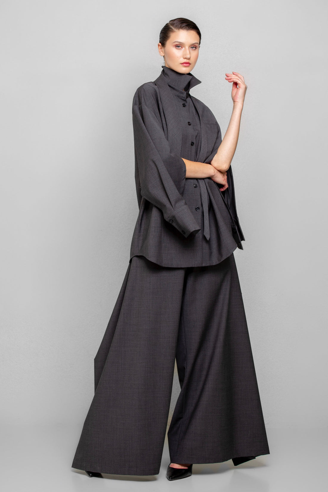 Elegant long flared pants made from wool fabric. The front features an extra panel that extends to the back. The side slits are covered by the front panel, and the movement of the pants creates a semi-revealing effect. This item pairs perfectly with the Dena shirt.