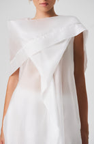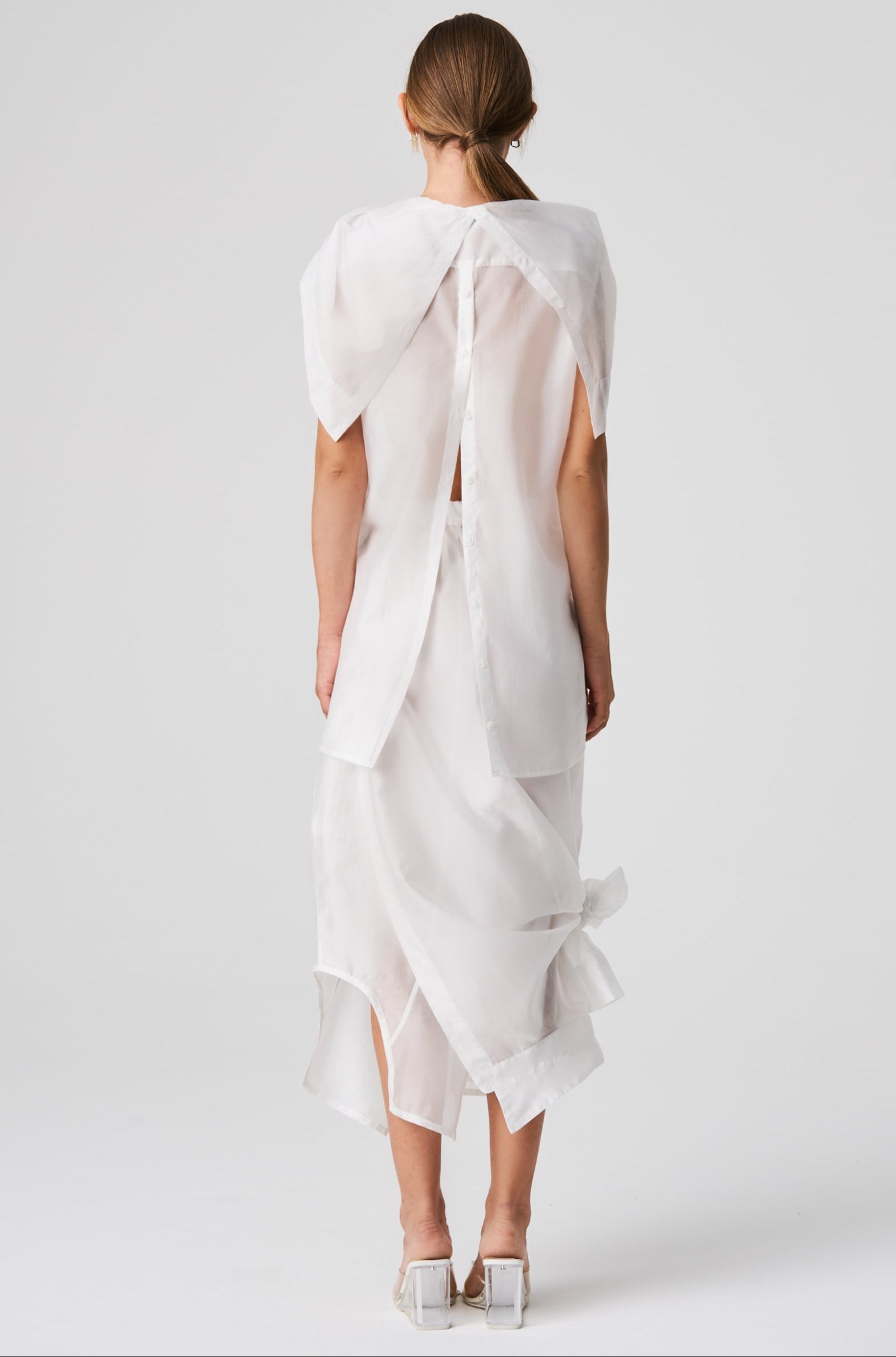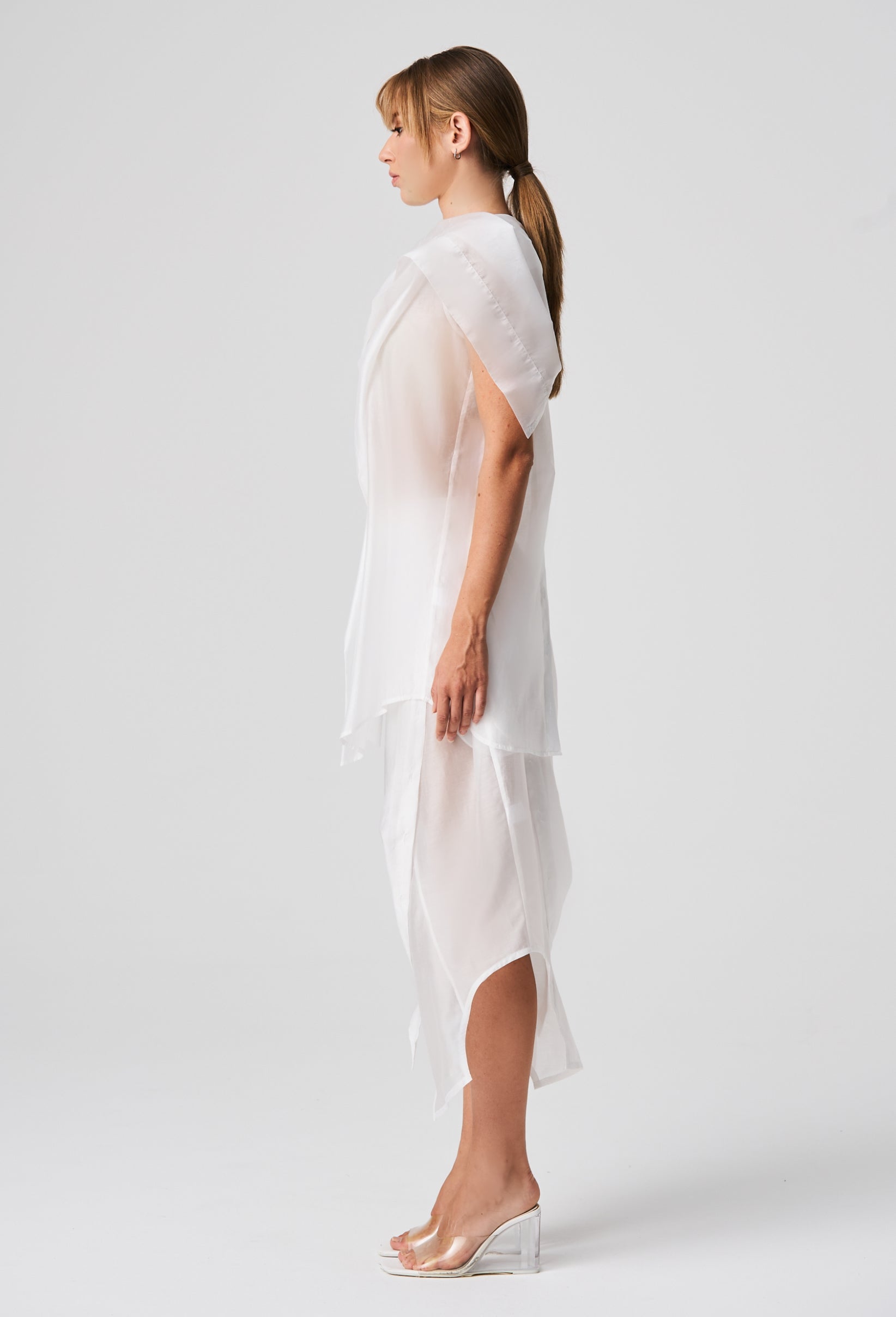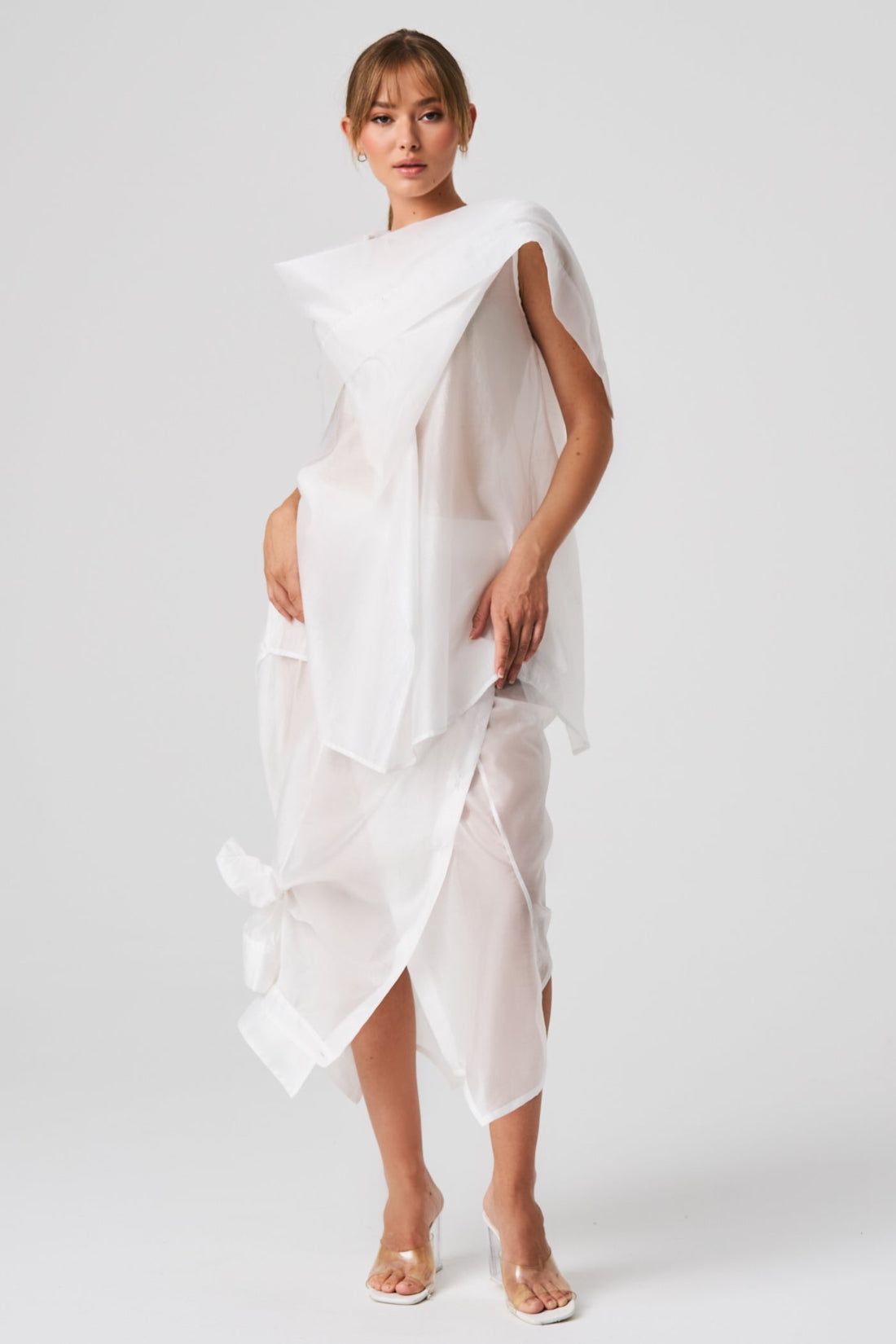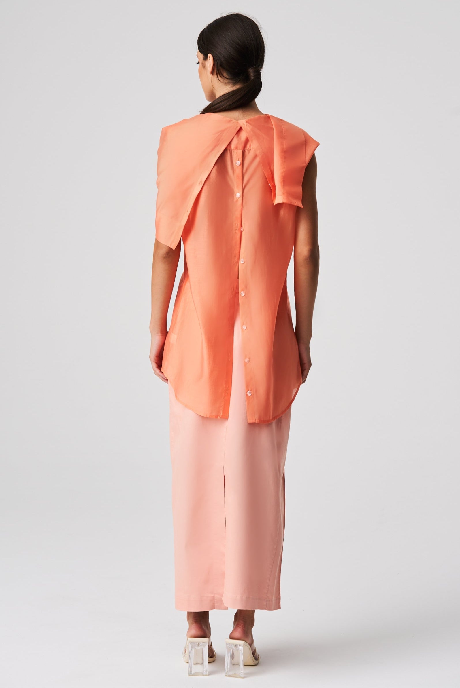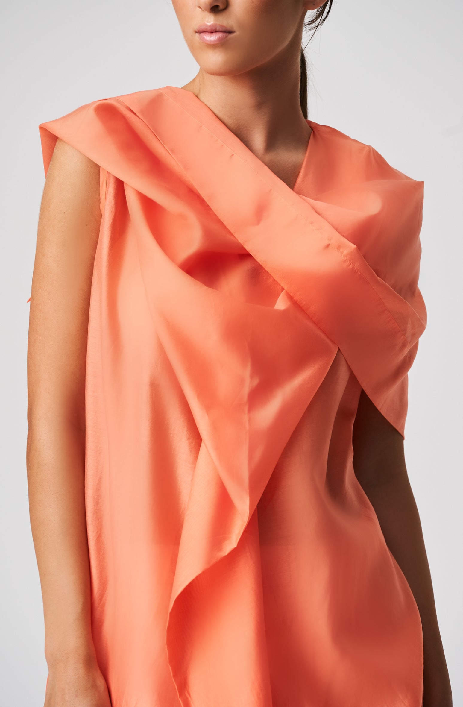Light and transparent sleeveless top. On the front, at chest height, there's a voluminous insert that creates a scarf to be styled as desired. At the back, there's a cut starting from the mid-back downwards, allowing the top to be worn in many different ways. This garment gives an elegant and refined look.