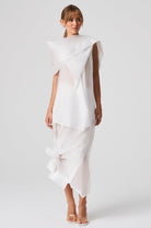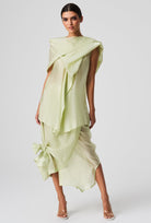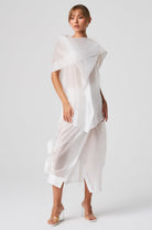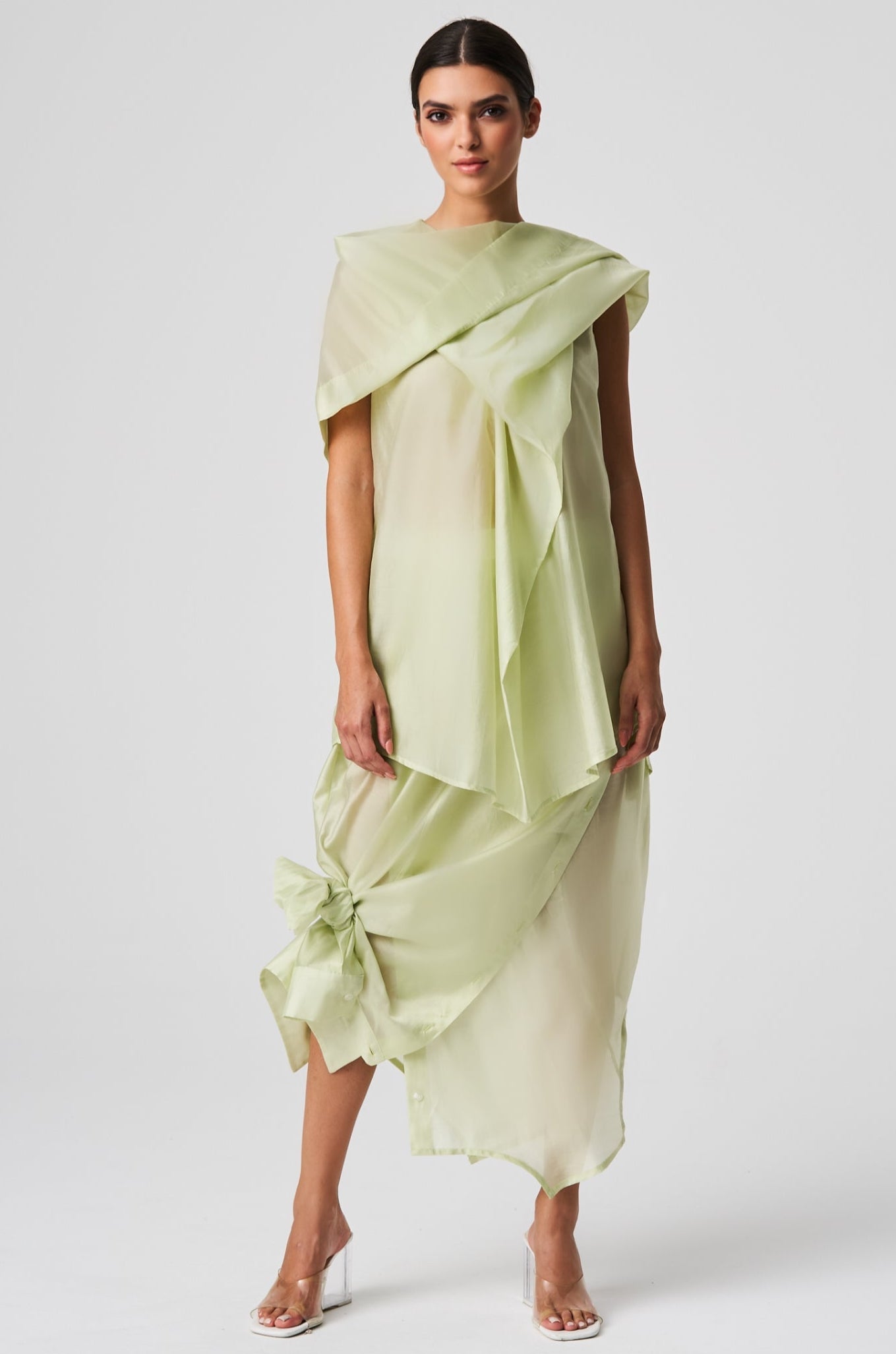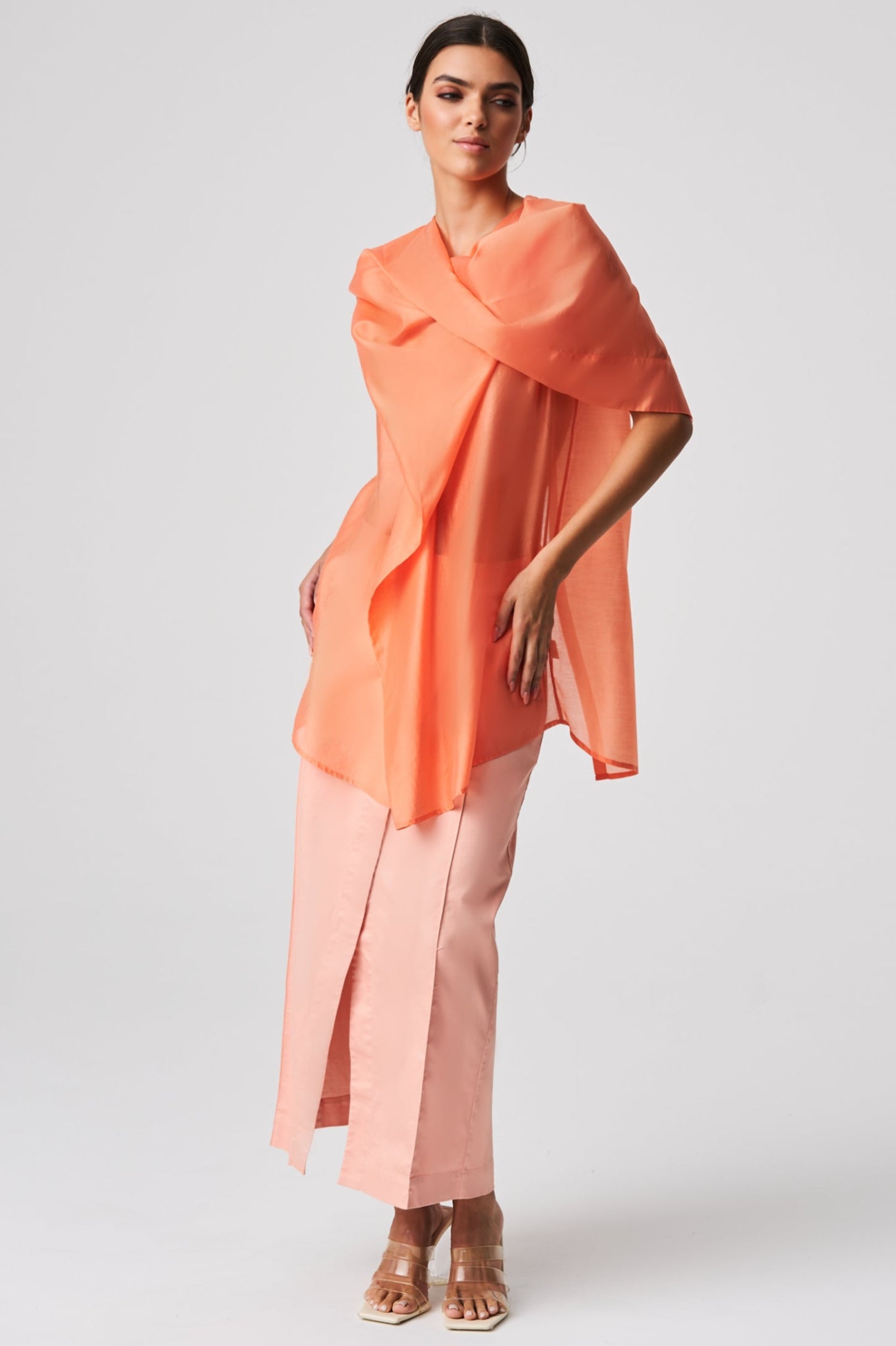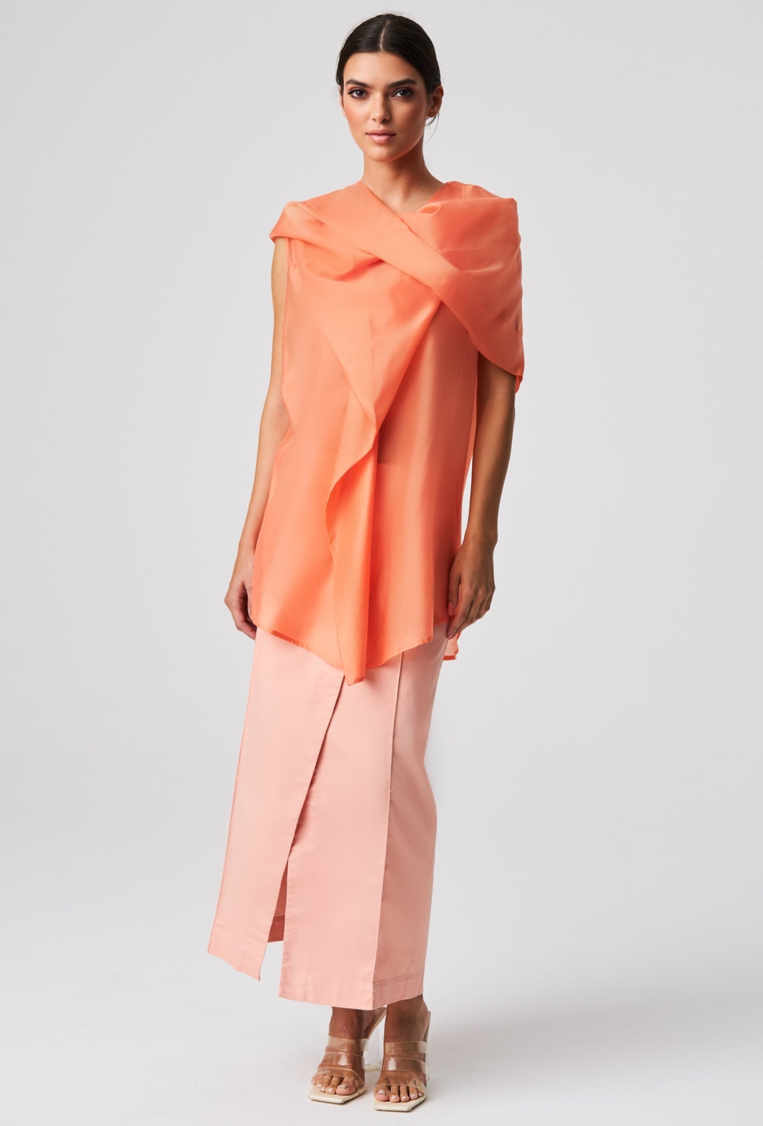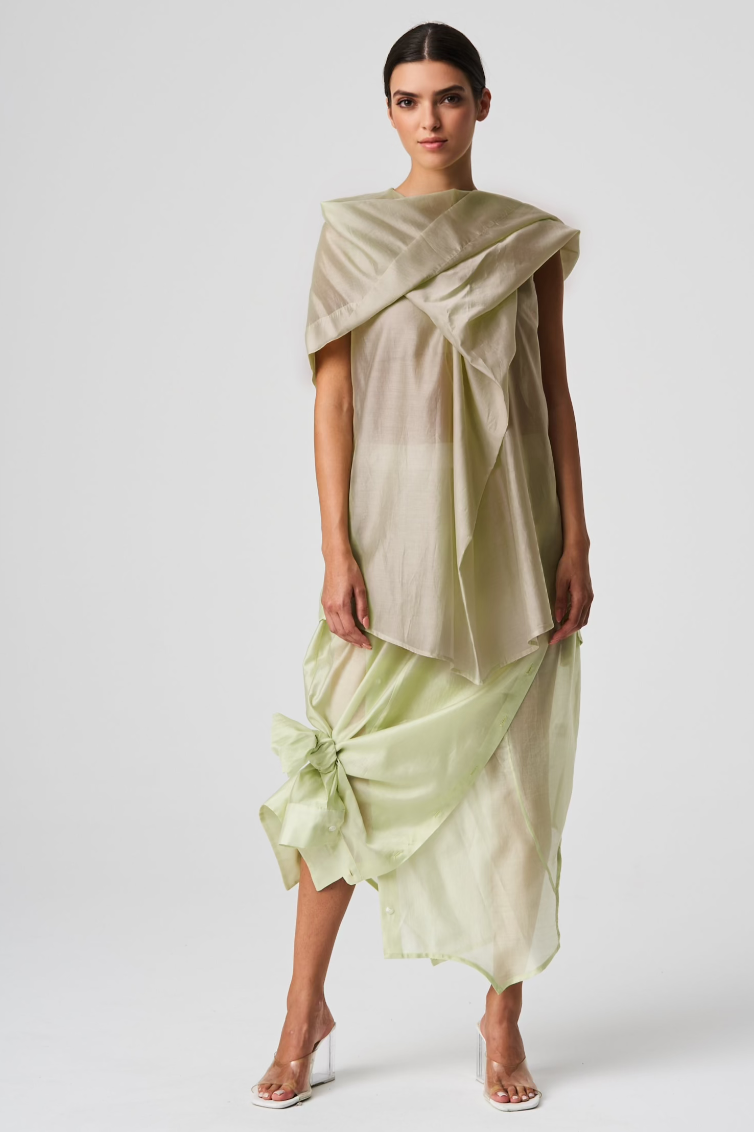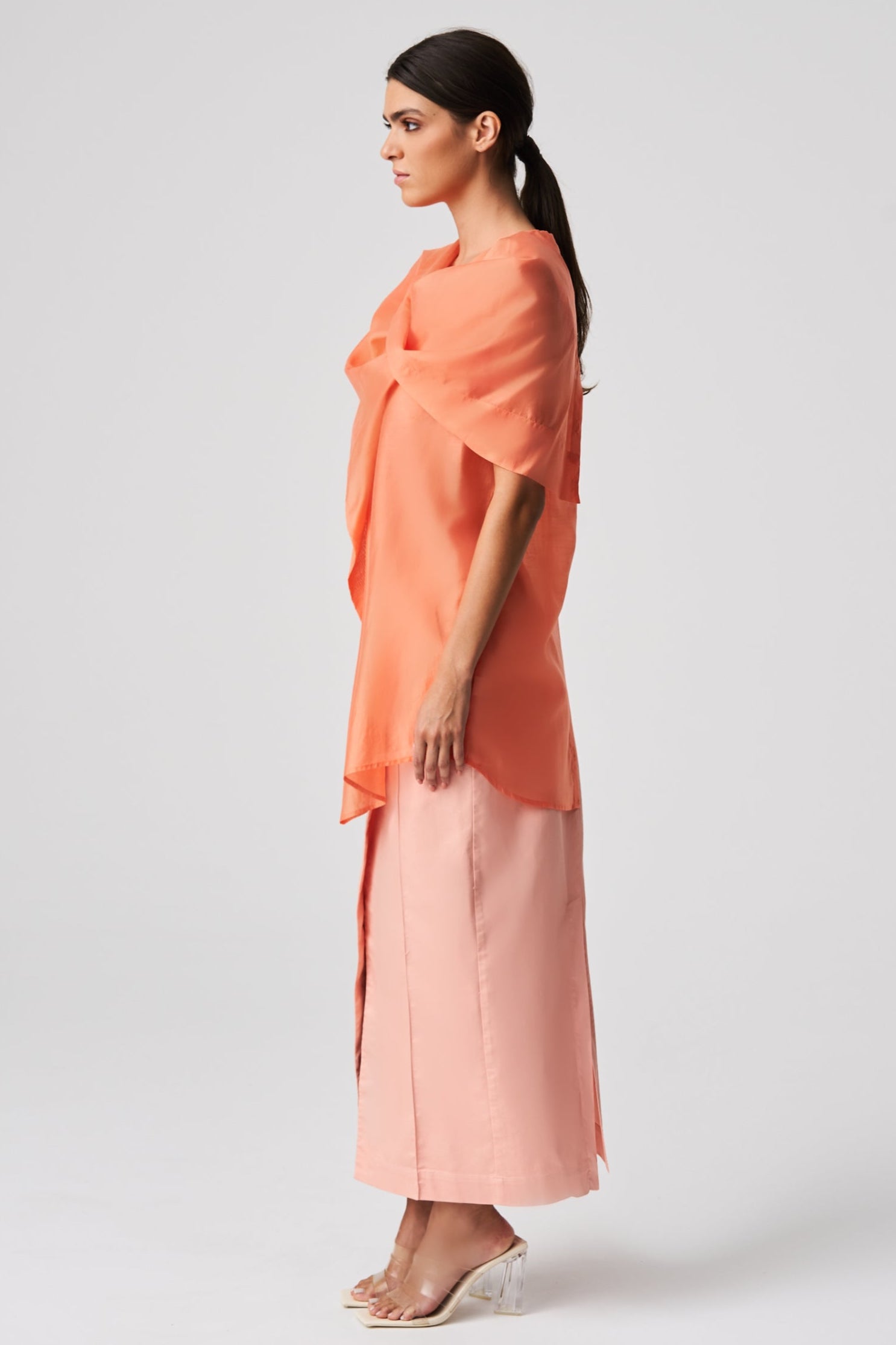Light and transparent sleeveless top. On the front, at chest height, there's a voluminous insert that creates a scarf to be styled as desired. At the back, there's a cut starting from the mid-back downwards, allowing the top to be worn in many different ways. This garment gives an elegant and refined look.