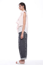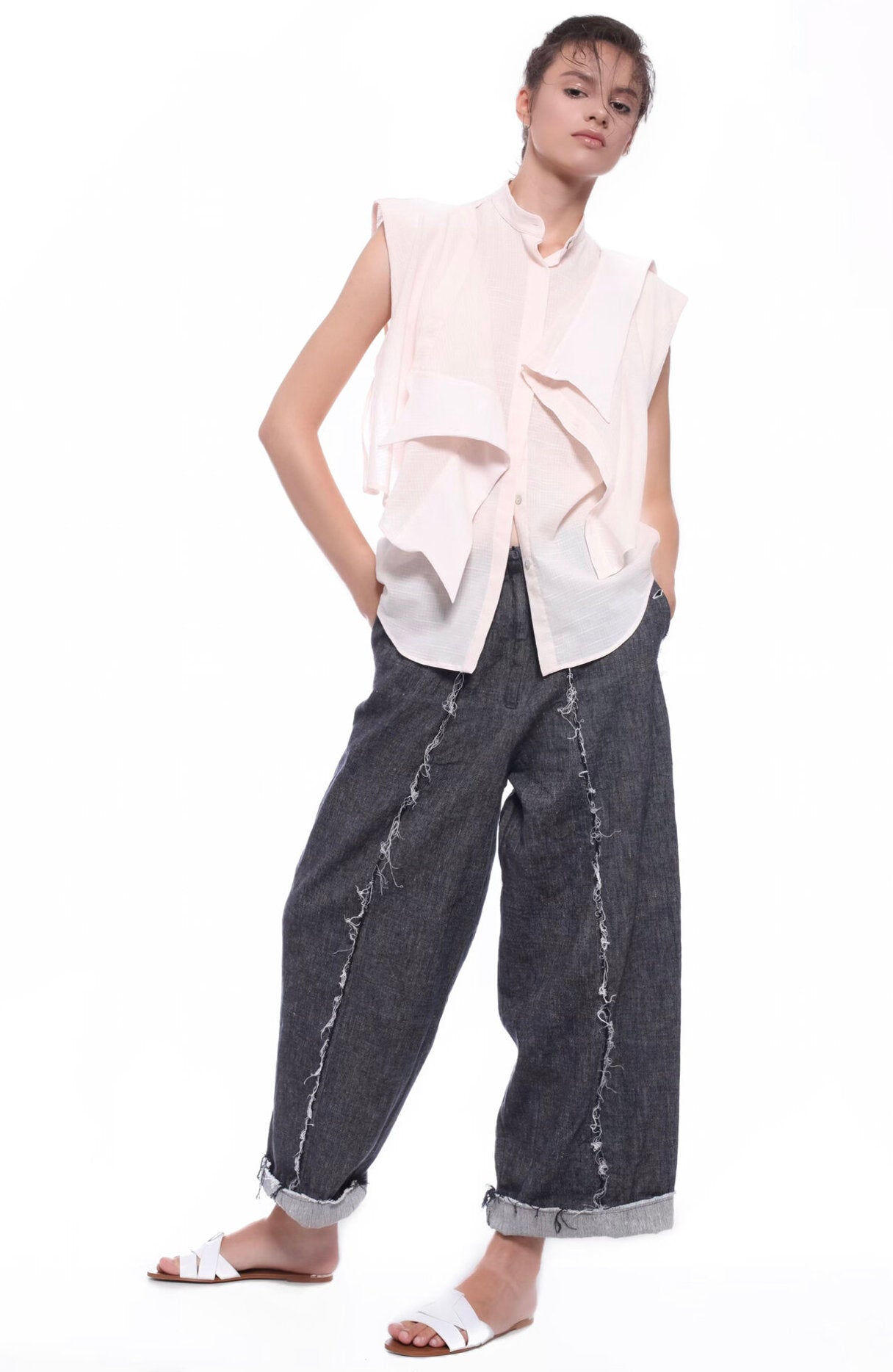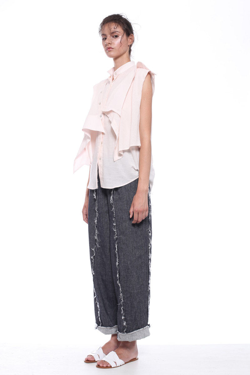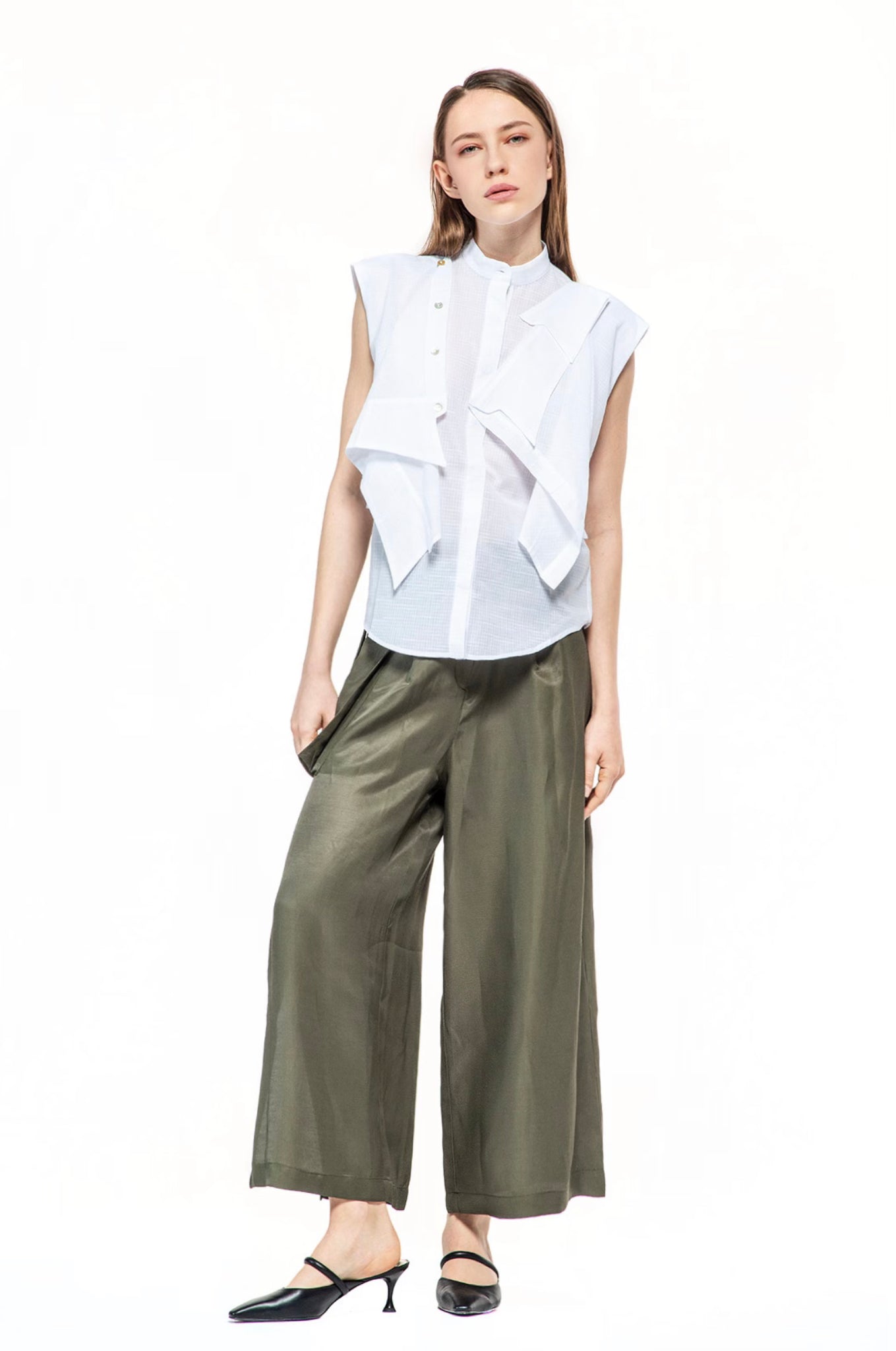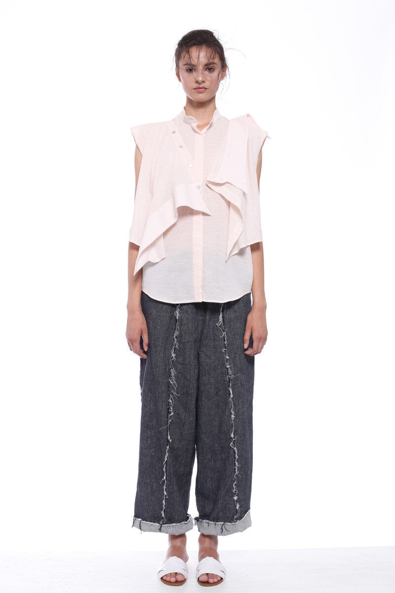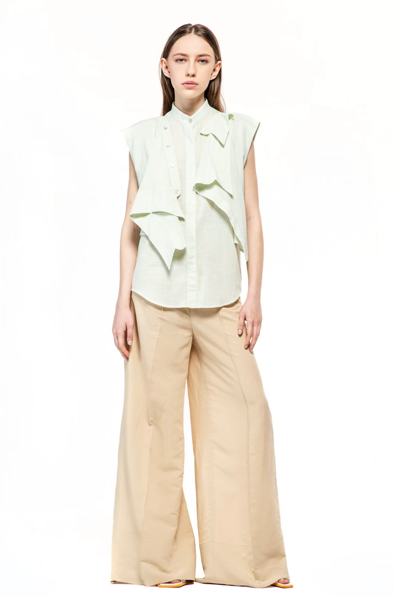 DECONSTRUCTED SLEEVELESS SHIRT IN TRANSPARENT ORGANIC COTTON WITH KOREAN COLLAR.