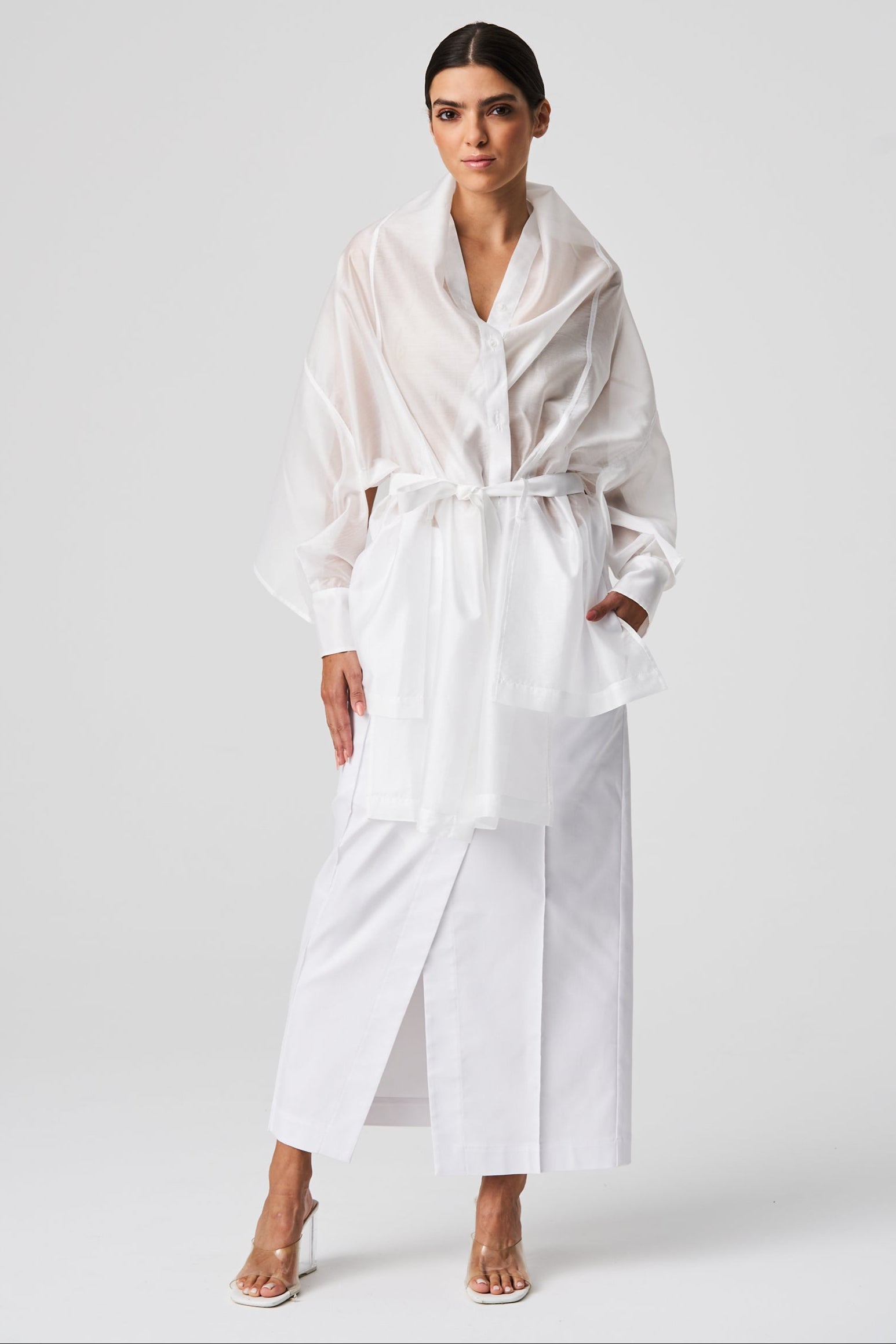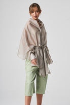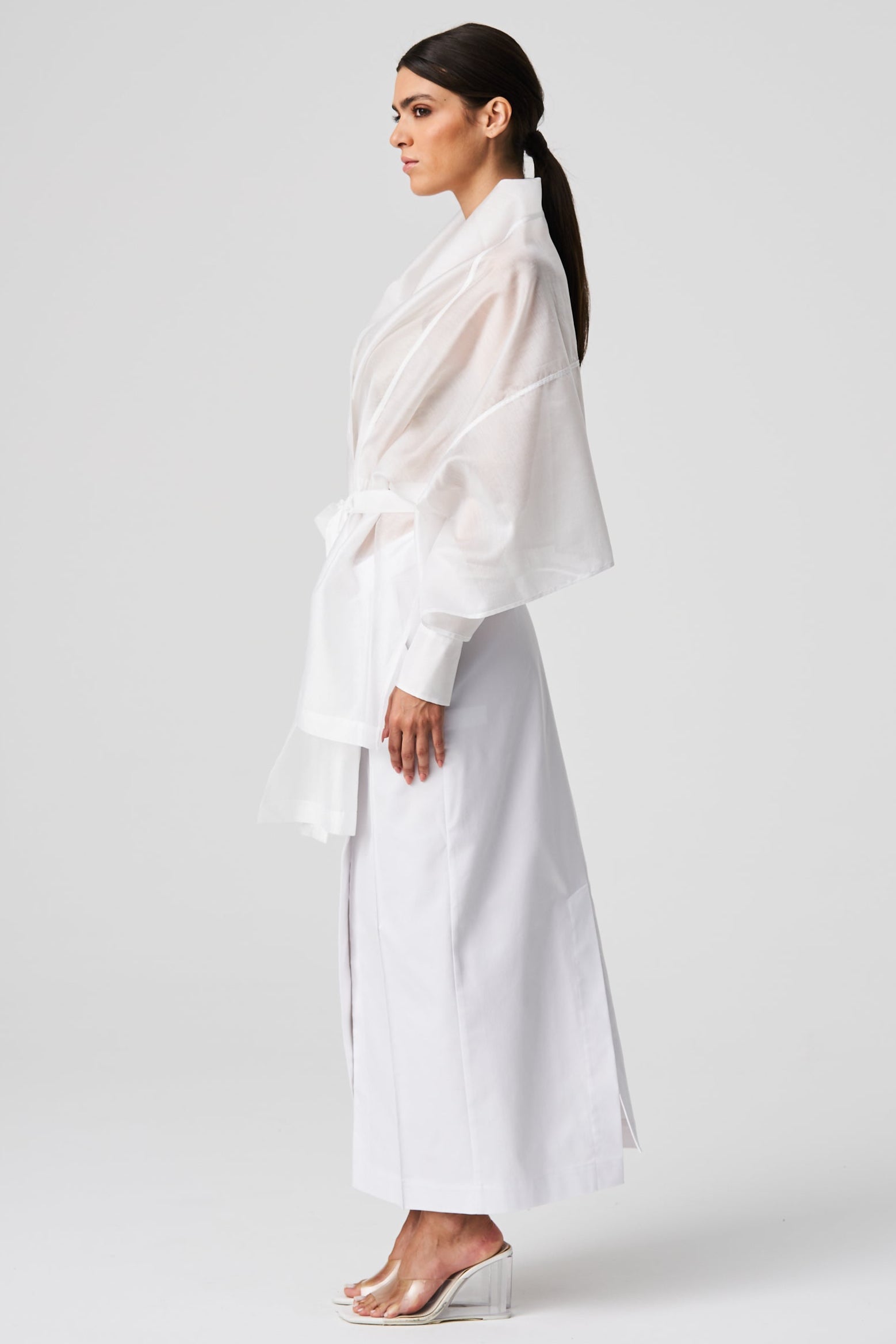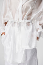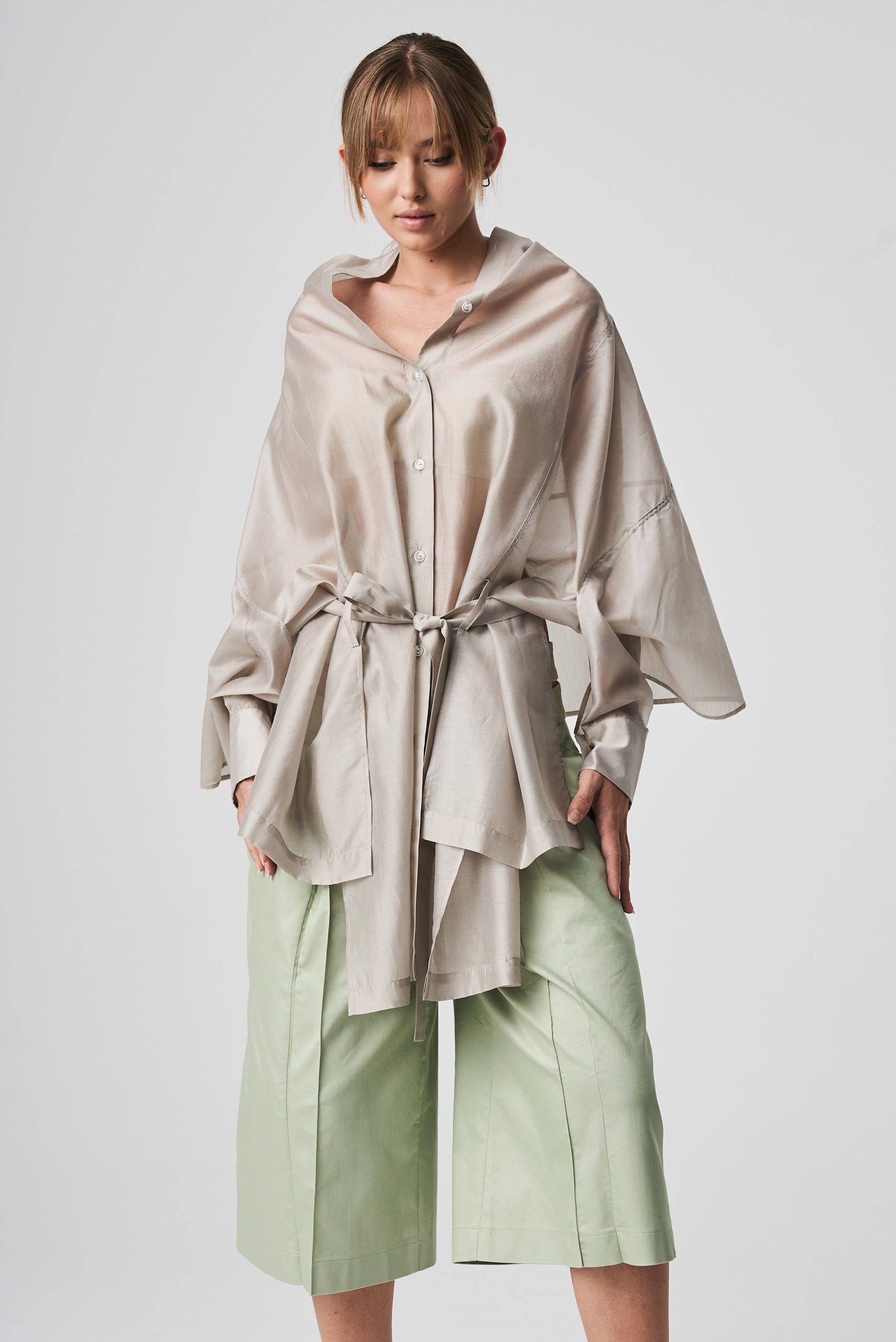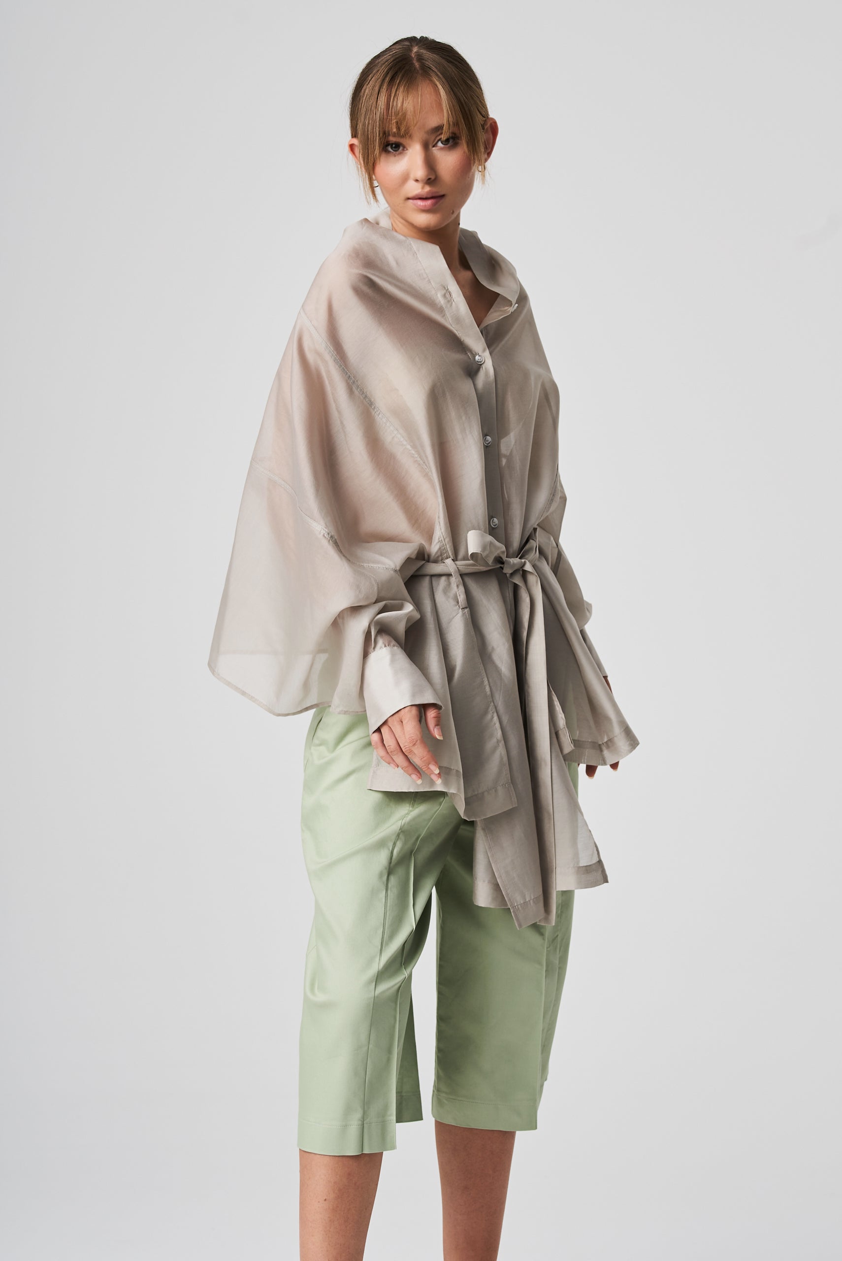 A lightweight, transparent top with long kimono-style sleeves. The unique feature of this garment is its imitation of a shawl that has sleeves, extending at the front with a fabric belt. The back is shorter and open, resembling a shawl. The inner part of the sleeves is open, allowing the top to be styled in different ways.