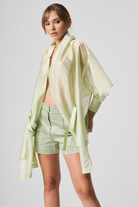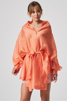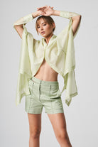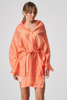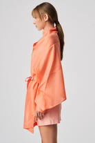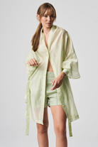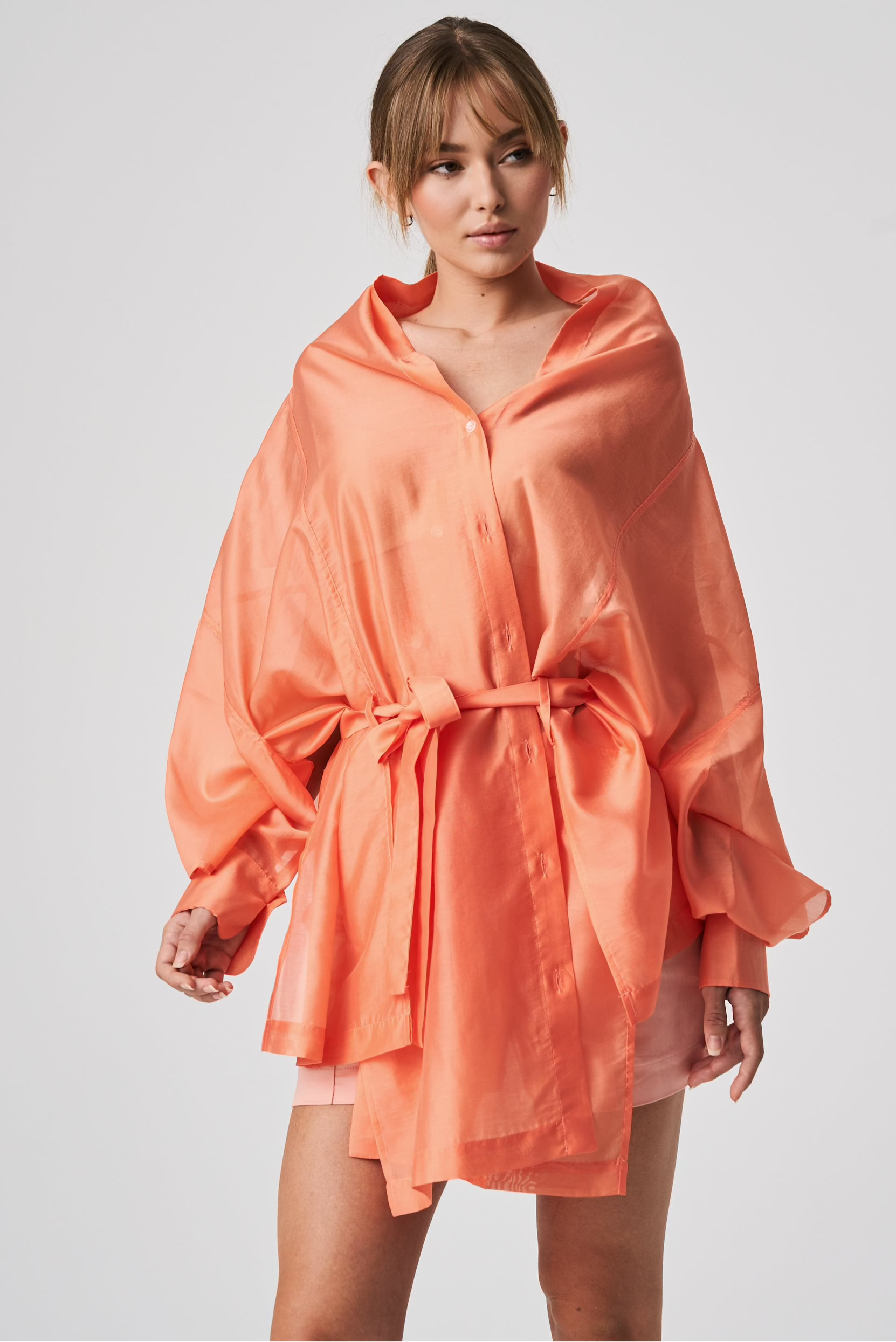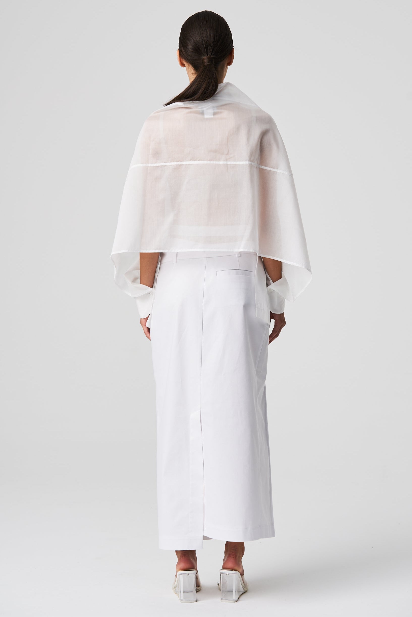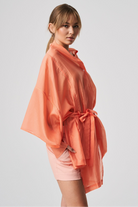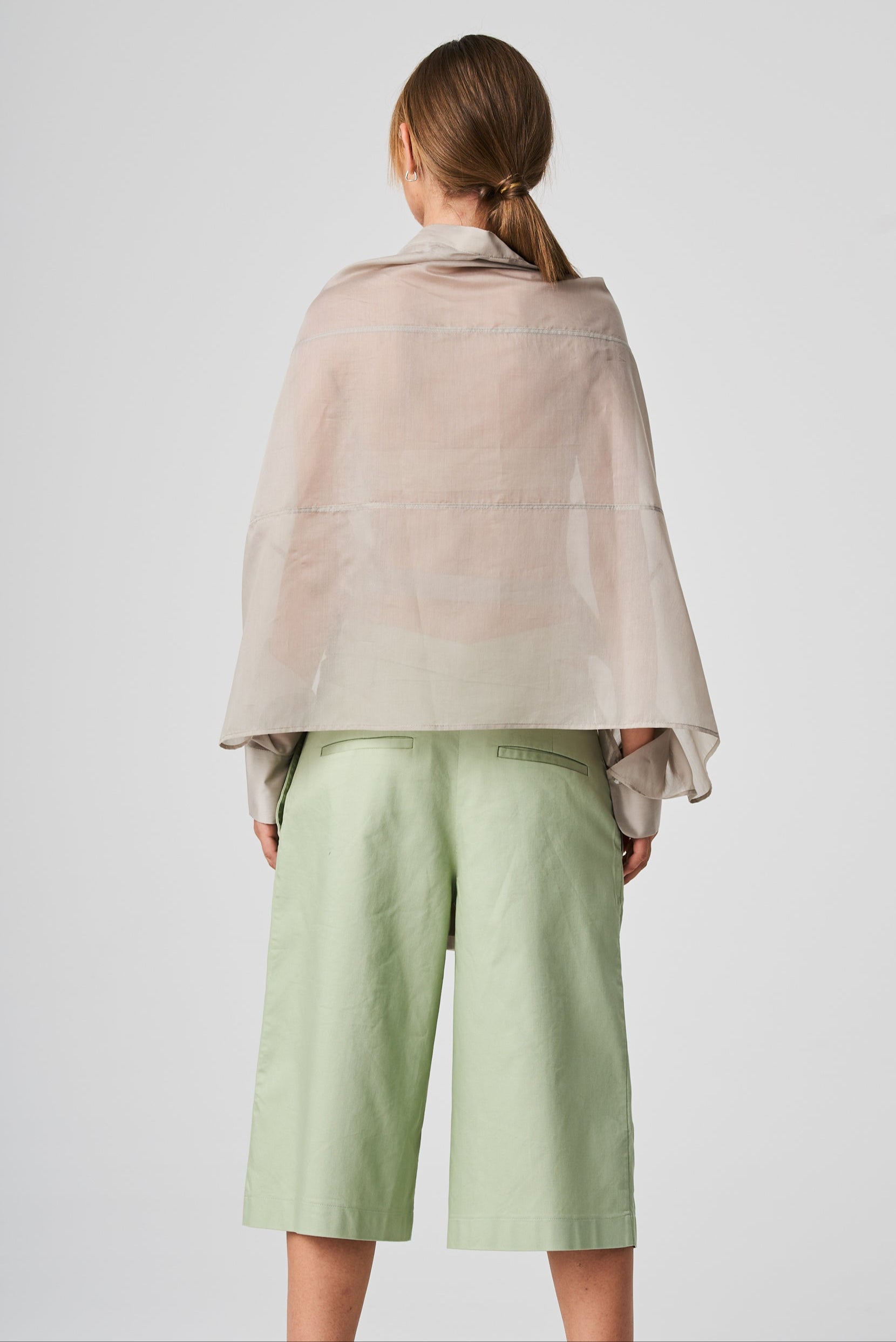 A lightweight, transparent top with long kimono-style sleeves. The unique feature of this garment is its imitation of a shawl that has sleeves, extending at the front with a fabric belt. The back is shorter and open, resembling a shawl. The inner part of the sleeves is open, allowing the top to be styled in different ways.