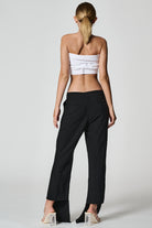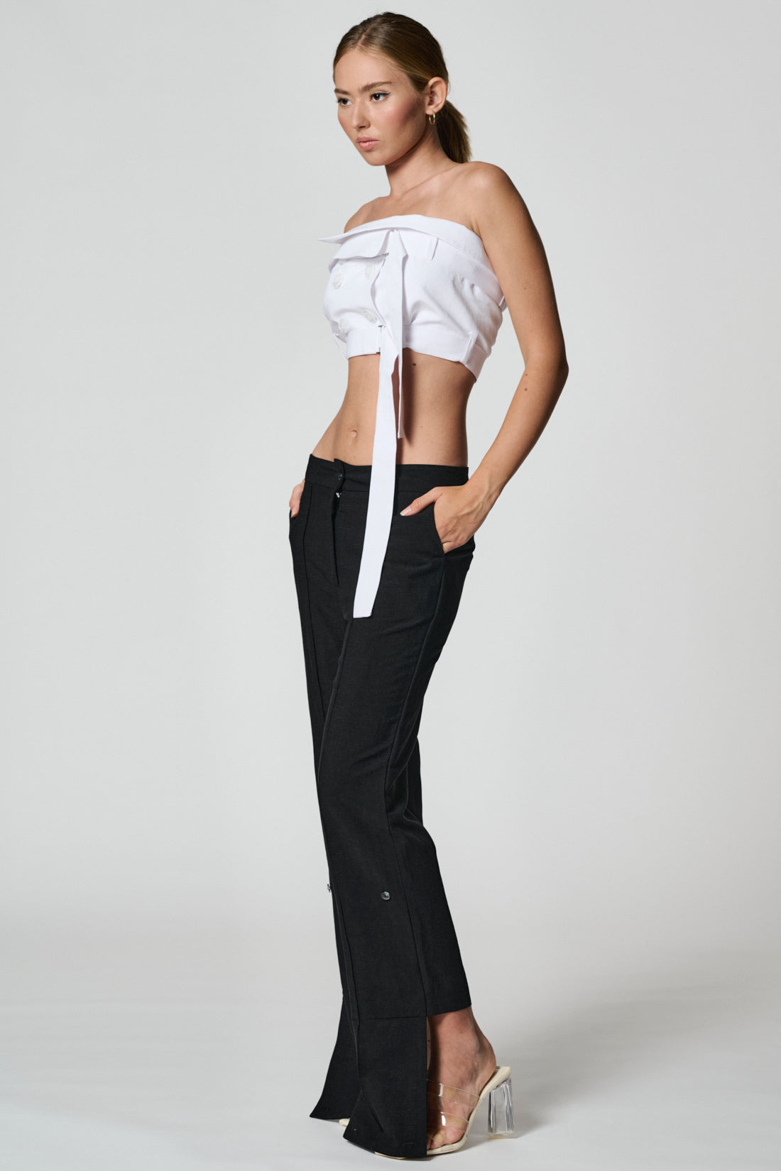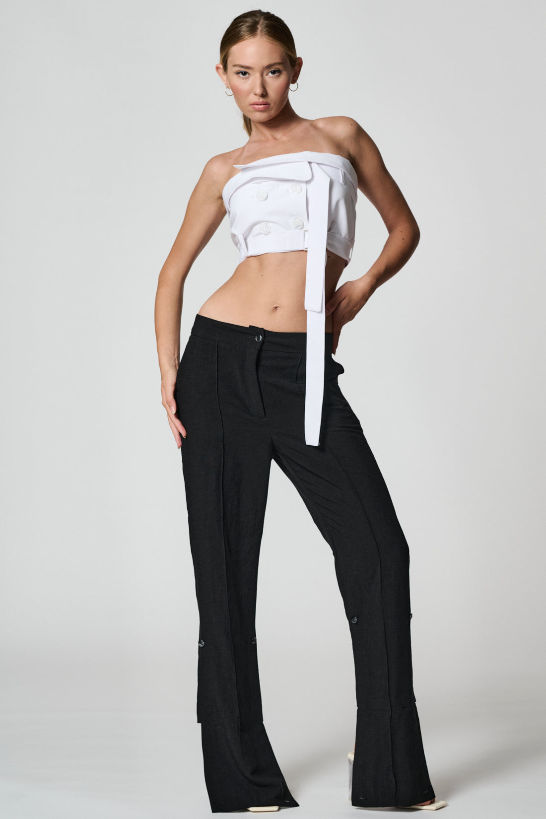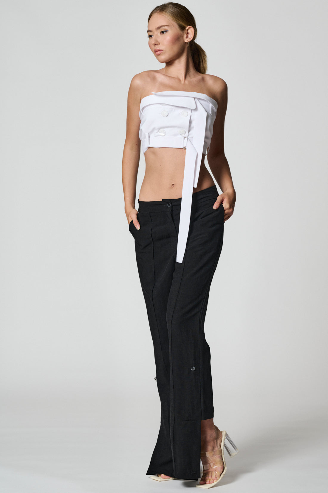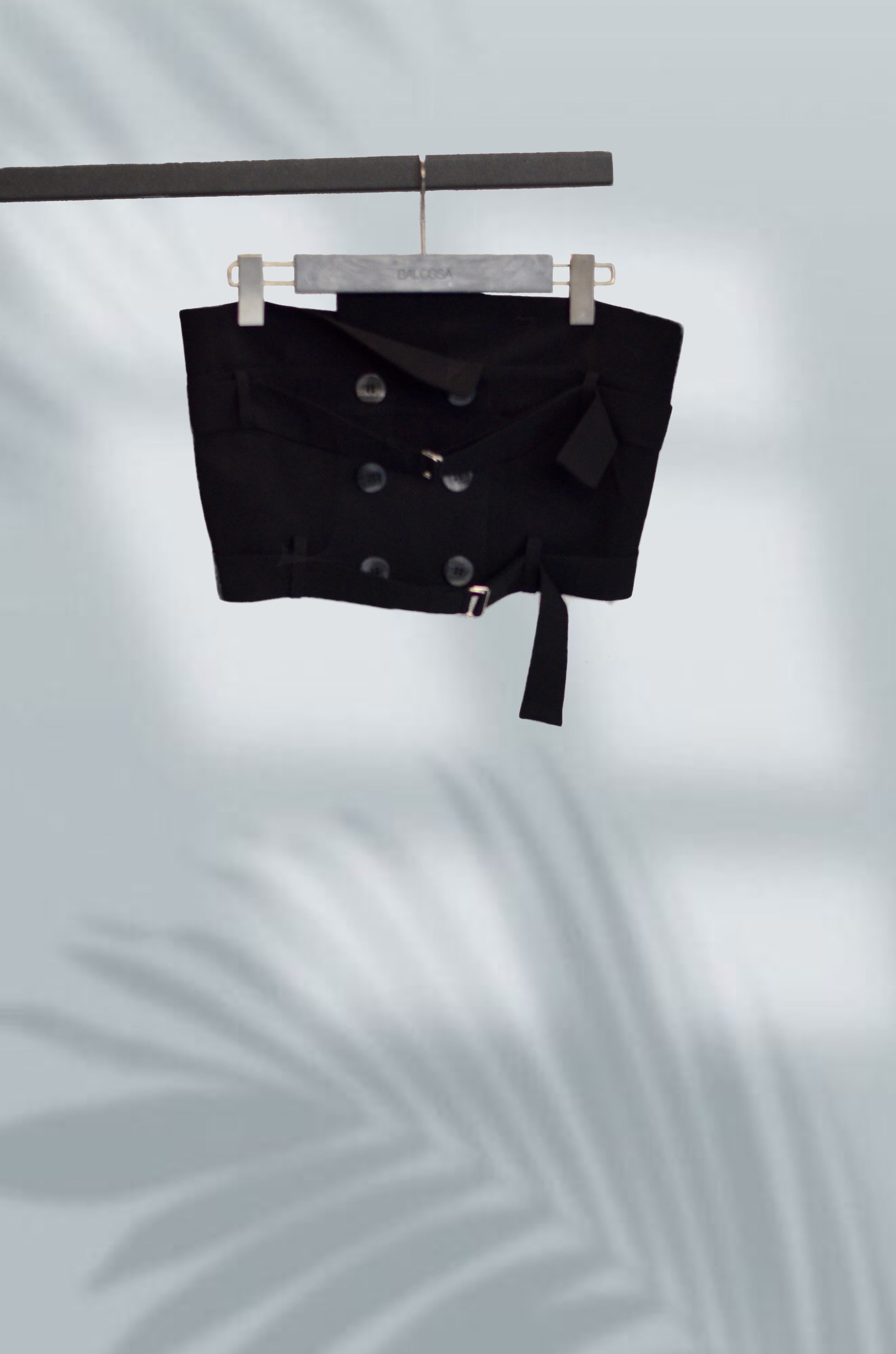 Top with two belts crossing around and fixed by metal rings in front. Front closure with 6 big buttons.