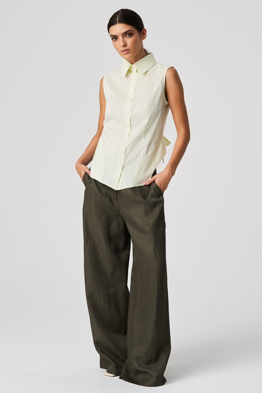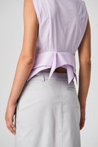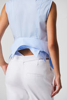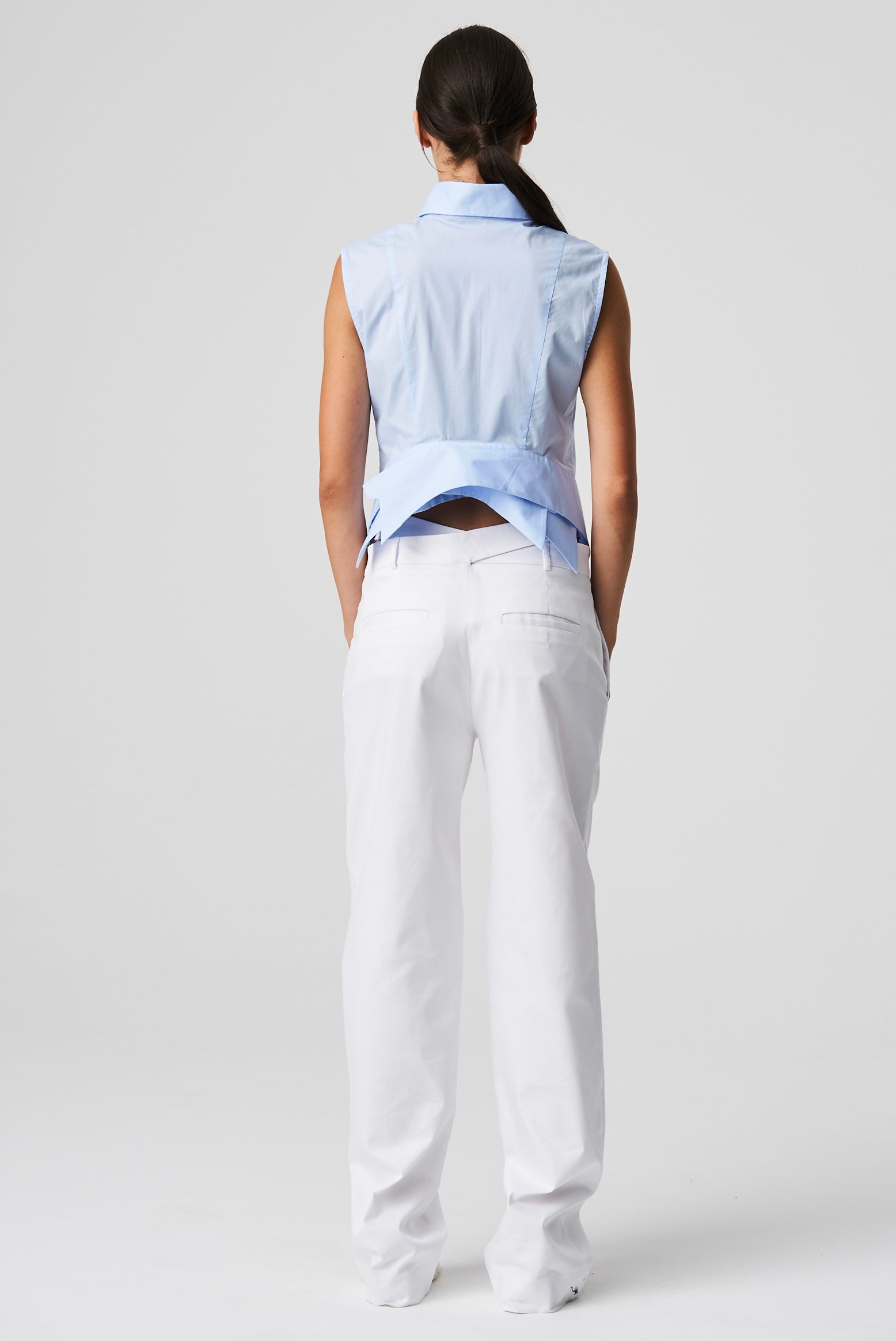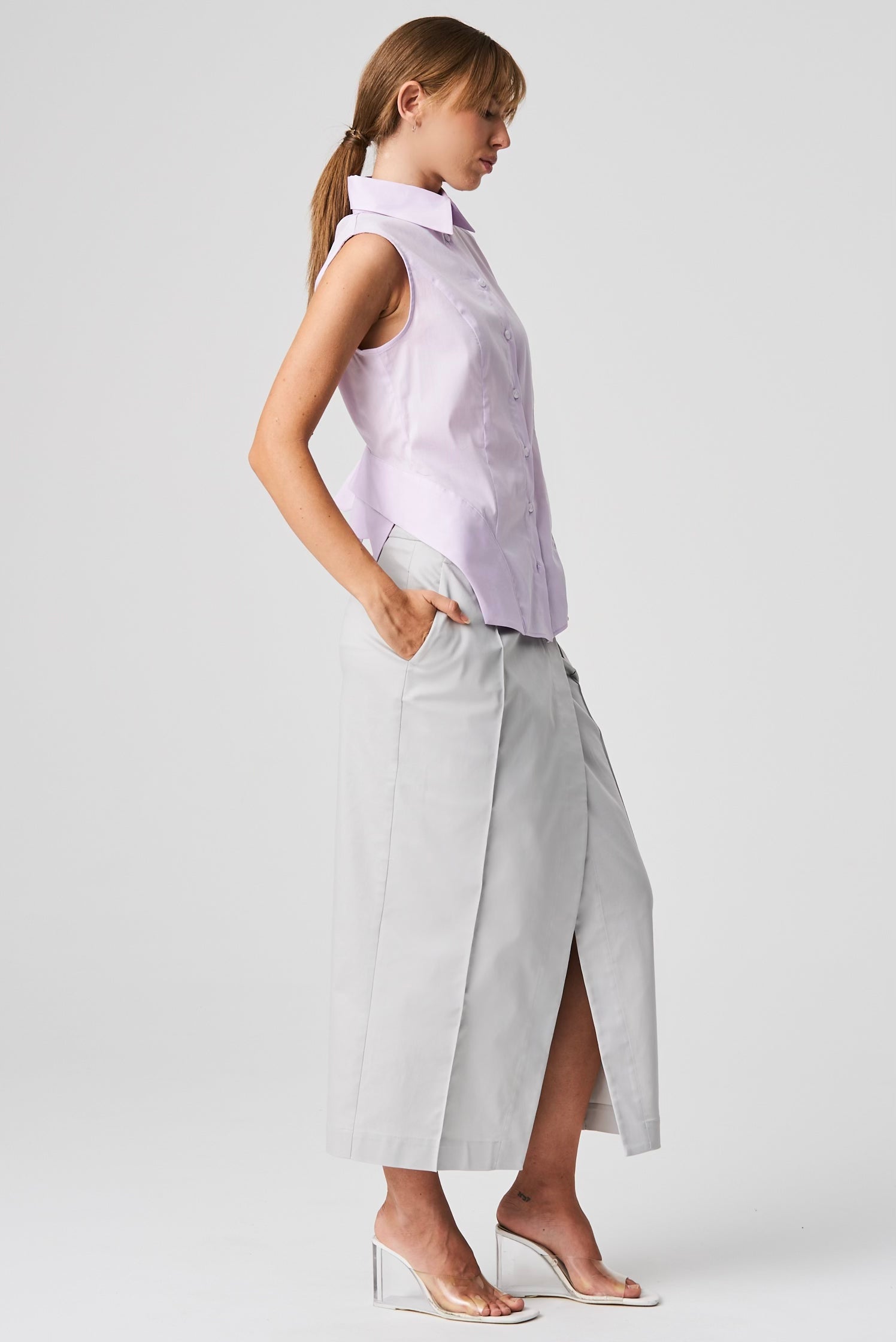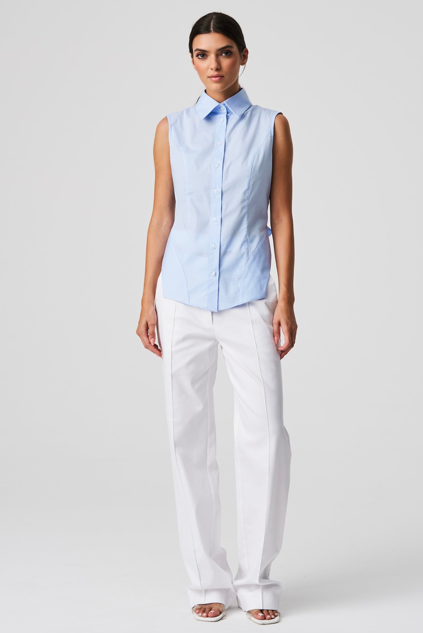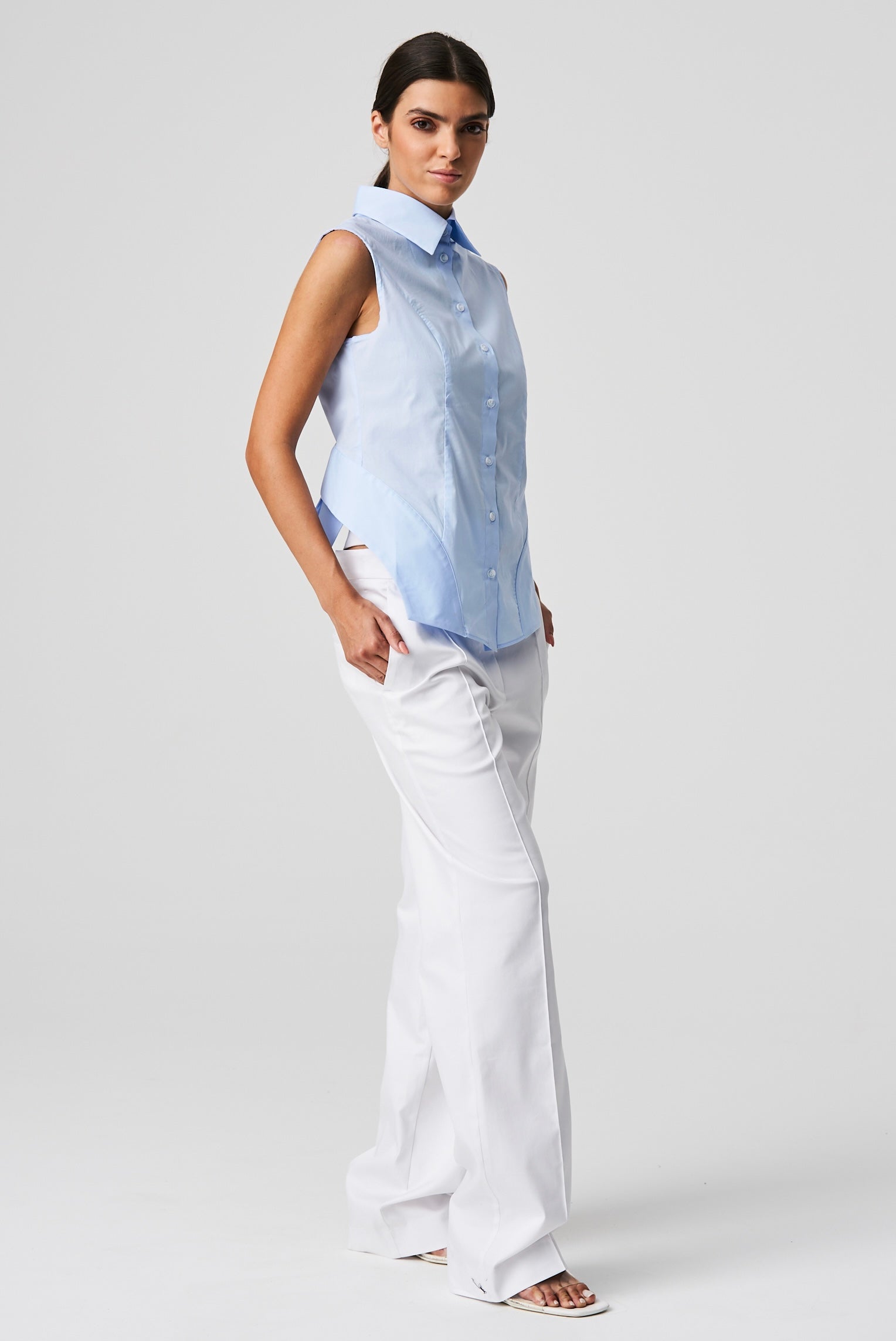 Slim-fit sleeveless shirt with a regular collar. The unique feature of this design is the back: the length reaches the waistline, and the hem is embellished with a double decorative collar, while the front has a clean look with an angled hem.
