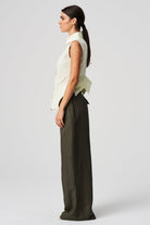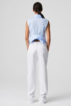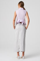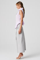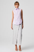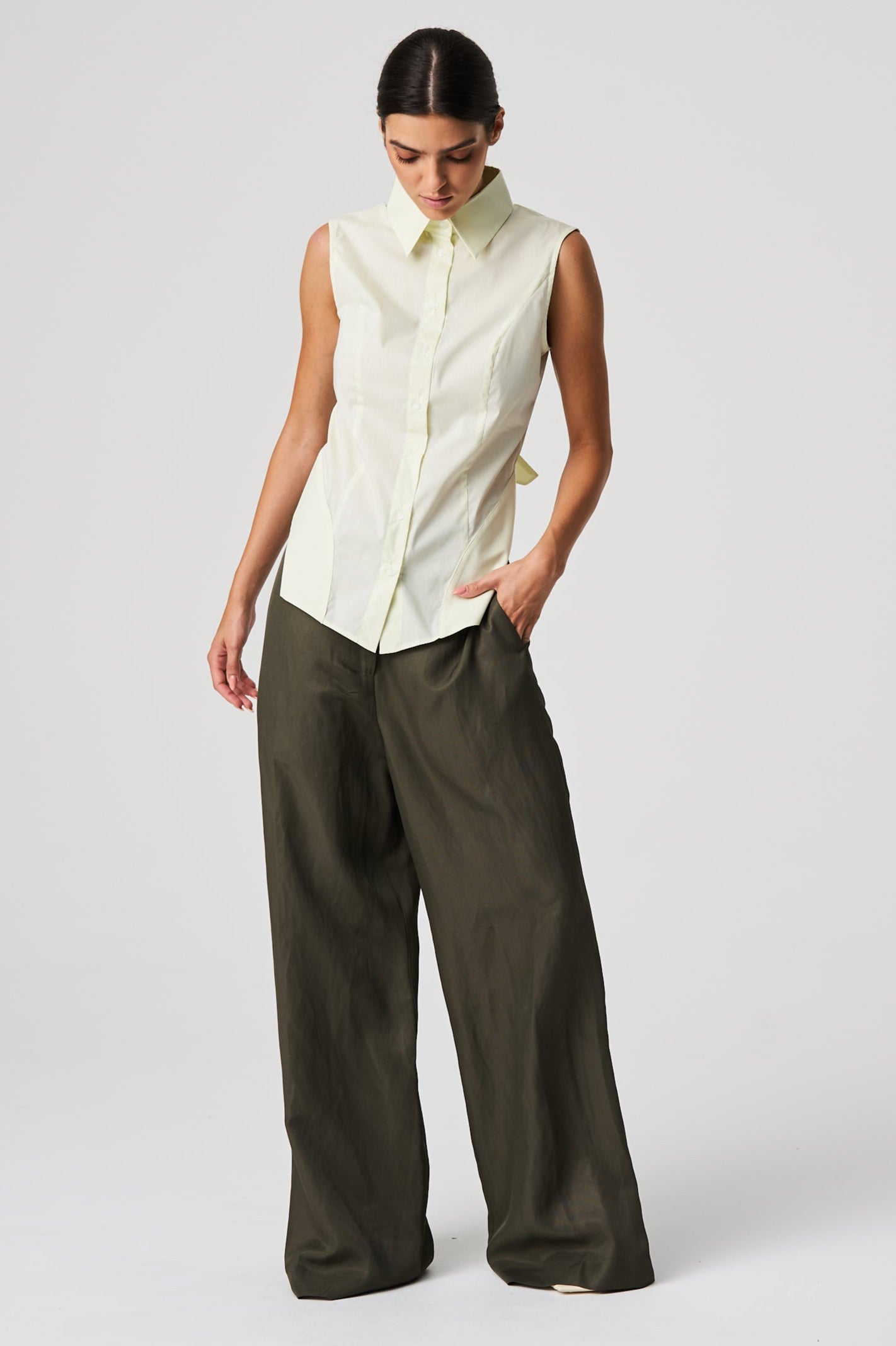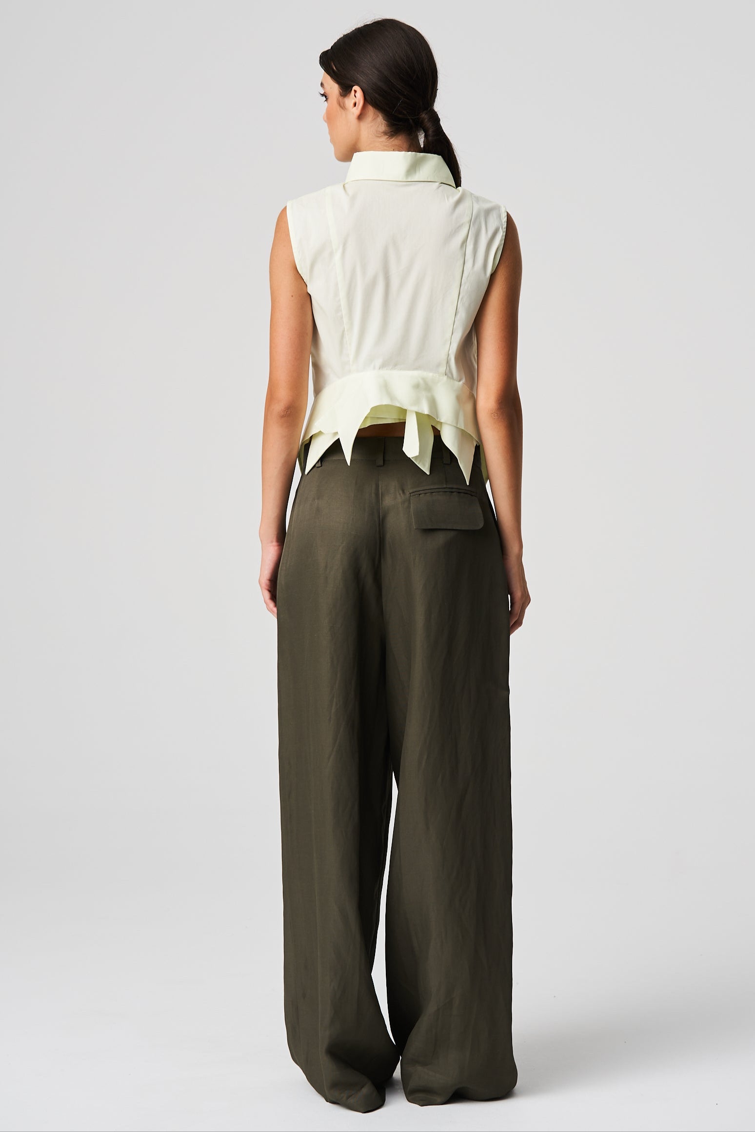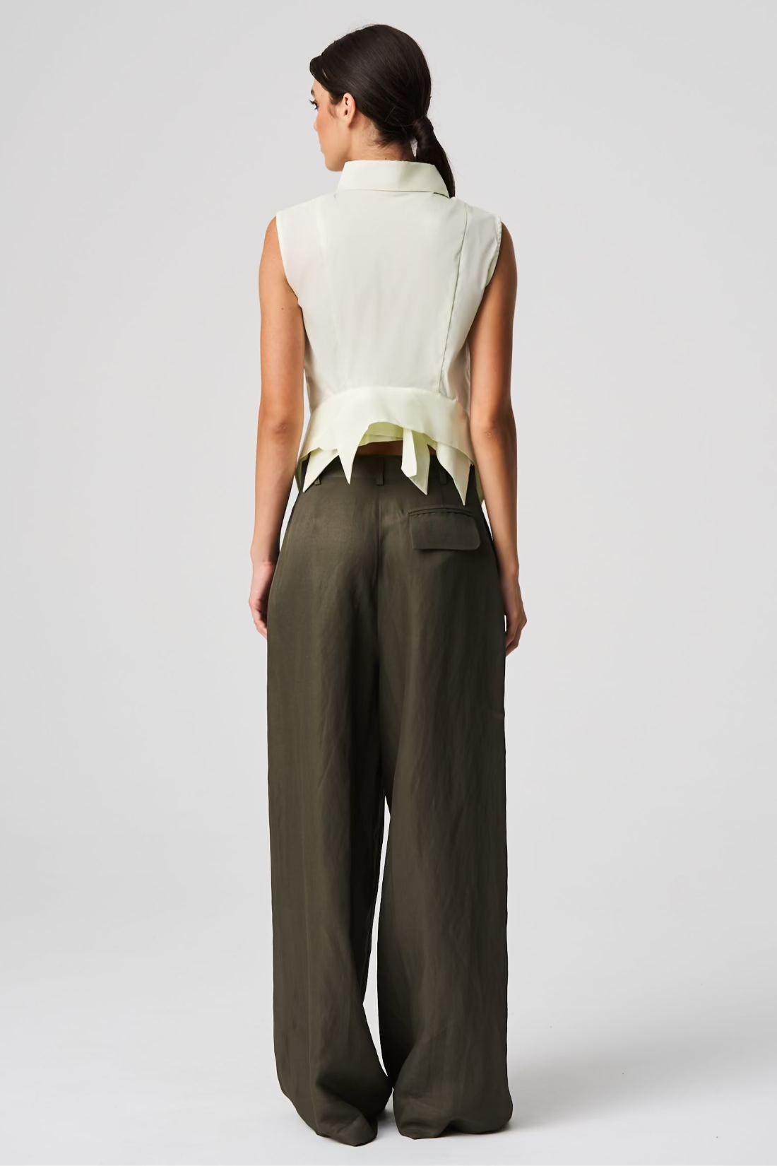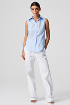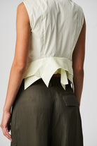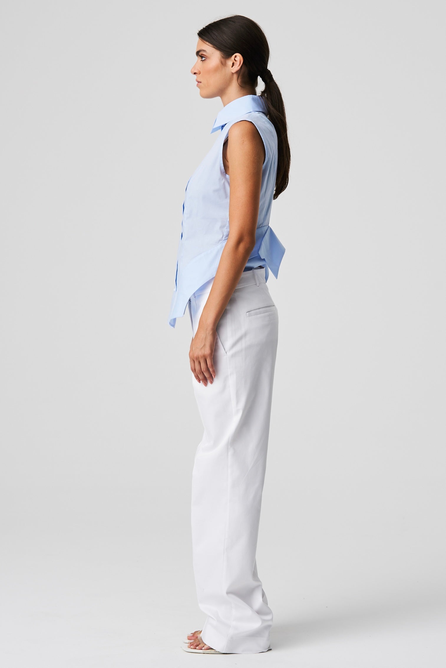 Slim-fit sleeveless shirt with a regular collar. The unique feature of this design is the back: the length reaches the waistline, and the hem is embellished with a double decorative collar, while the front has a clean look with an angled hem.