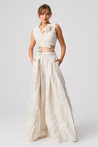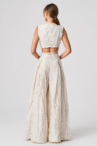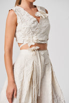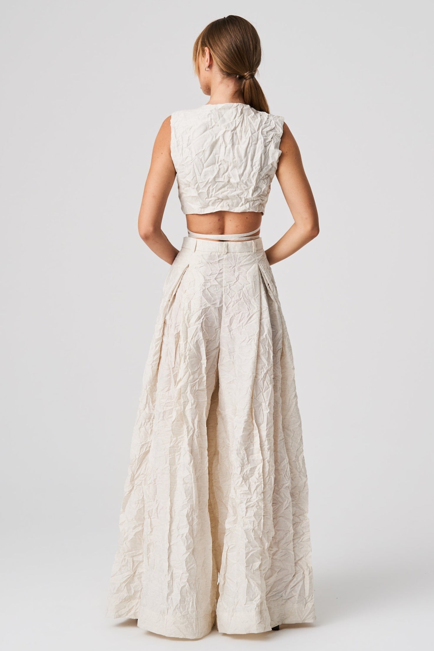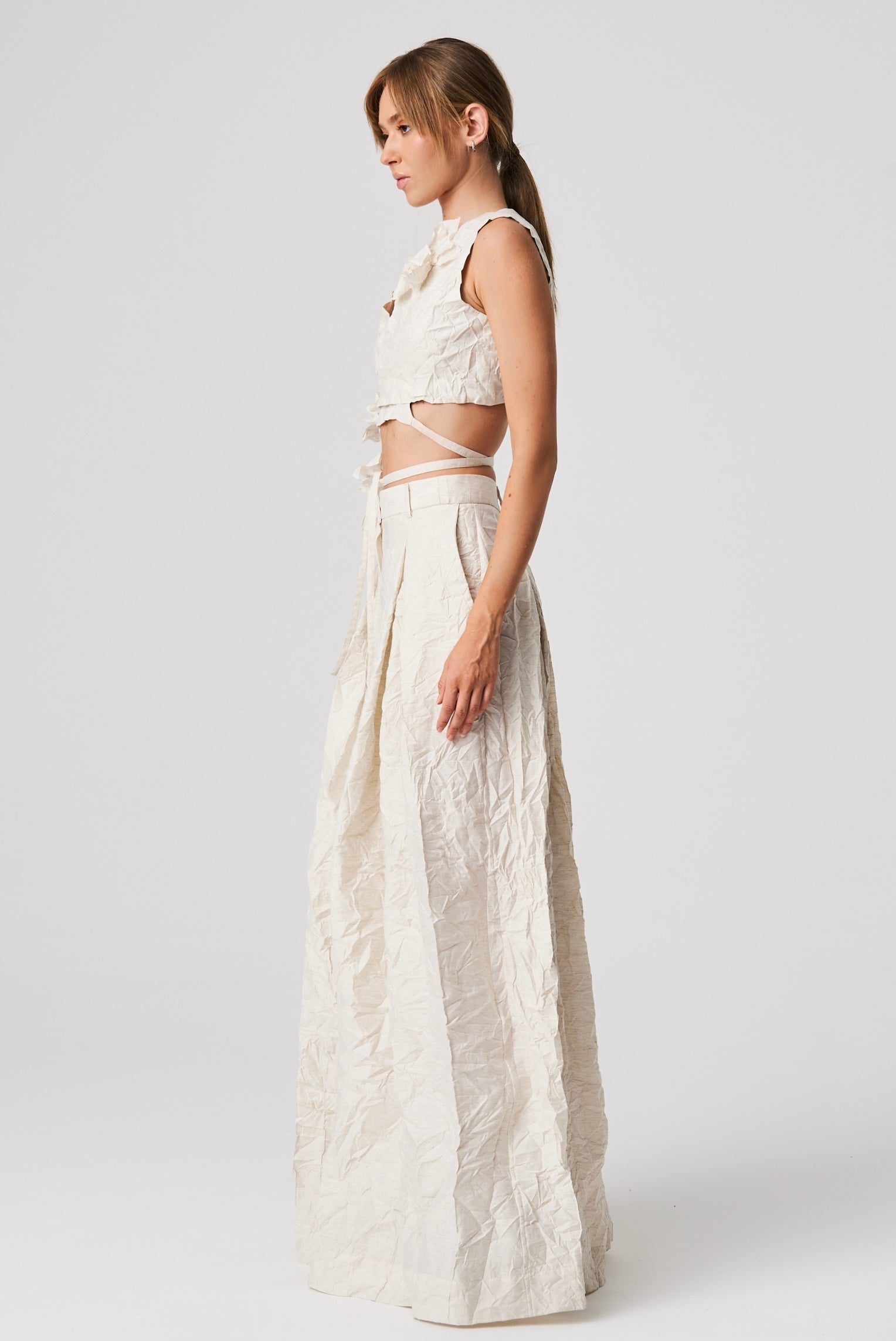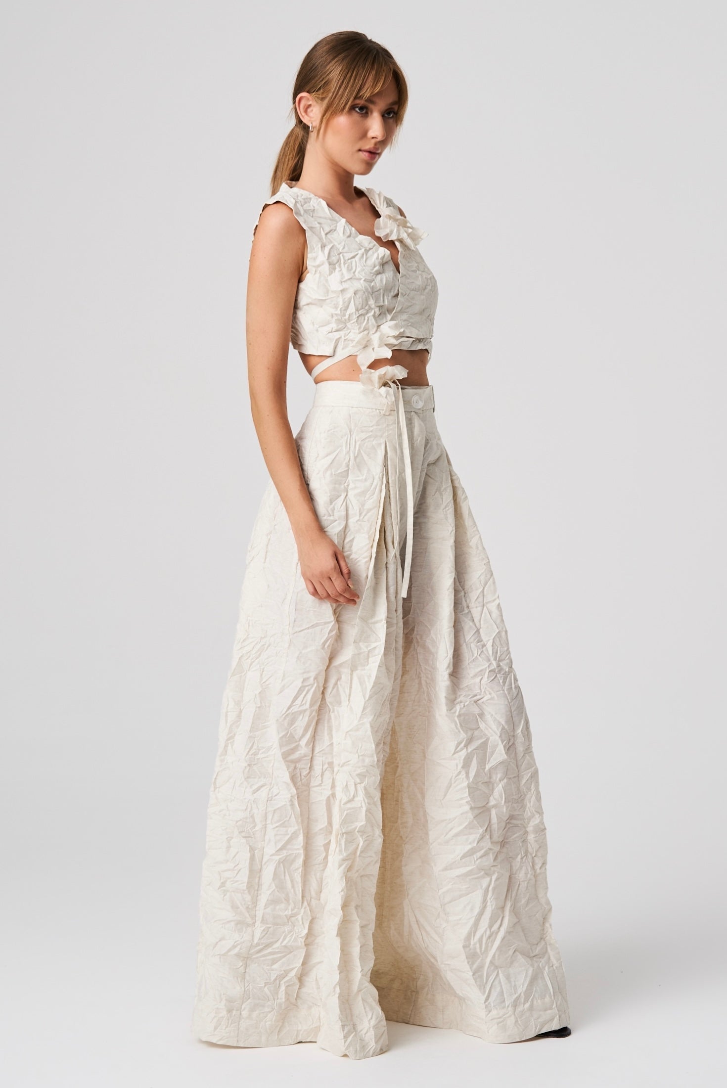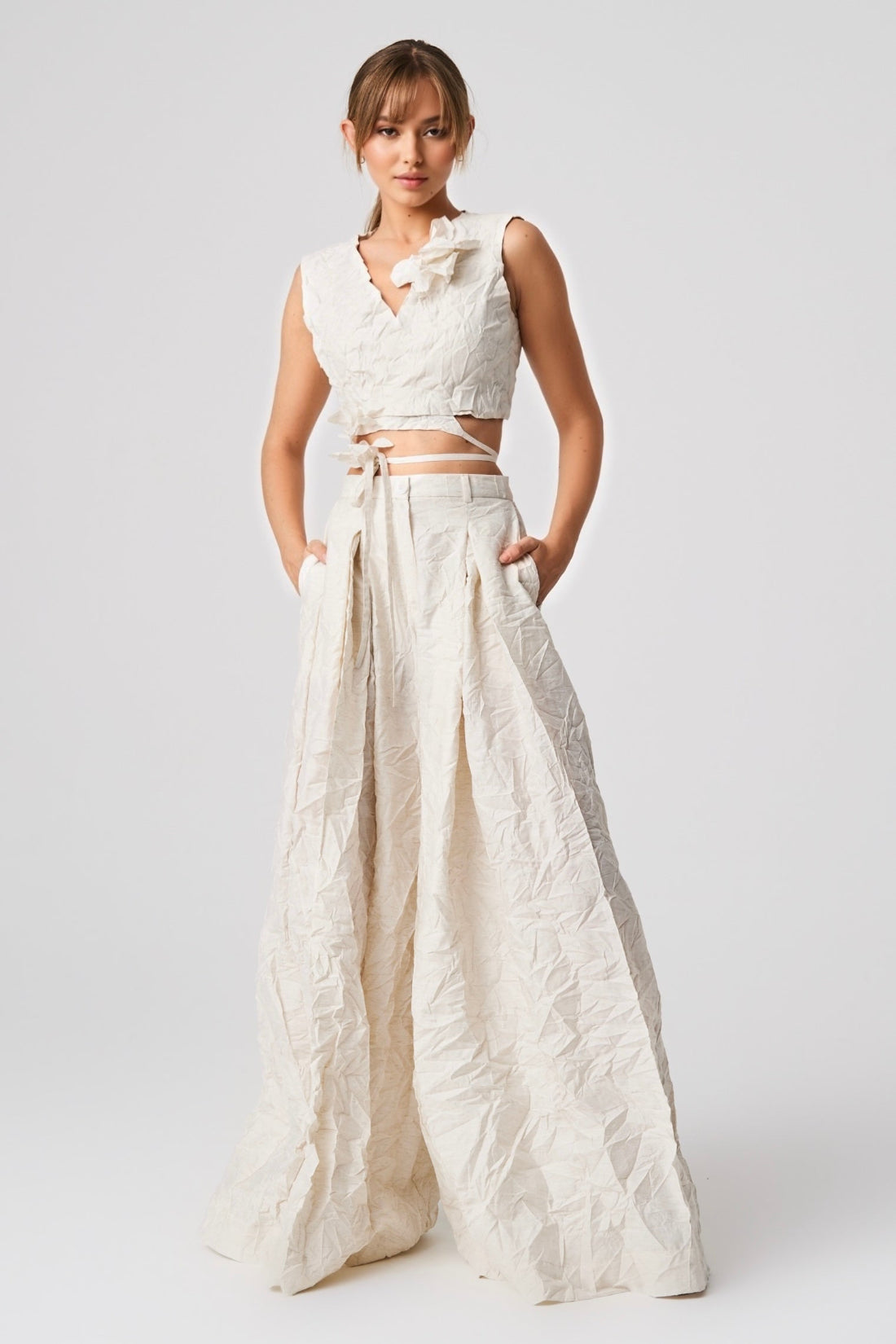 Cropped sleeveless top. The front panels cross over, and a tie wraps around the back and fastens at the front or in any preferred style. The edge of the left side and the tie are embellished with raw-cut fabric flowers in the same material. This piece, made from crinkled, crisp-effect fabric, pairs perfectly with the AURA trousers or the RINA skirt.