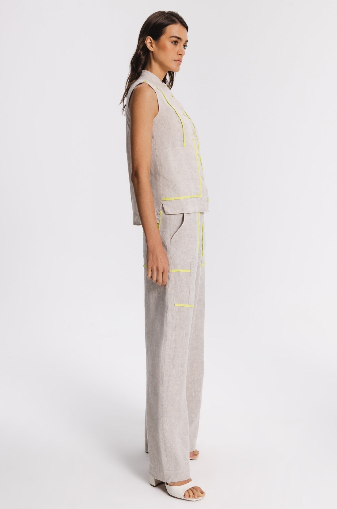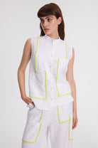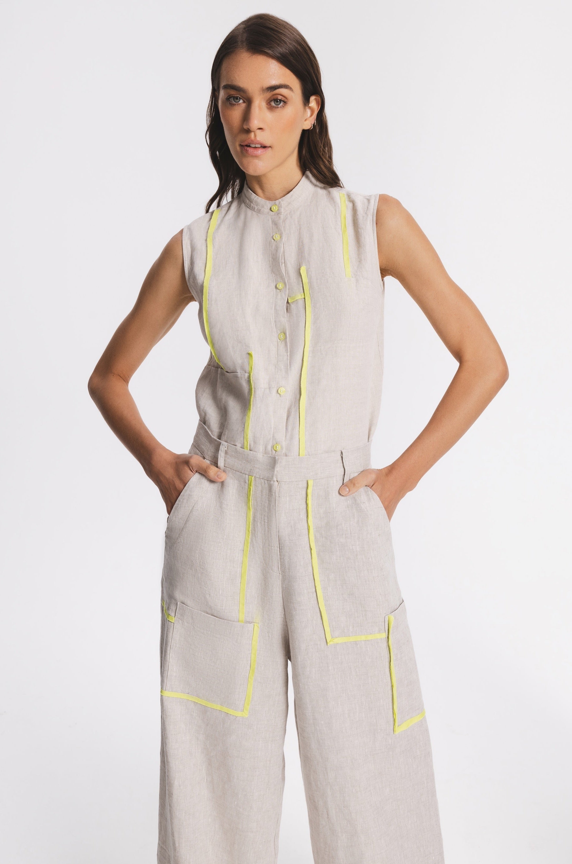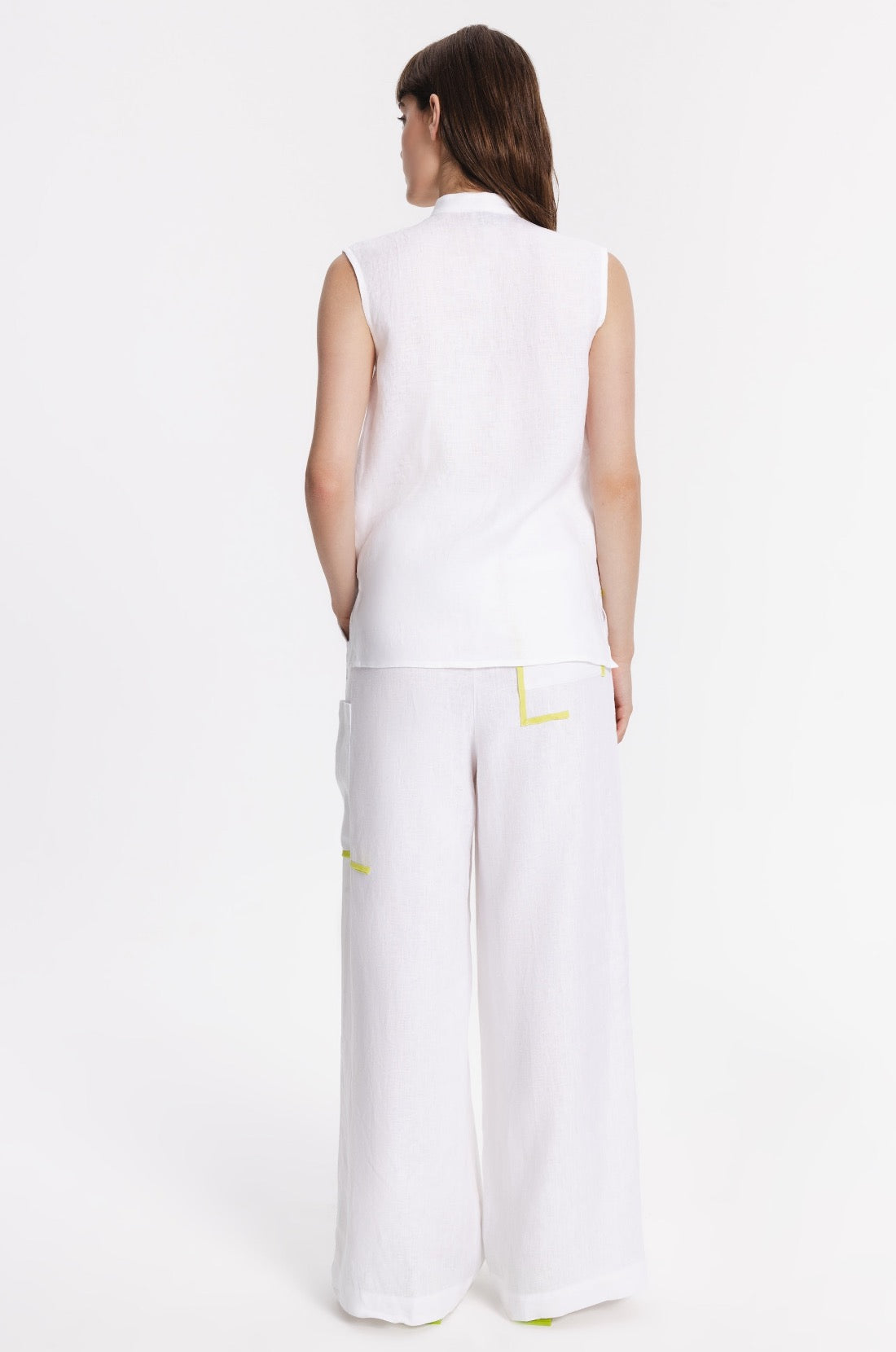 Slim-fit sleeveless linen shirt with the decorative contrasting tapes and contrasting color buttons. Korean collar, asymmetrical hem.