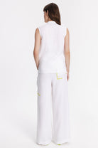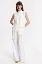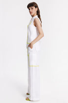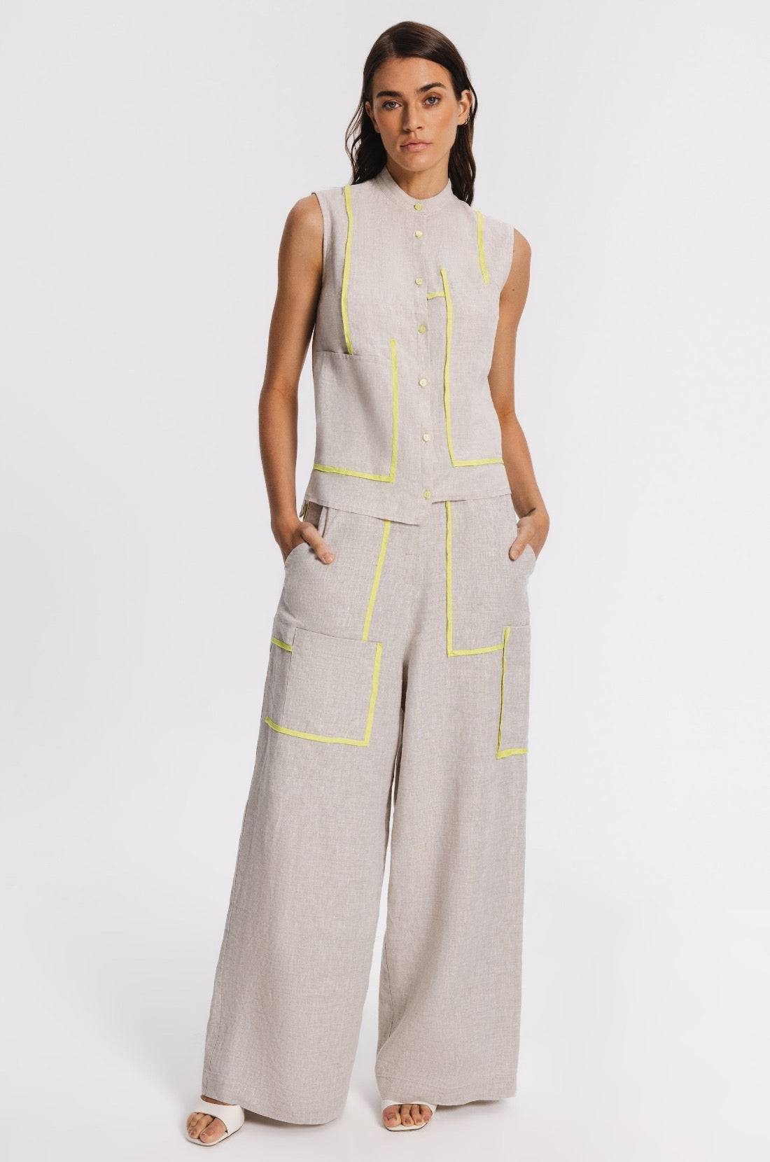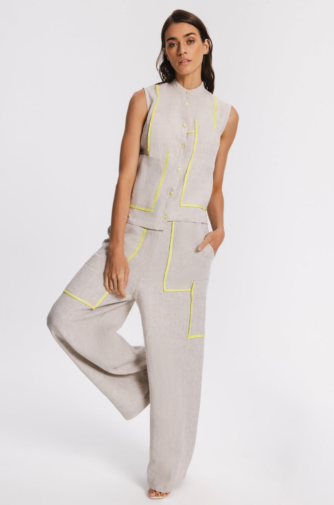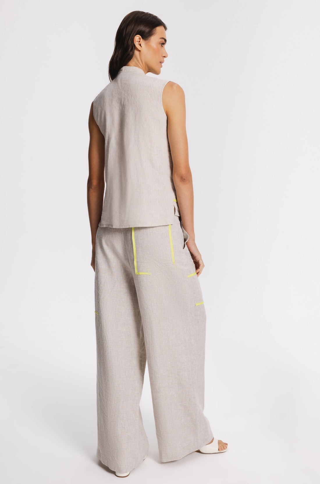 Slim-fit sleeveless linen shirt with the decorative contrasting tapes and contrasting color buttons. Korean collar, asymmetrical hem.